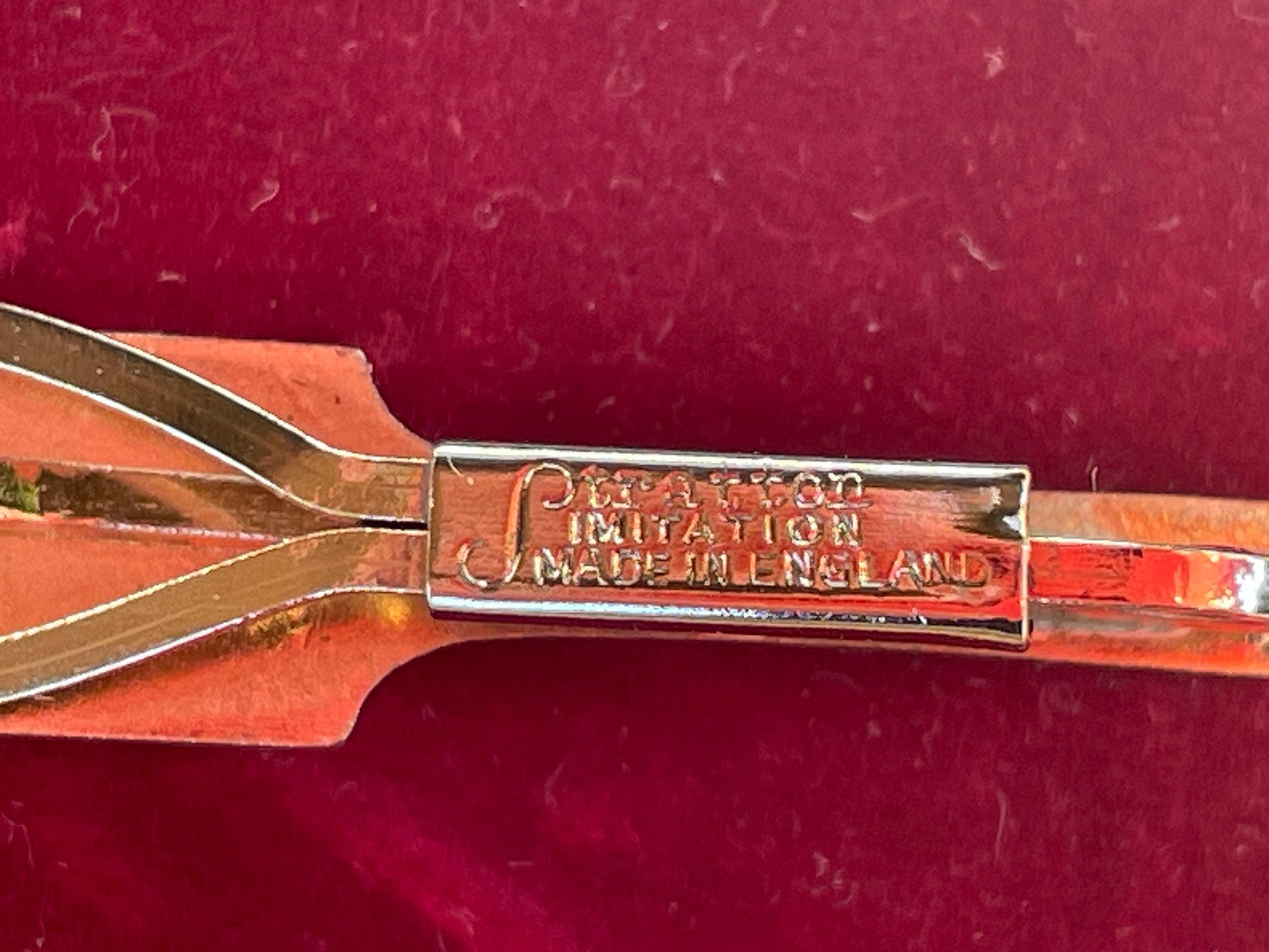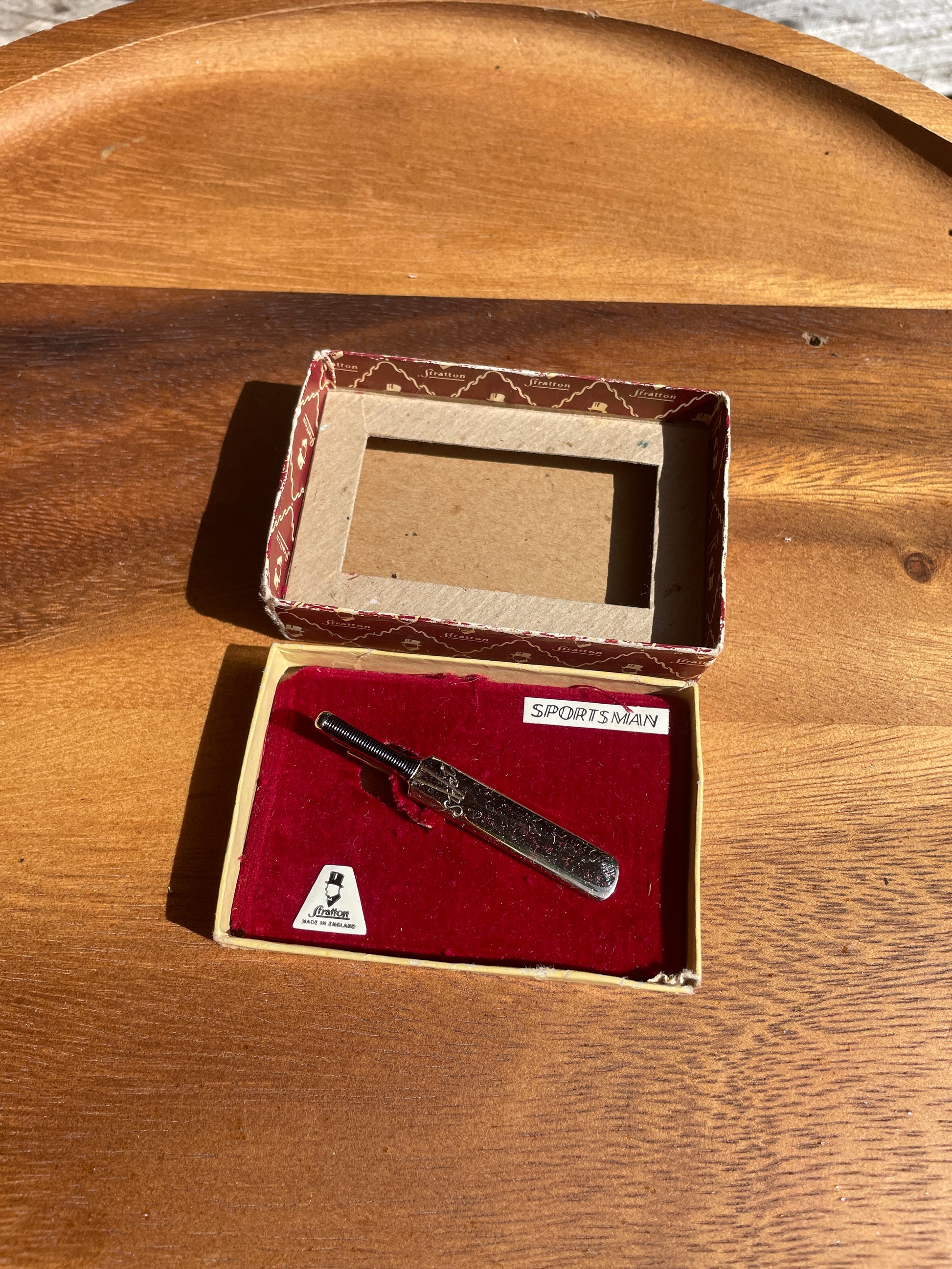 A fantastic vintage Stratton tie clip from the classic Sportsman series, dating to the 1950s–60s and made in England. This collectible men’s accessory is shaped like a cricket bat, with the word “STRAT” engraved on the front and “Stratton IMITATION MADE IN ENGLAND” marked on the reverse clip bar.