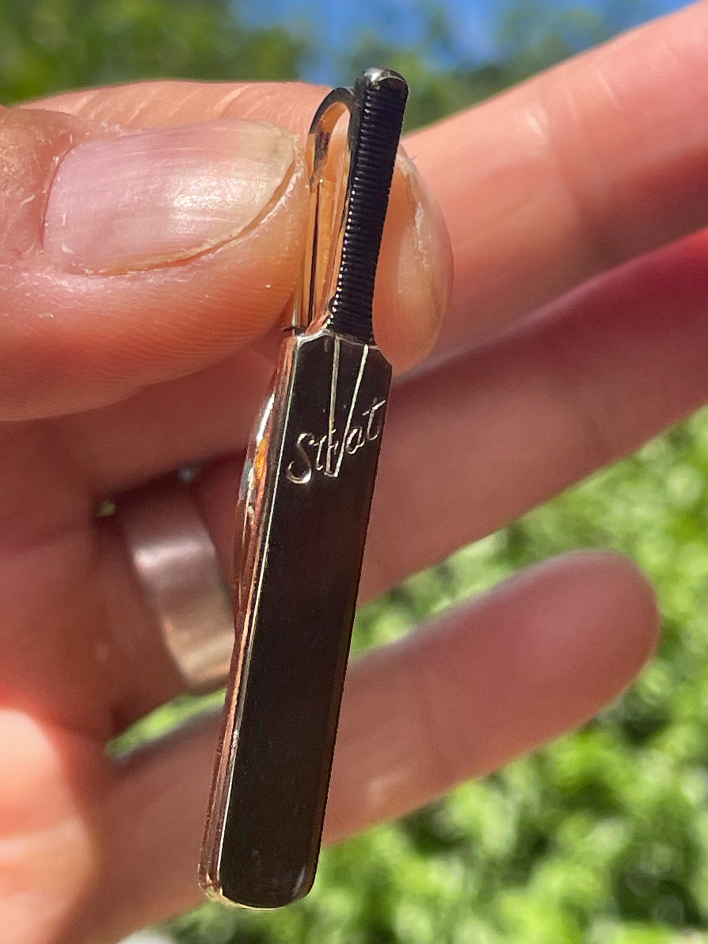 Crafted in gold-tone metal with a black enamel-effect handle, it’s housed in its original Stratton presentation box with red velvet interior and branded lining. A brilliant gift for cricket fans, vintage collectors, or as a stylish nod to British sporting heritage.