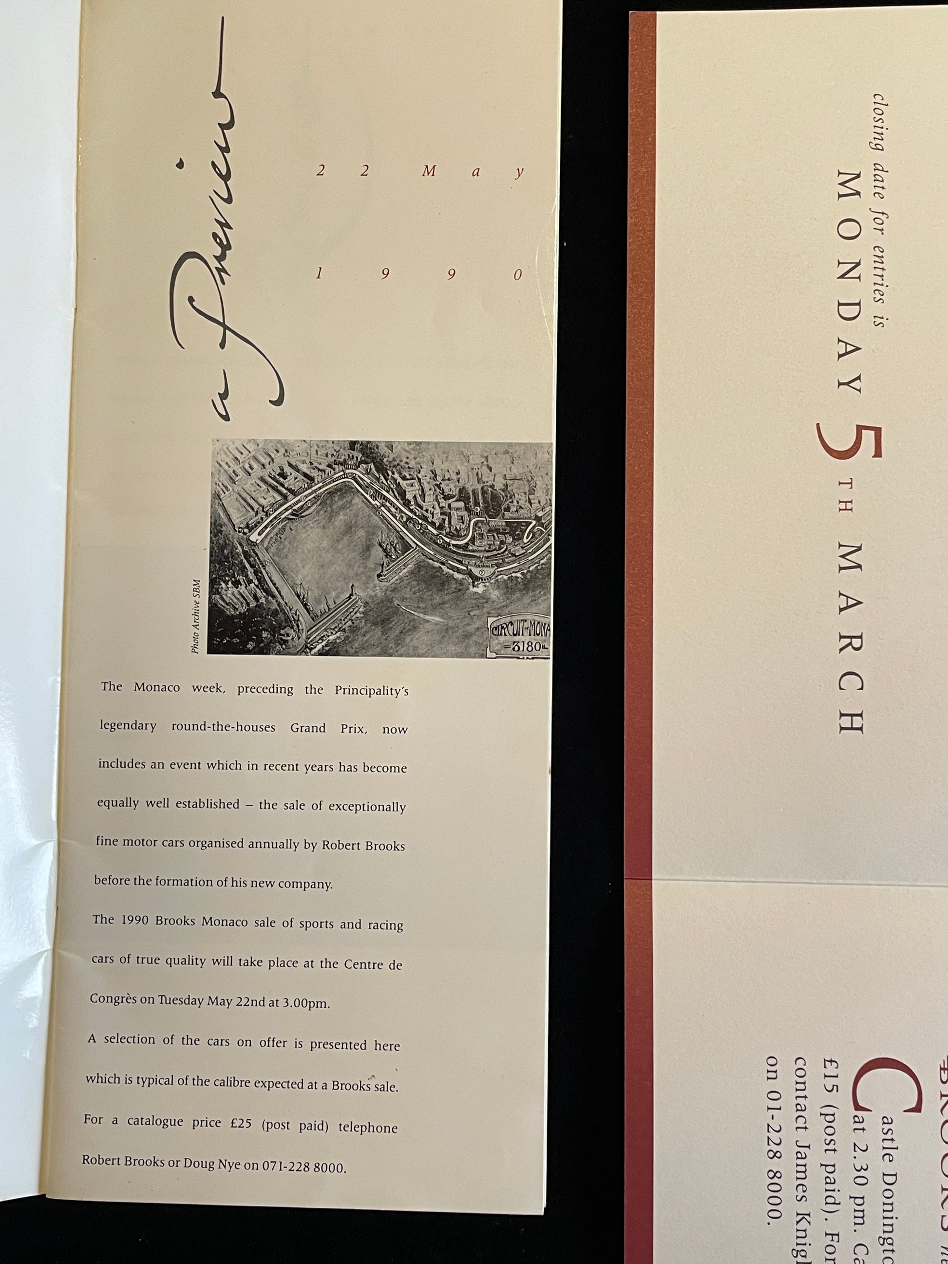 'The sale of sports and racing cars of true quality' sale, held in Monaco at the Centre de Congres May 1990 is a big deal in the automobile auction calendar and this is the booklet to accompany the event as is the Donnington sale held at the famous Castle Donnington race track.