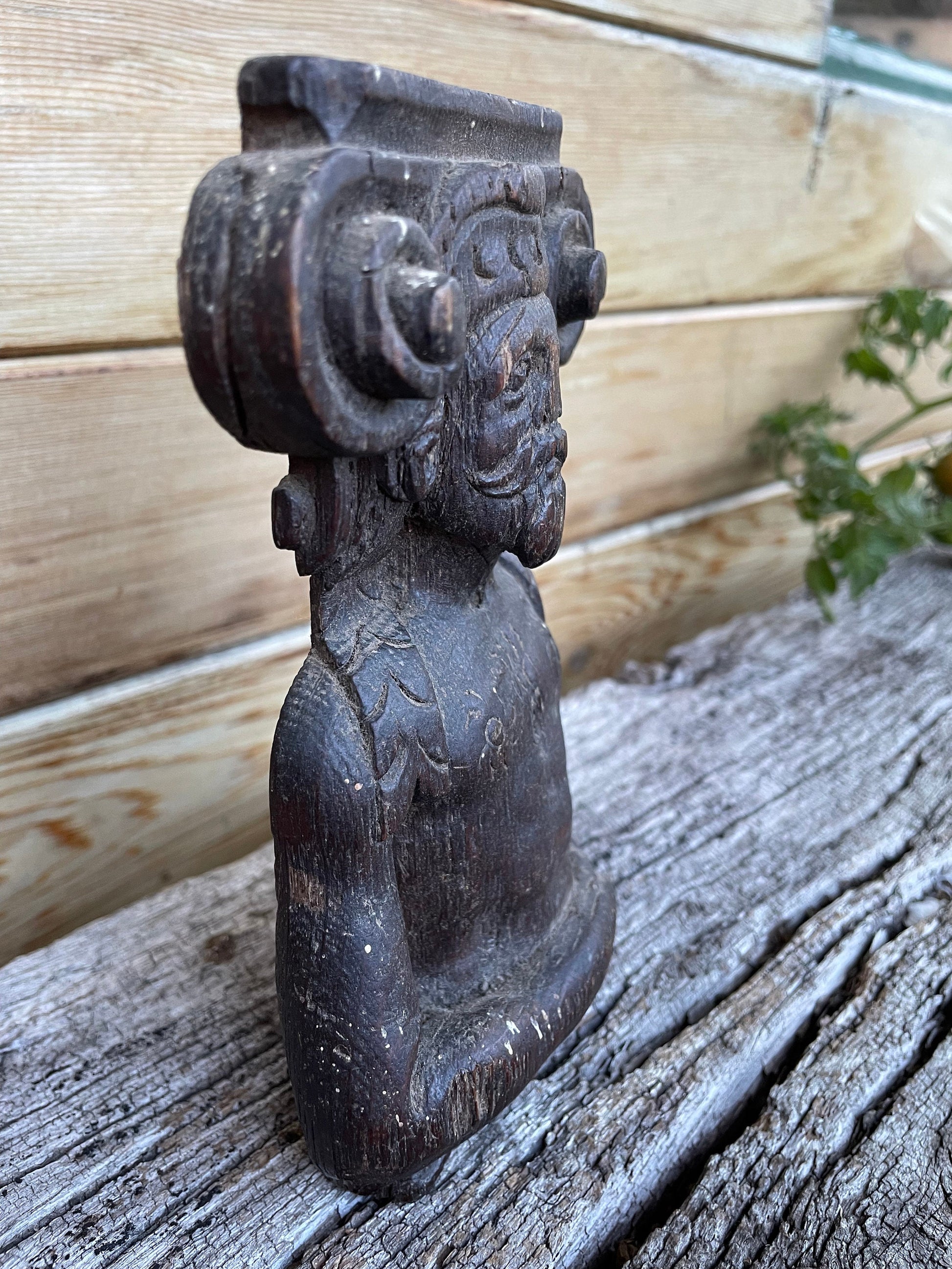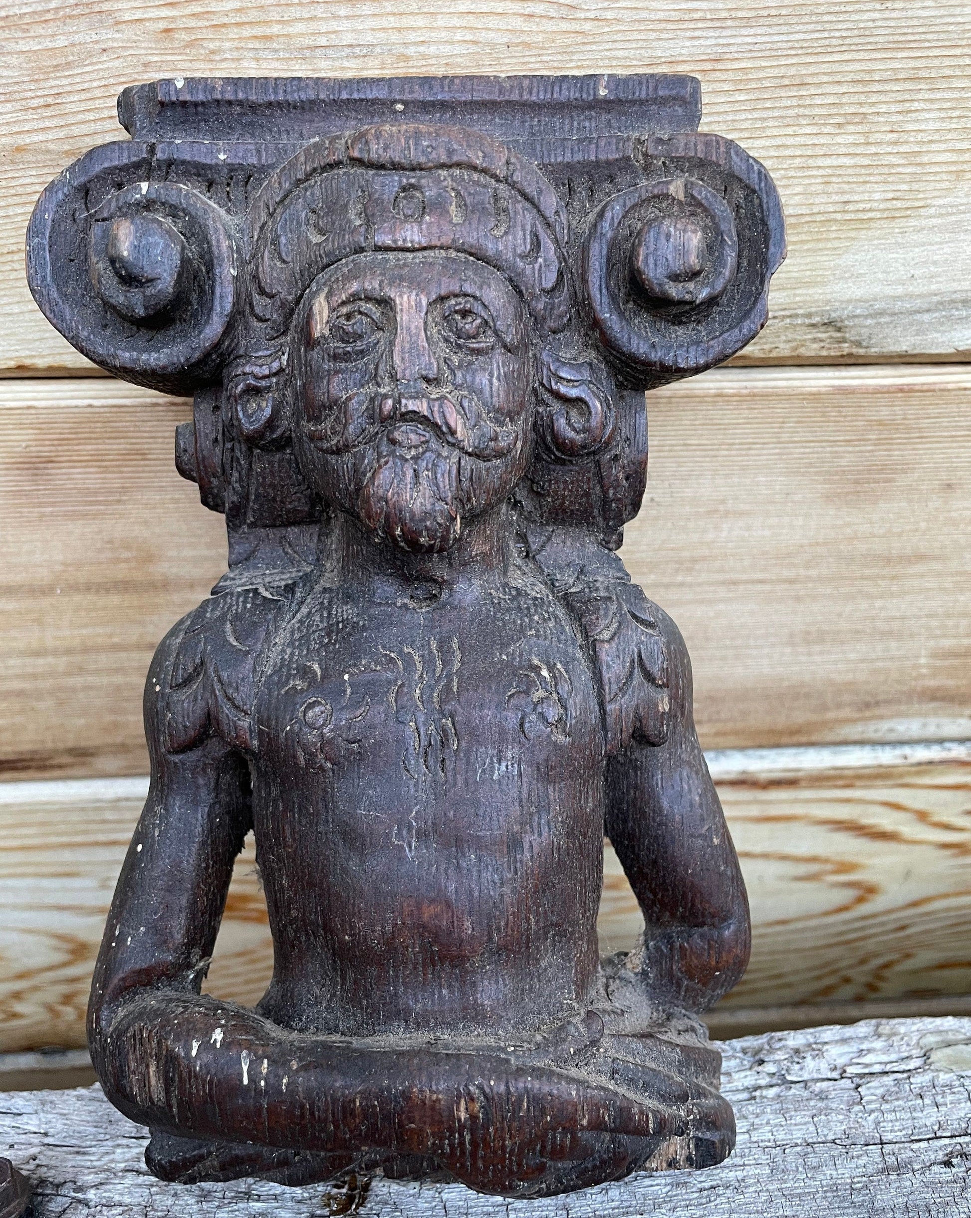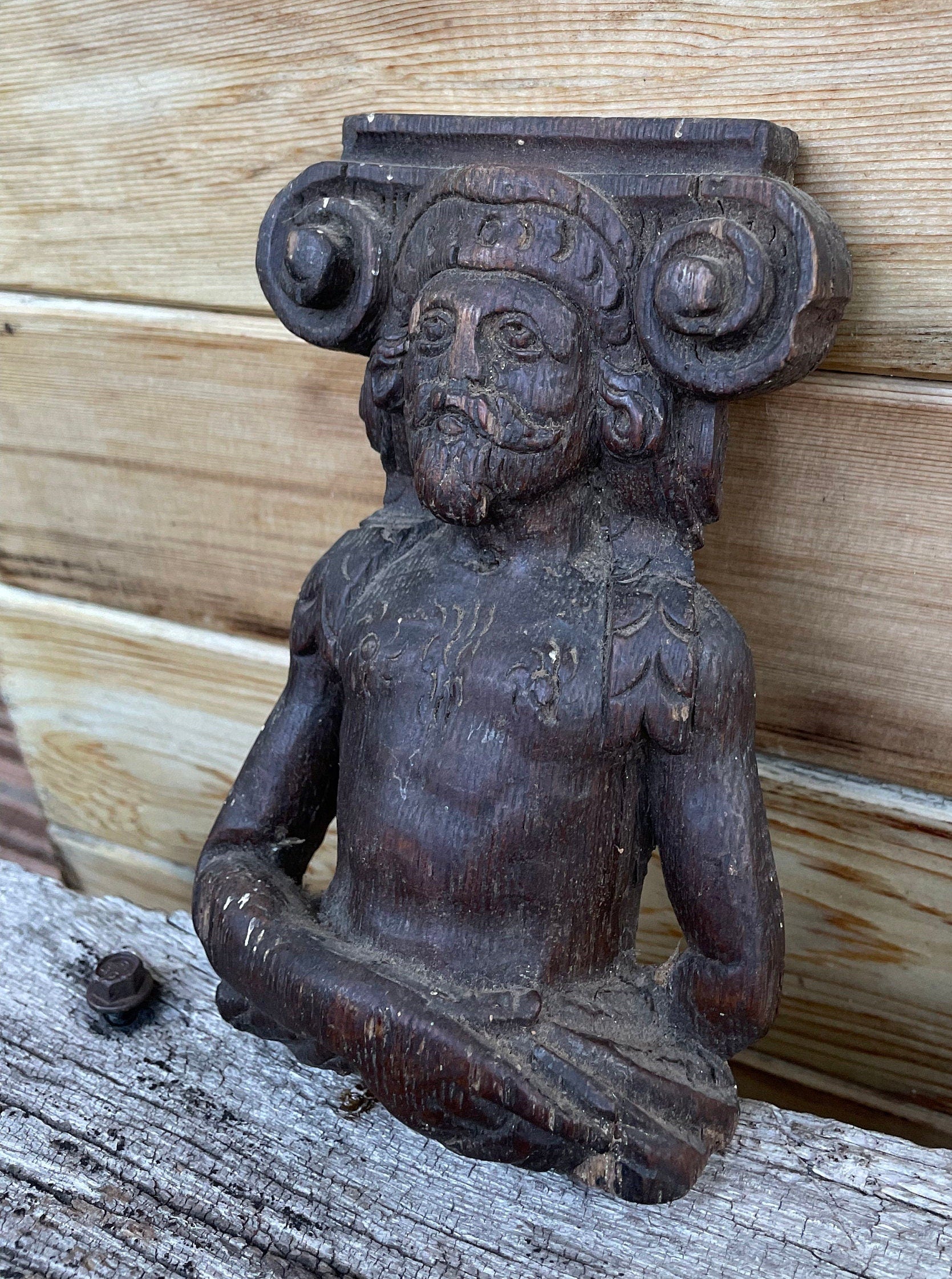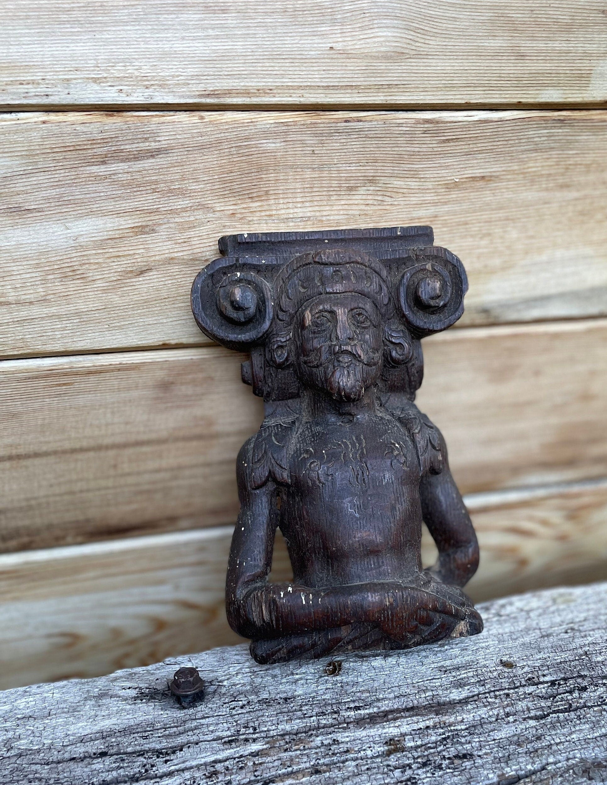 This piece is unique, a survivor and pretty special - The carver of this piece knew his craft and was very good at it - The origin of this piece is unknown but likely from a very old piece of furniture, wall panelling or simply a stand a lone carved figural decorative piece - this adds to the mystery