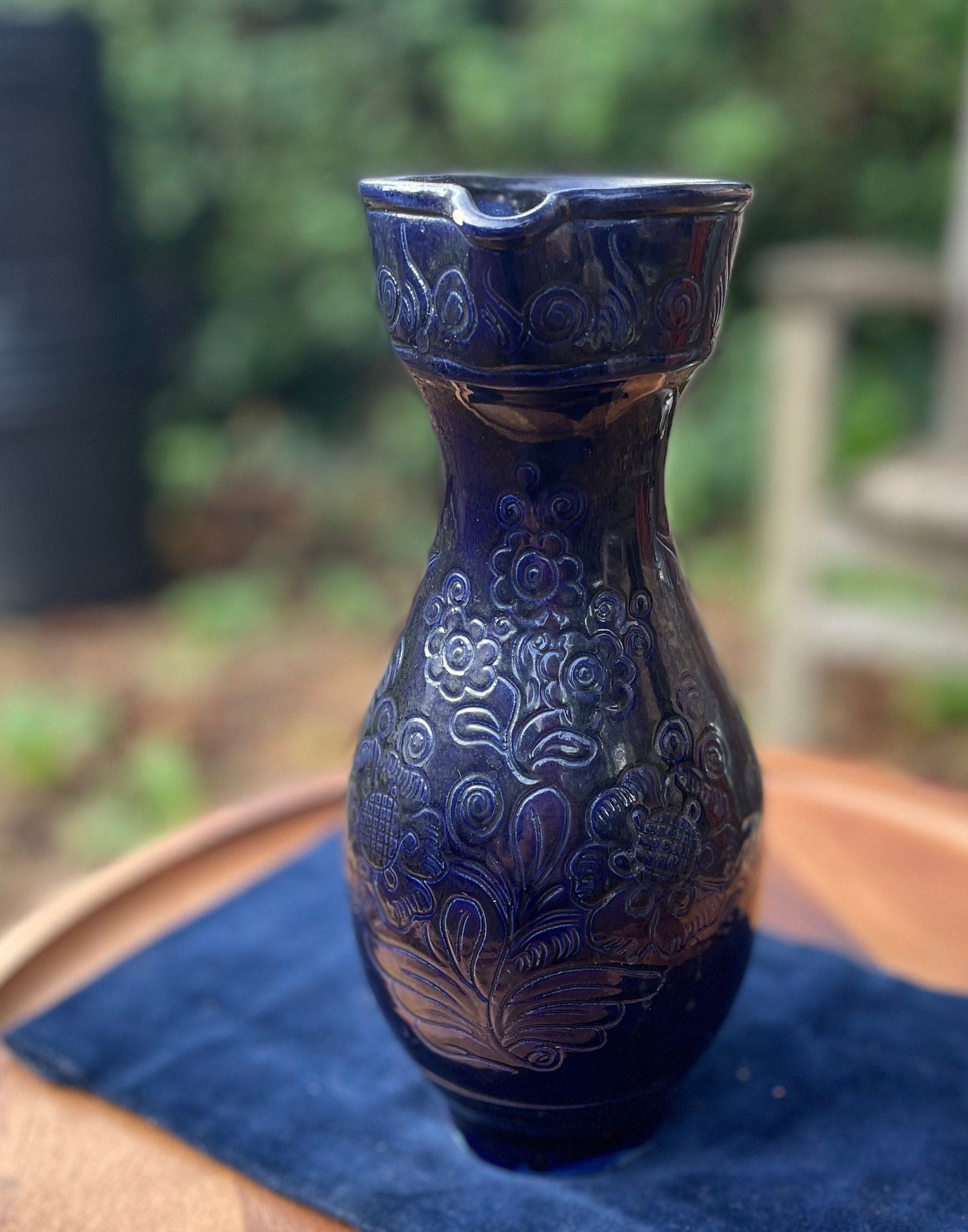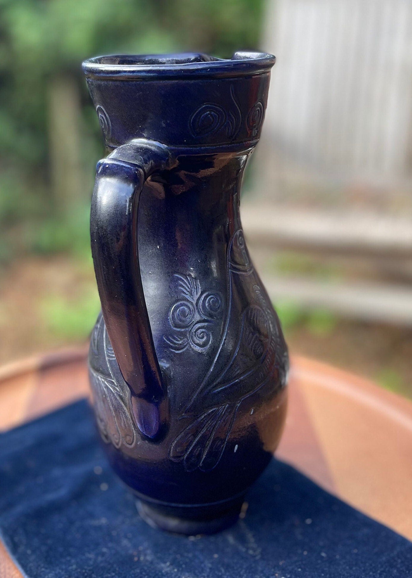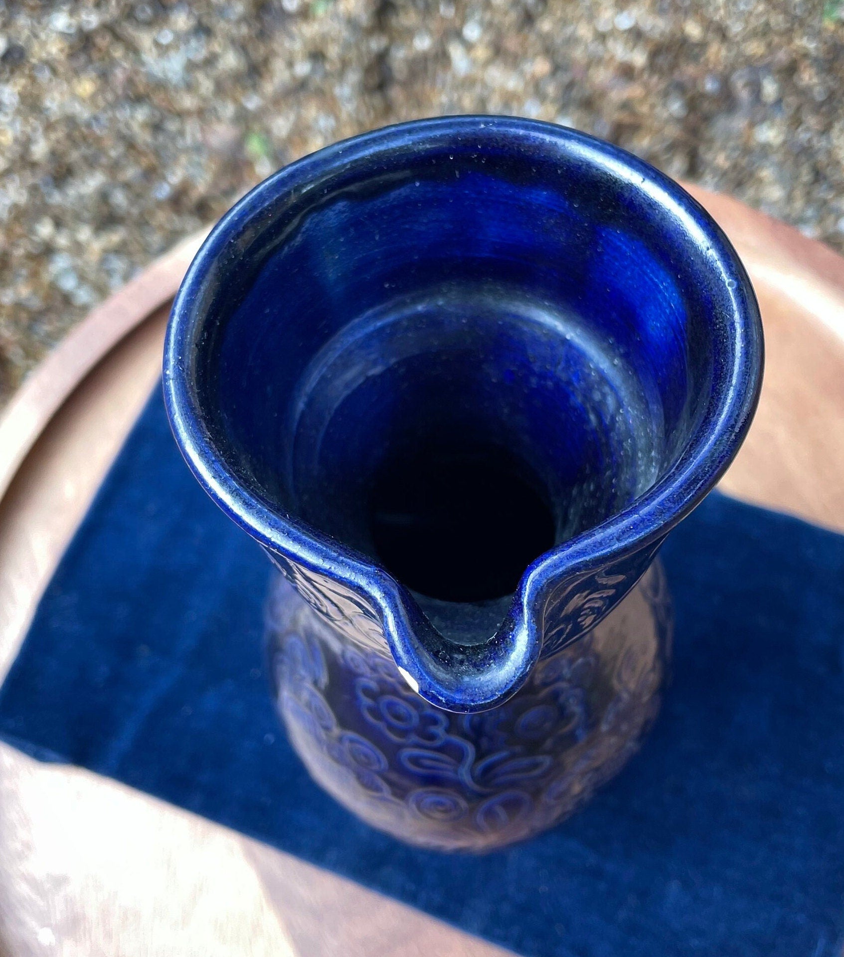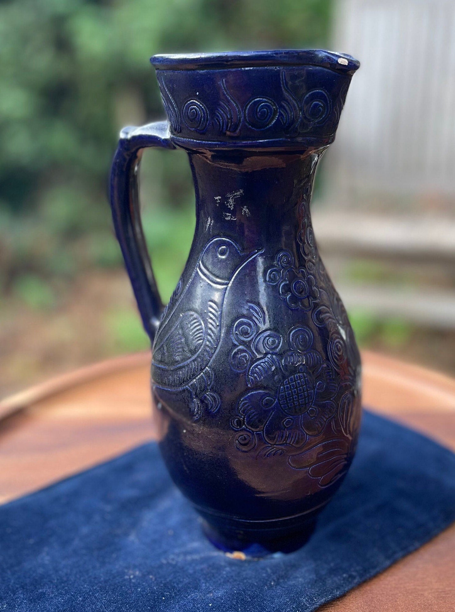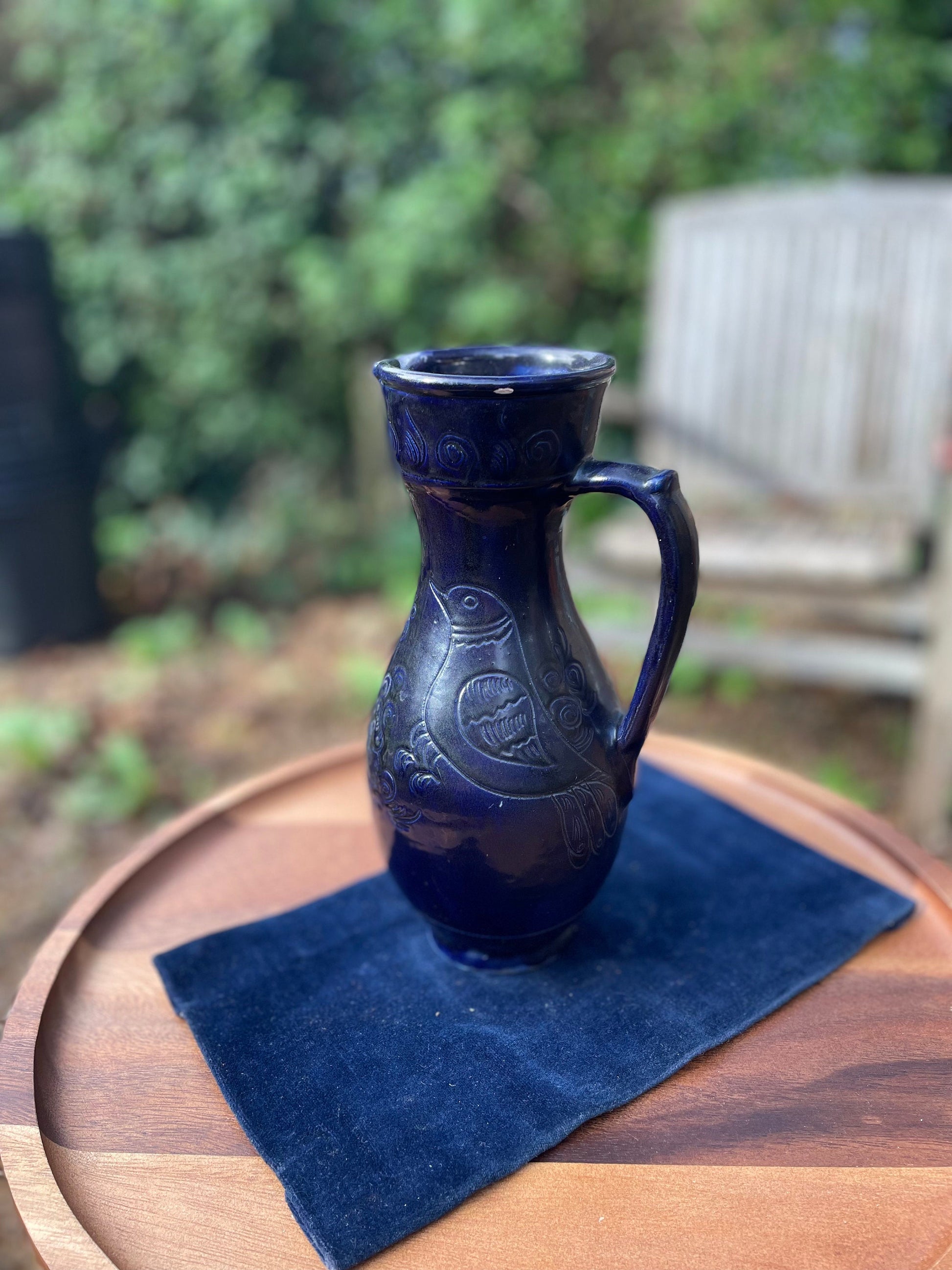 A Blue Vintage Glazed Studio Pottery Jug With Stylised Bird and Floral Design c1960 23cm Tall
