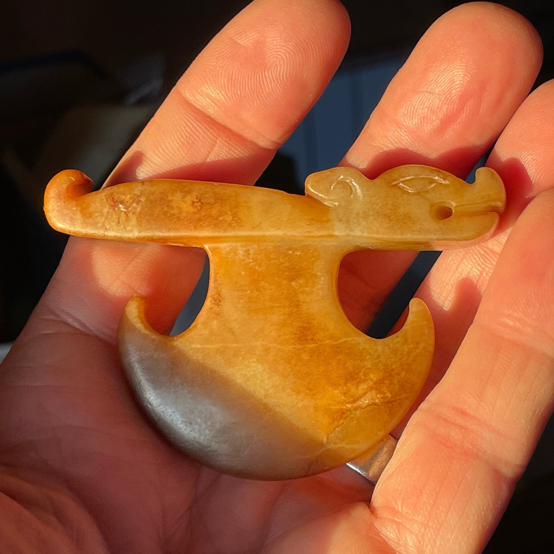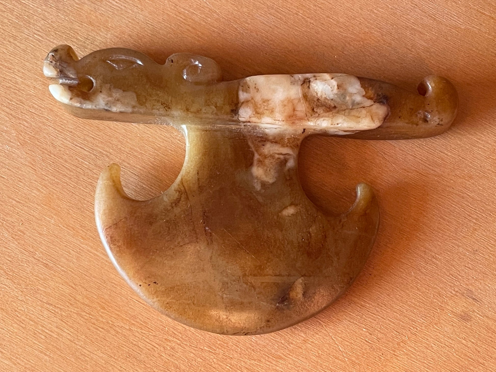 Here we have a Chinese Archaistic hardstone Carving 7.5x5cm - Perhaps a ceremonial axe with the head of a Chinese Mythical creature carved into it