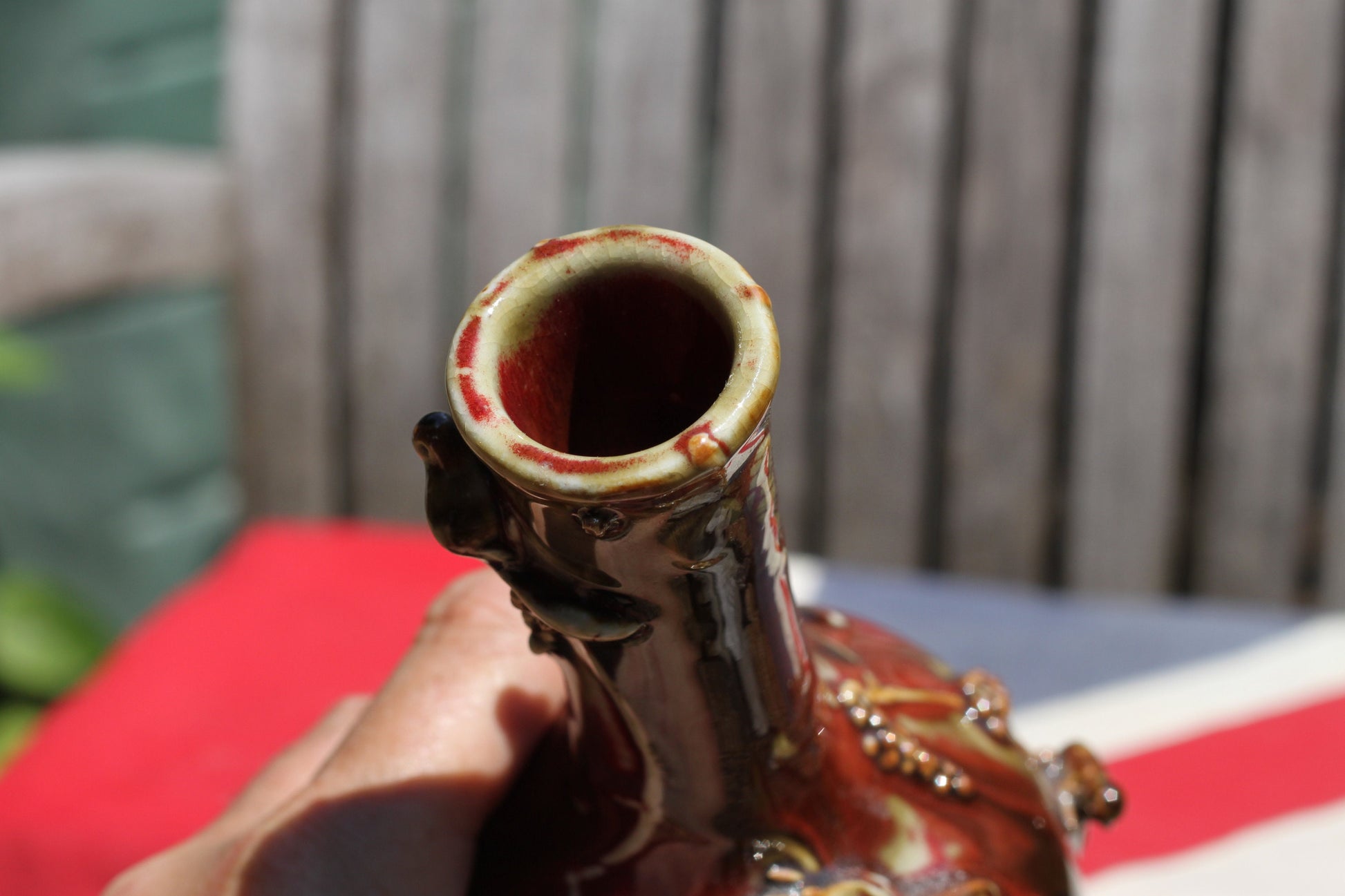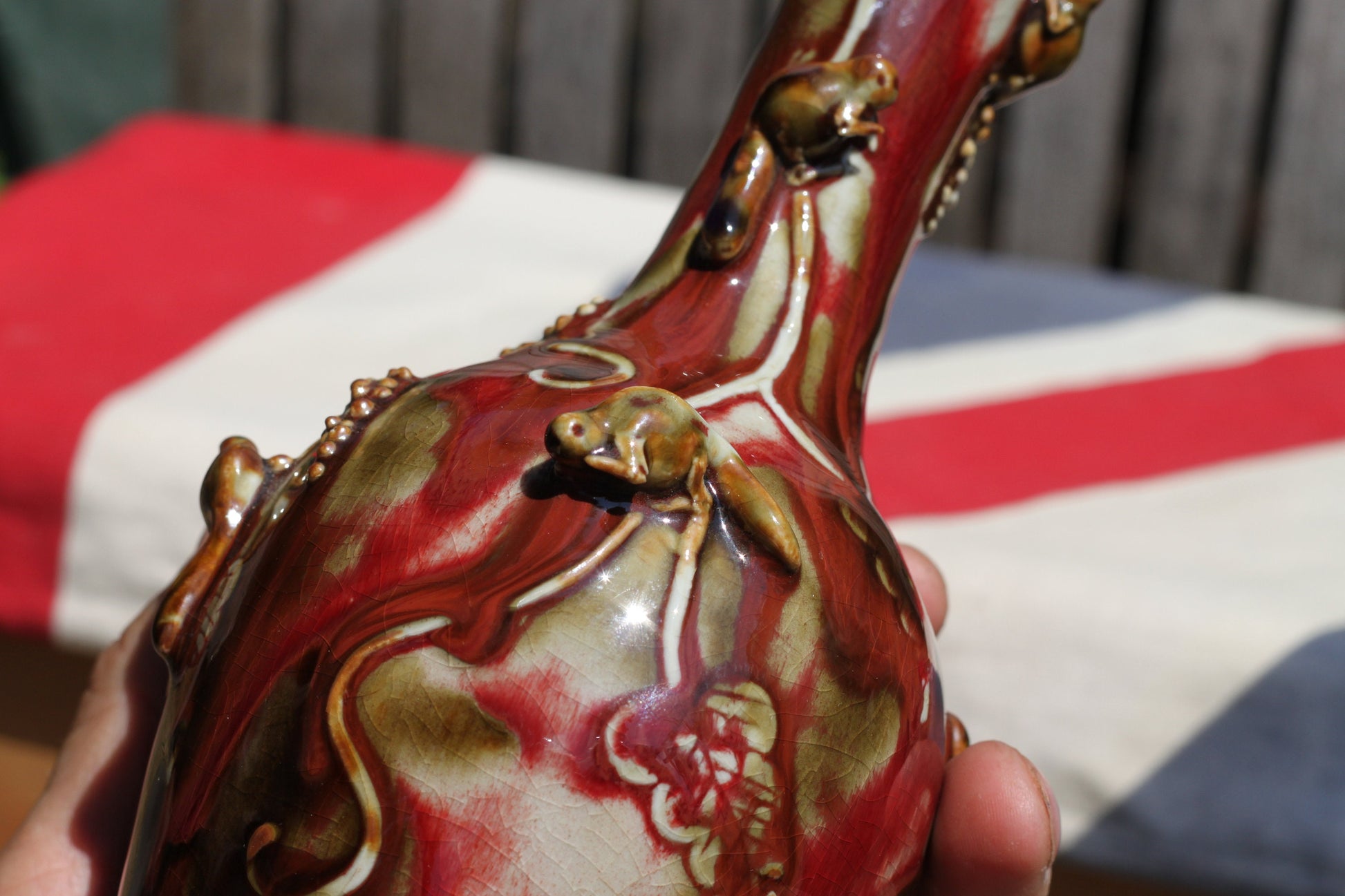 Here we have a Chinese flambe vase decorated with small creatures climbing a vine 22cm tall