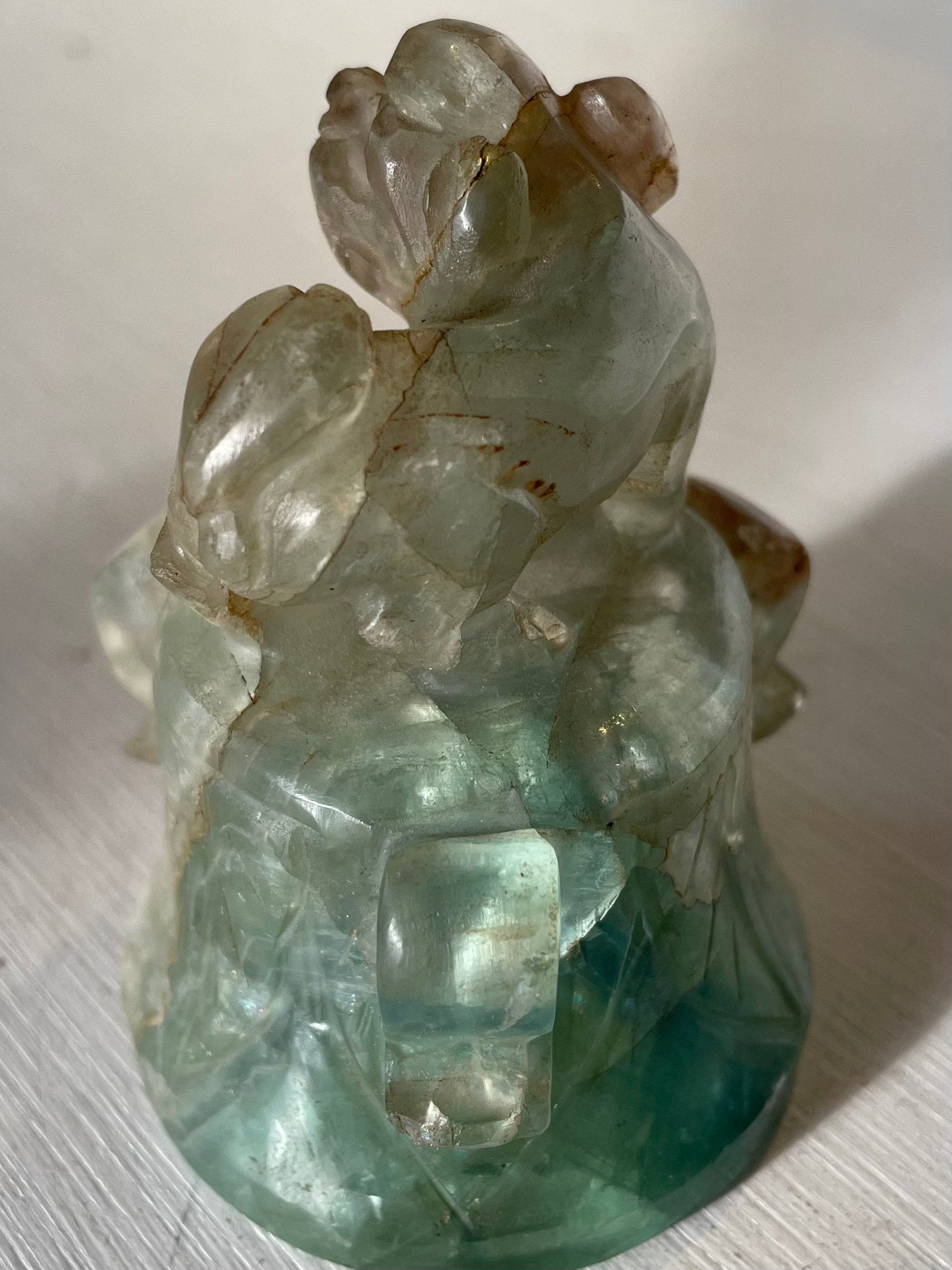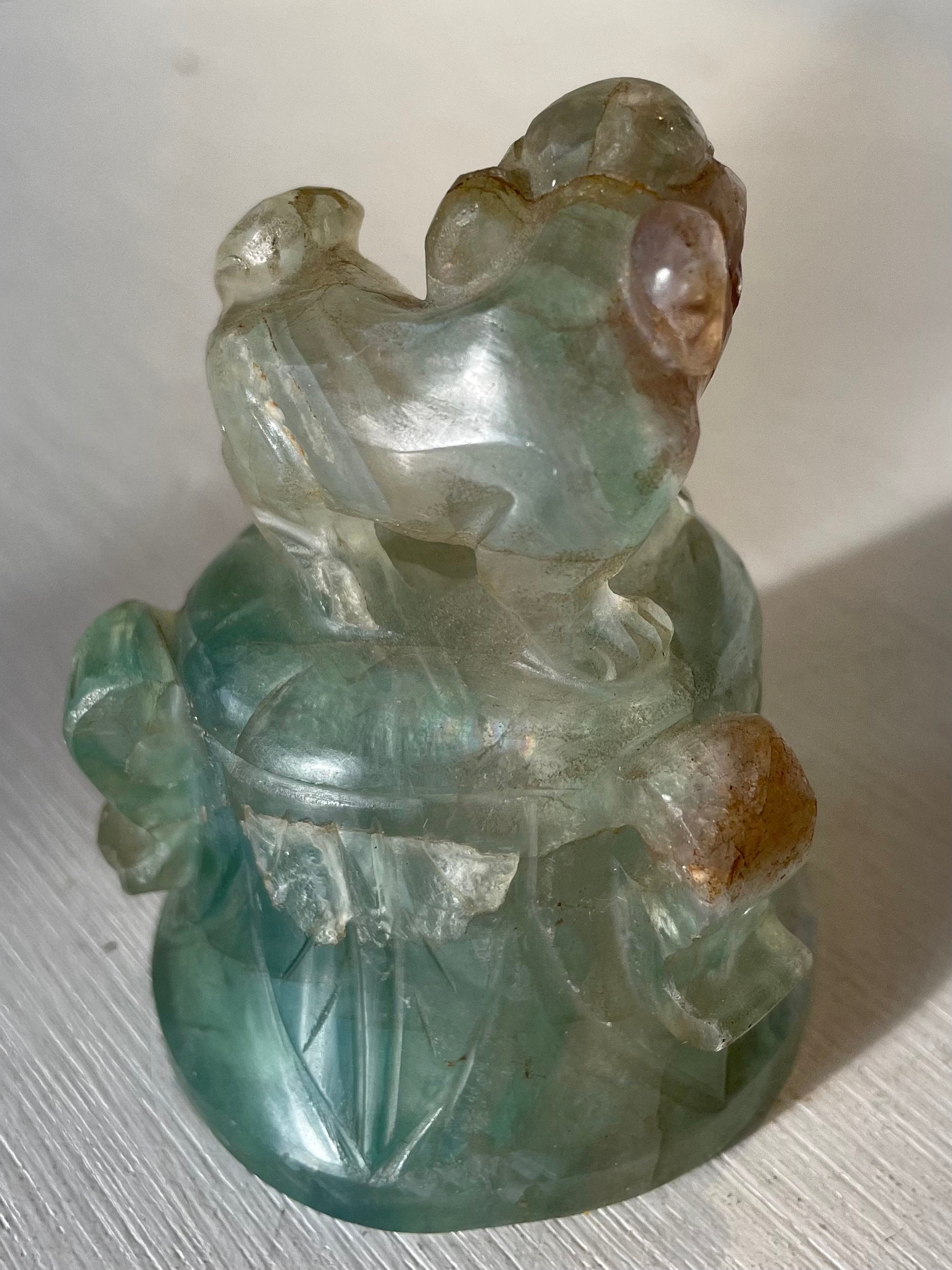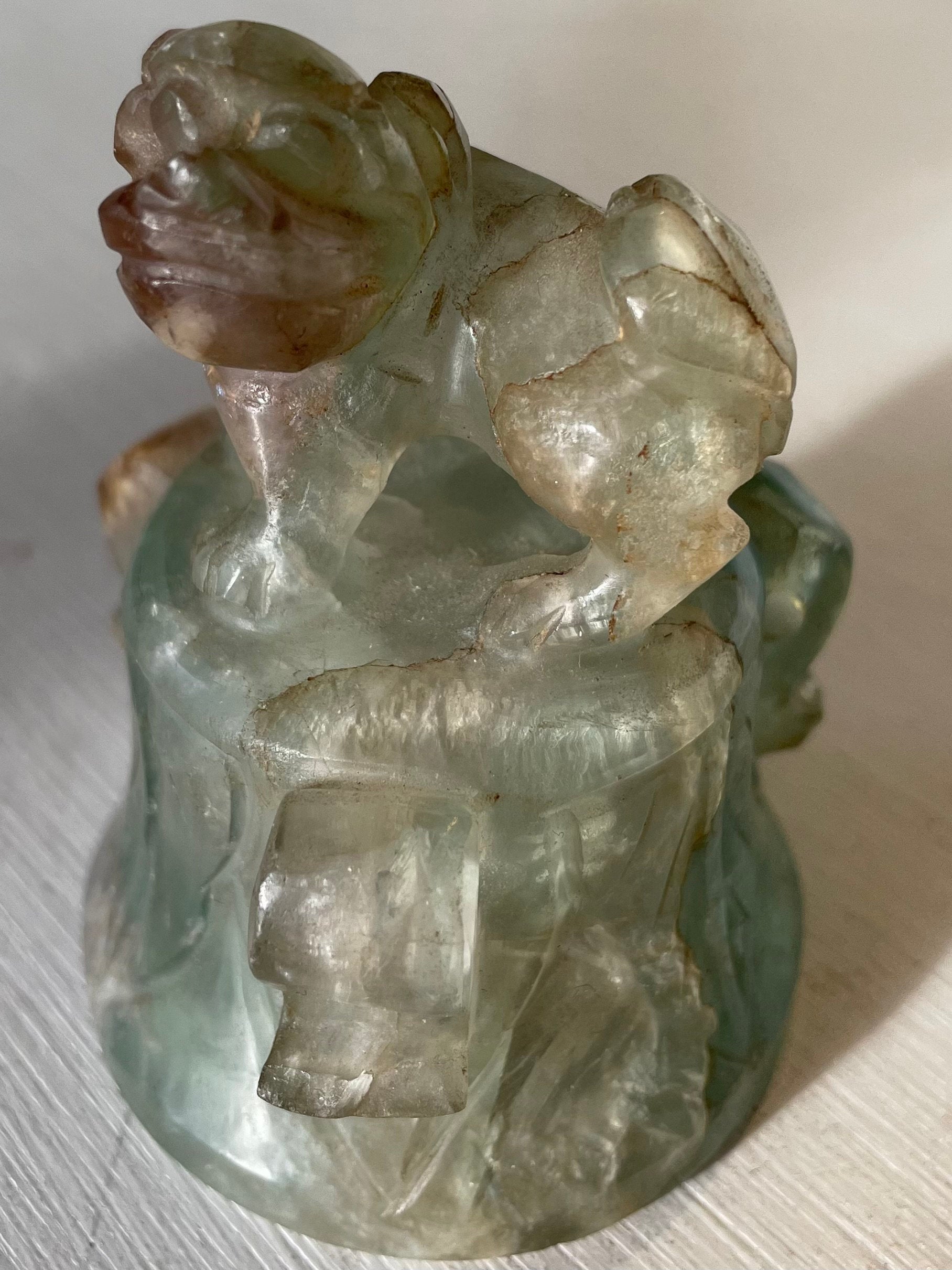 This is a good example of a Chinese fluorite carving of an Archaic style bell with a Foo Dog on top