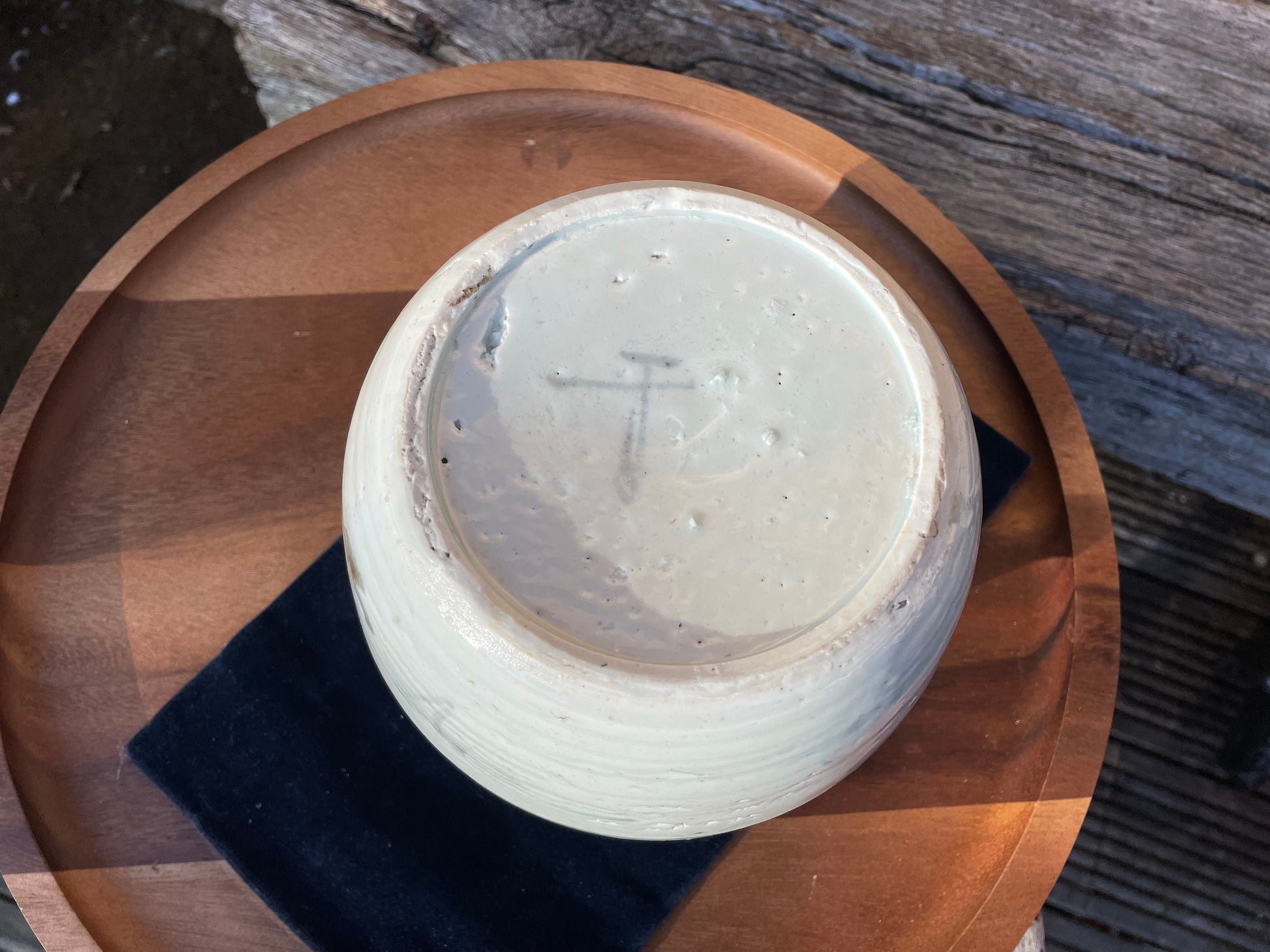 This piece has the look - reminiscent of 17th century Chinese work vases . This is a studio piece with a lovely smooth central glaze - unglazed foot rim and collar