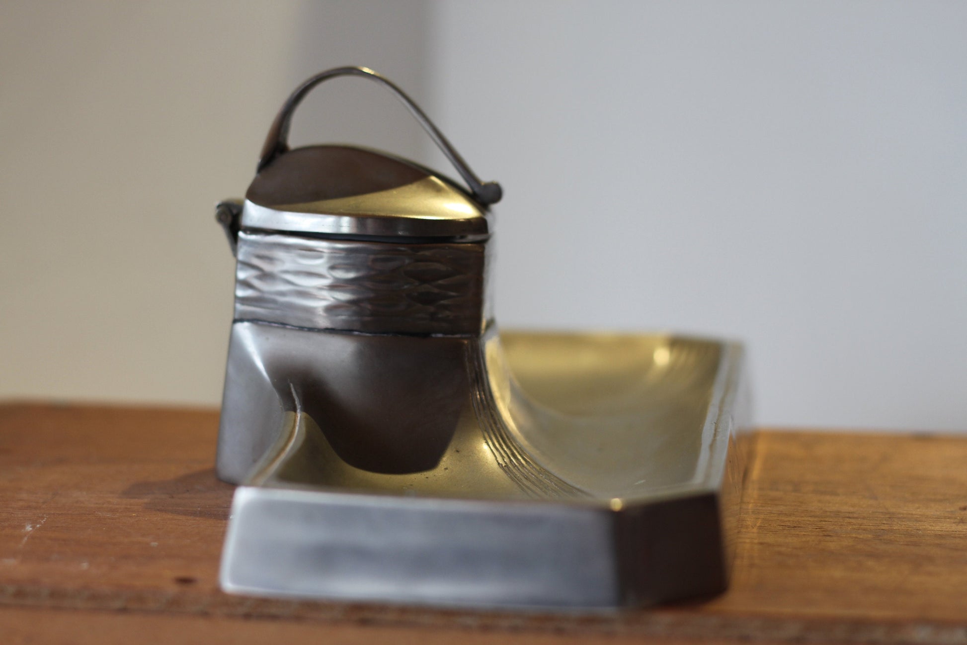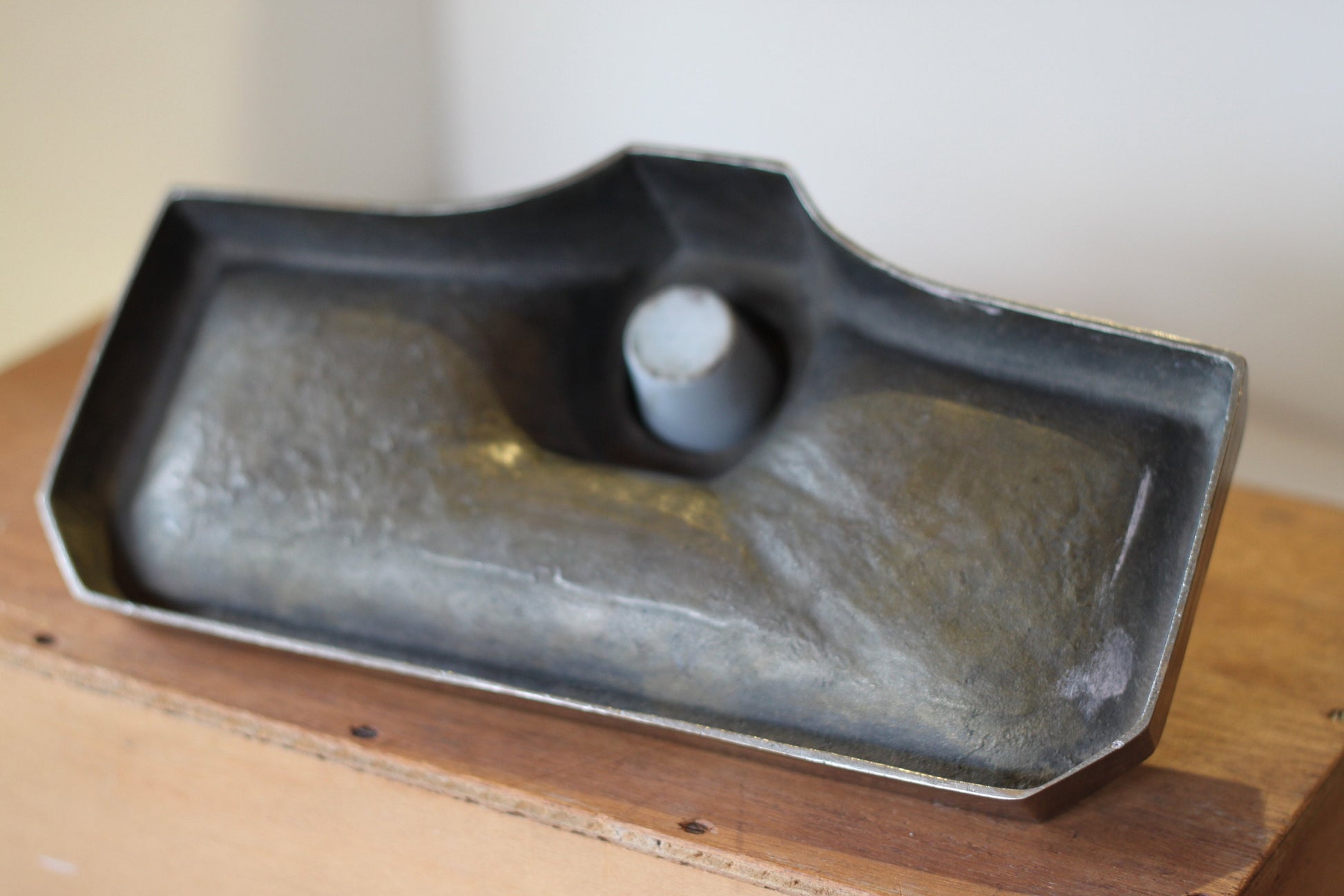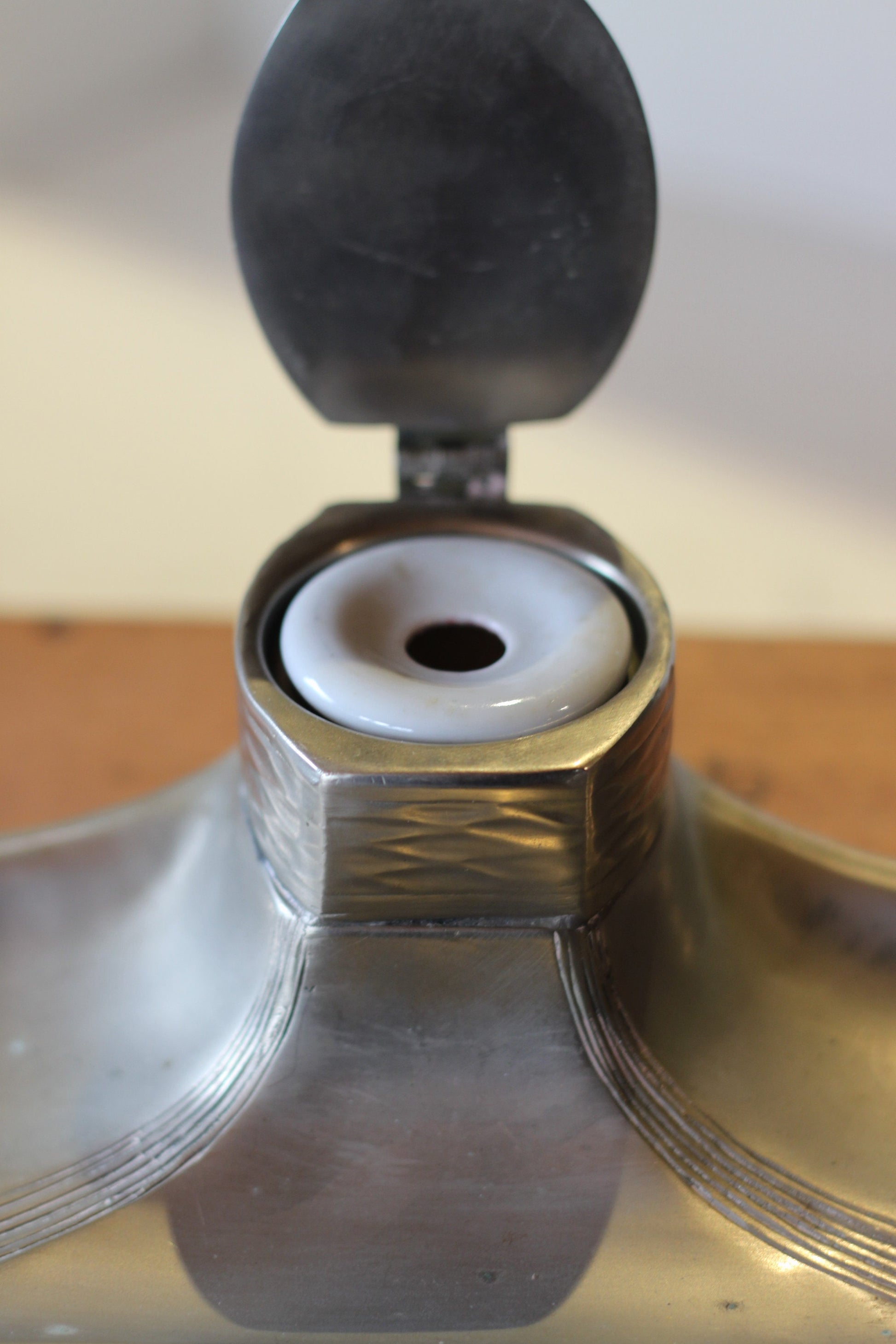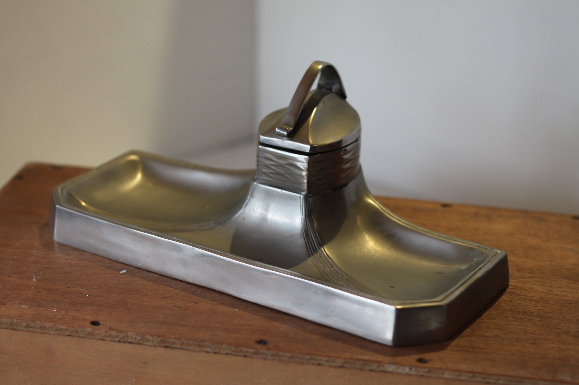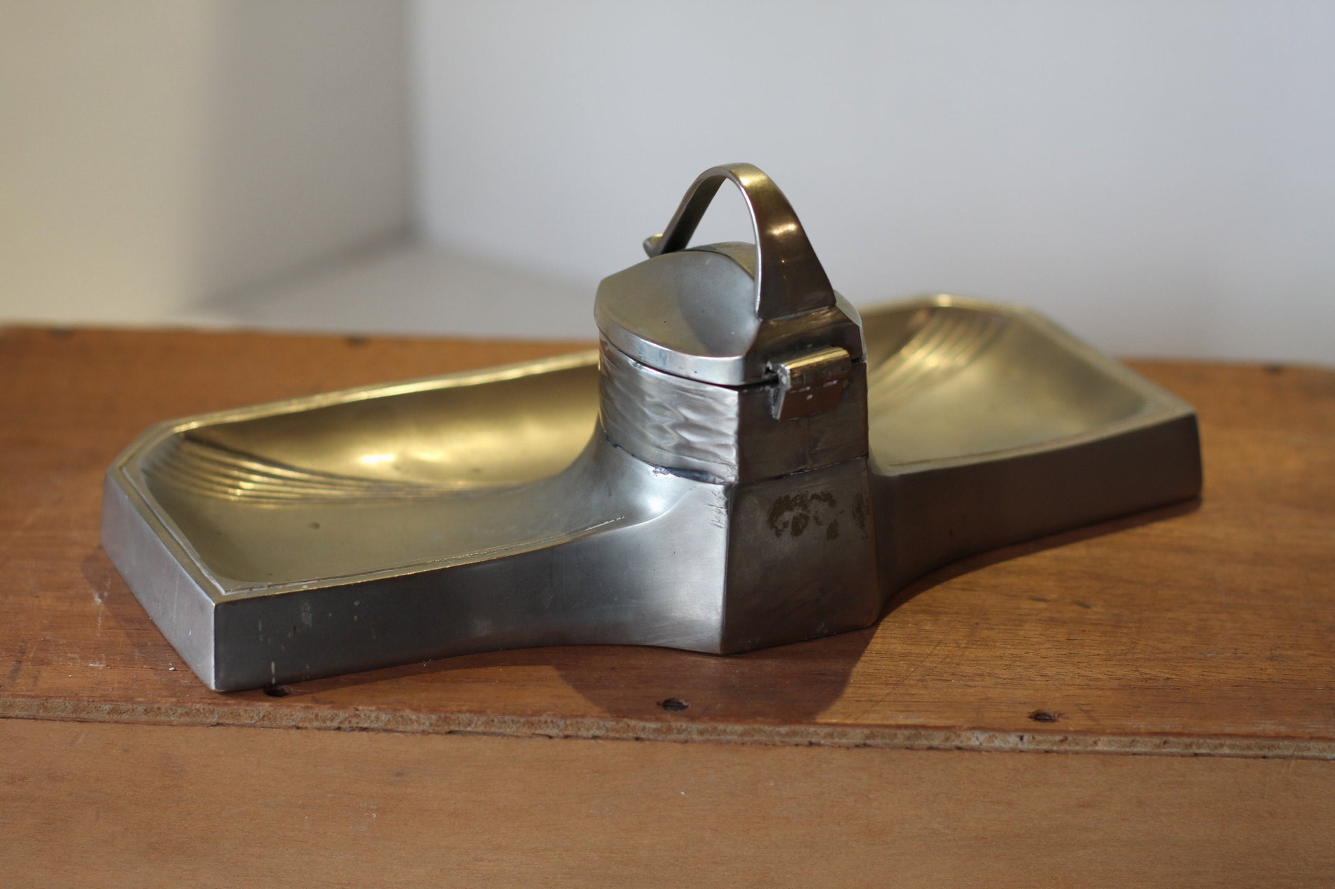 A Continental Art Nouveau Pewter Ink Well With Original Ceramic Ink well - 25.5cm long