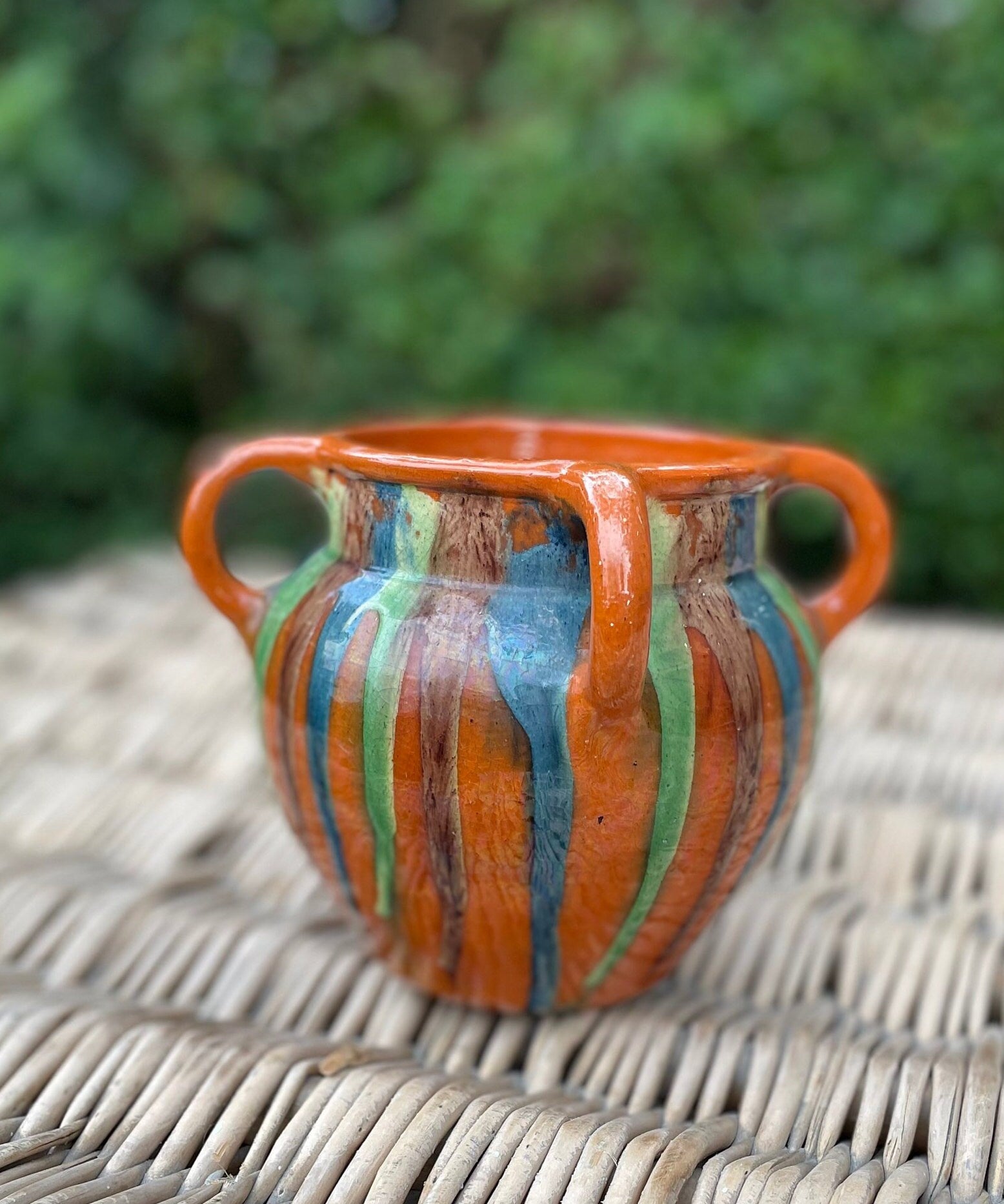 Here we have a four handled Belgian slip decorated studio art pottery vase 14cm tall