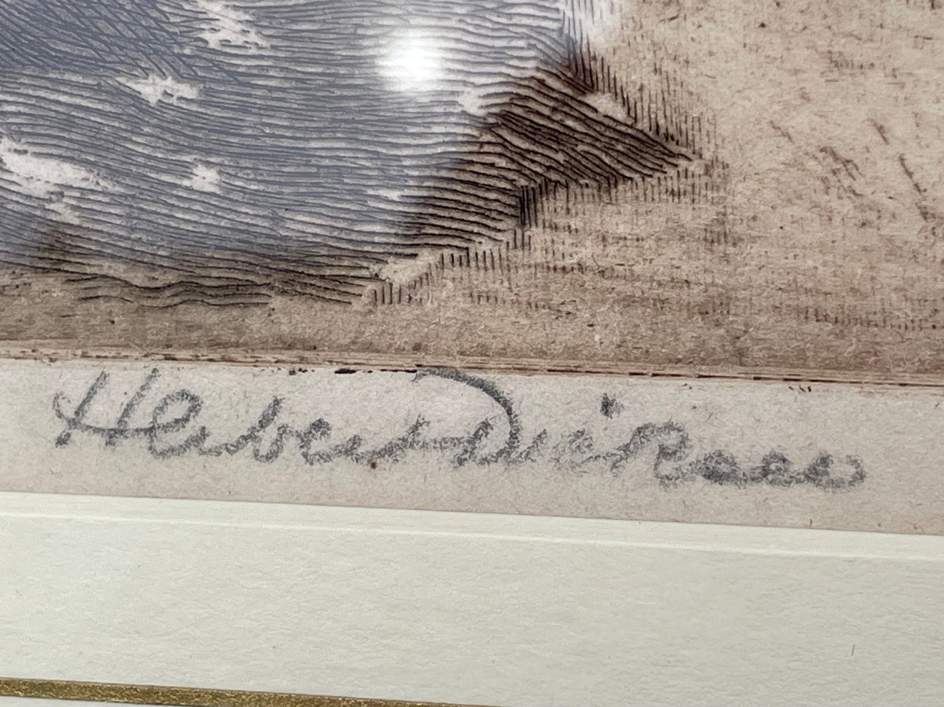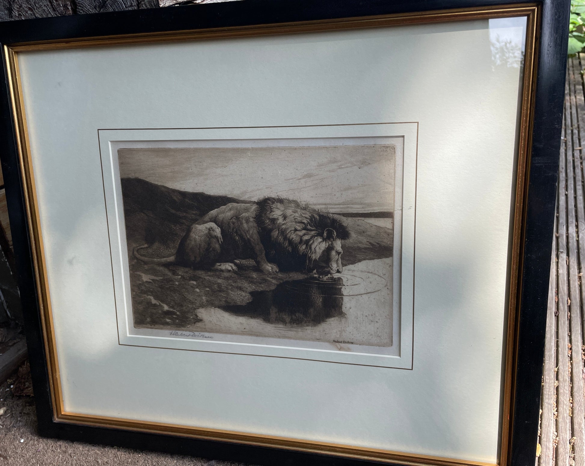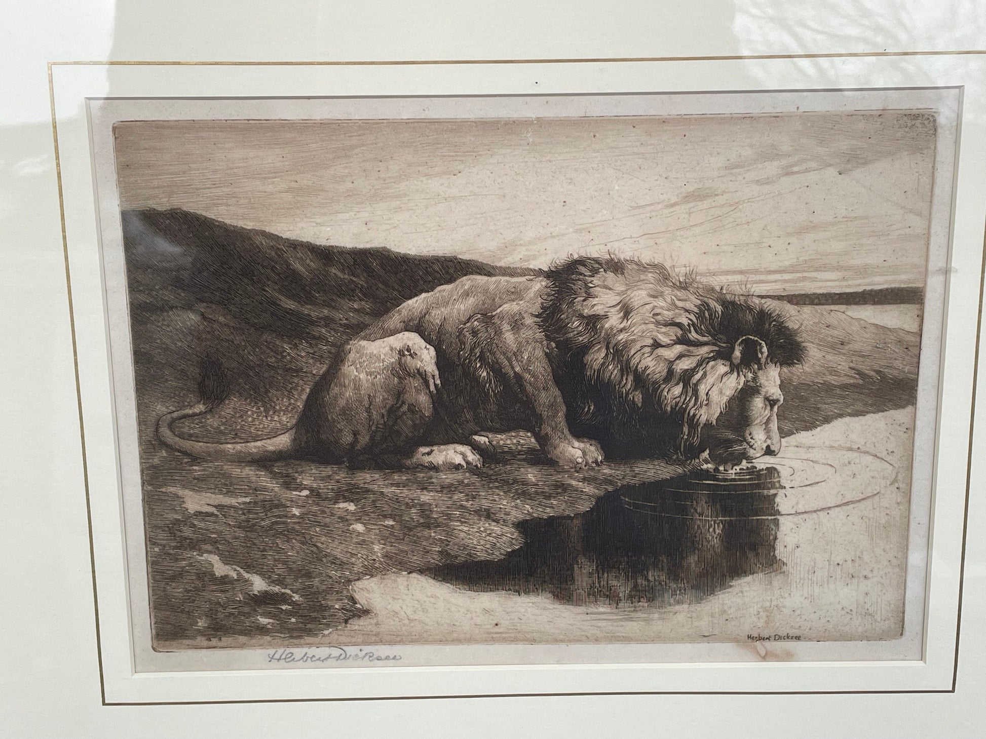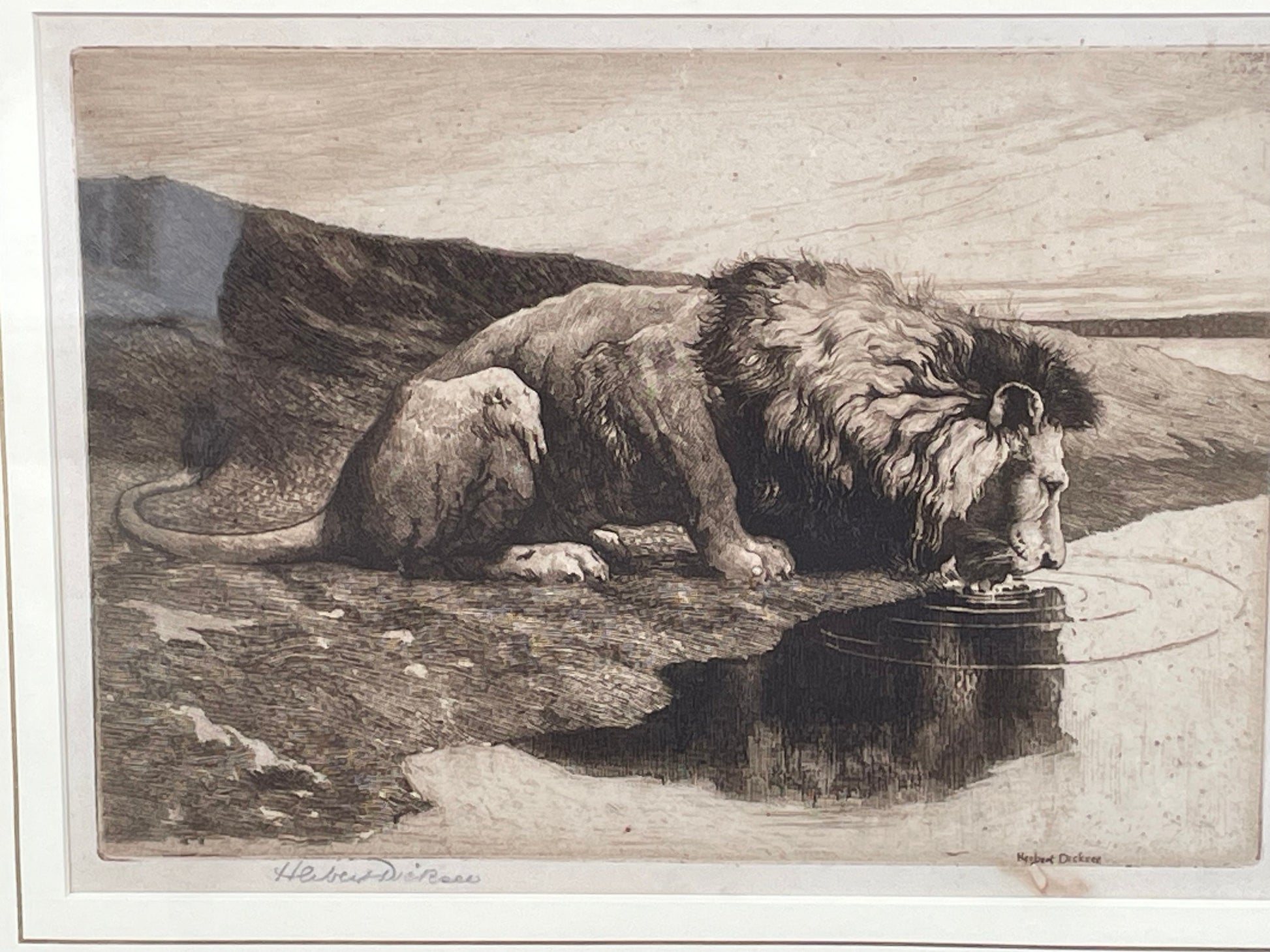 Here we have a framed and signed Herbert Dicksee etching called Lion Drinking 1890 18x25cm