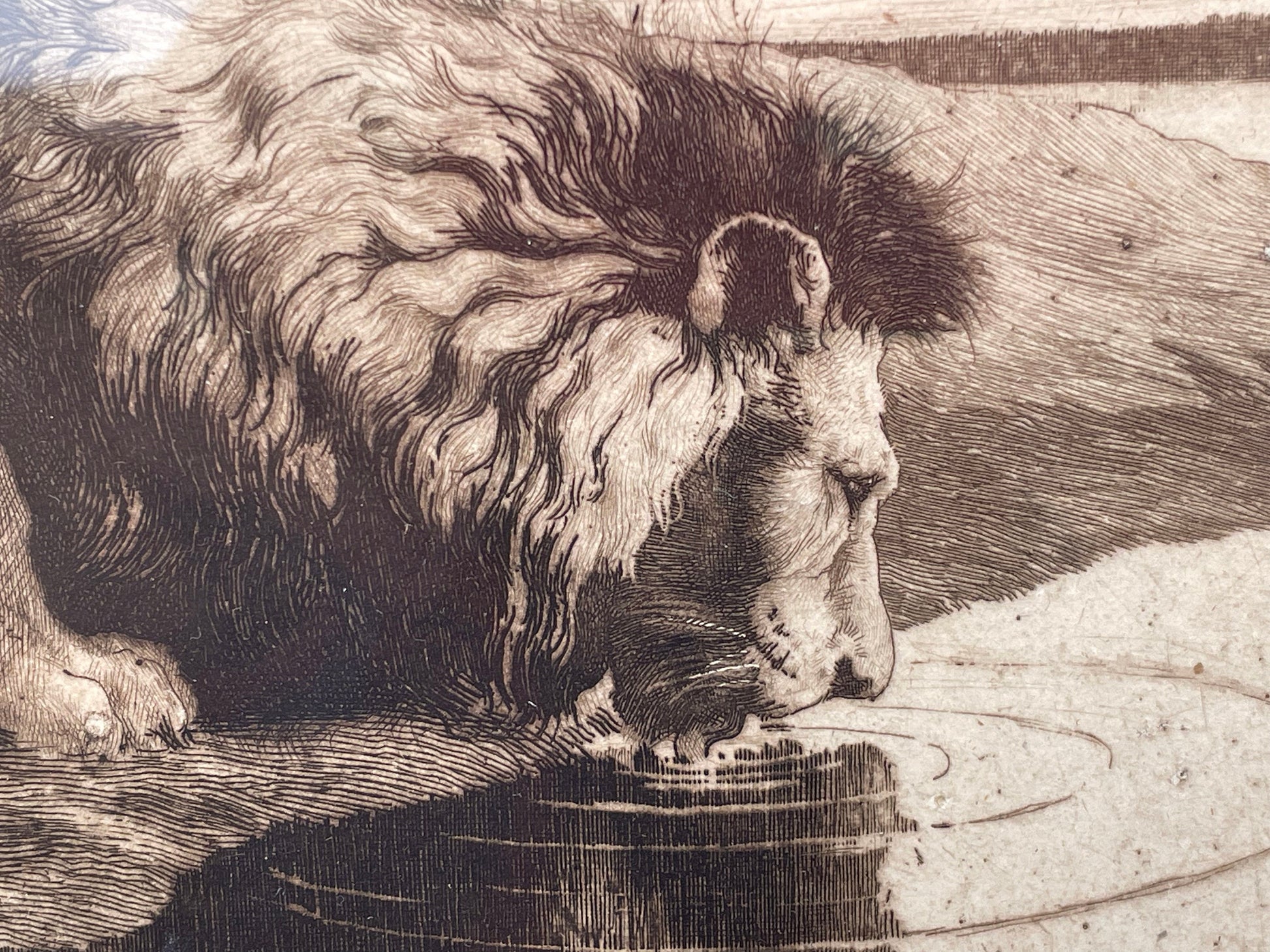 Described as follows - Lion Drinking, lion crouching by the side of a lake- original HERBERT DICKSEE etching , signed artist proof c.1890, as exhibited Royal Academy 1891 -image 17.8 x 25cm