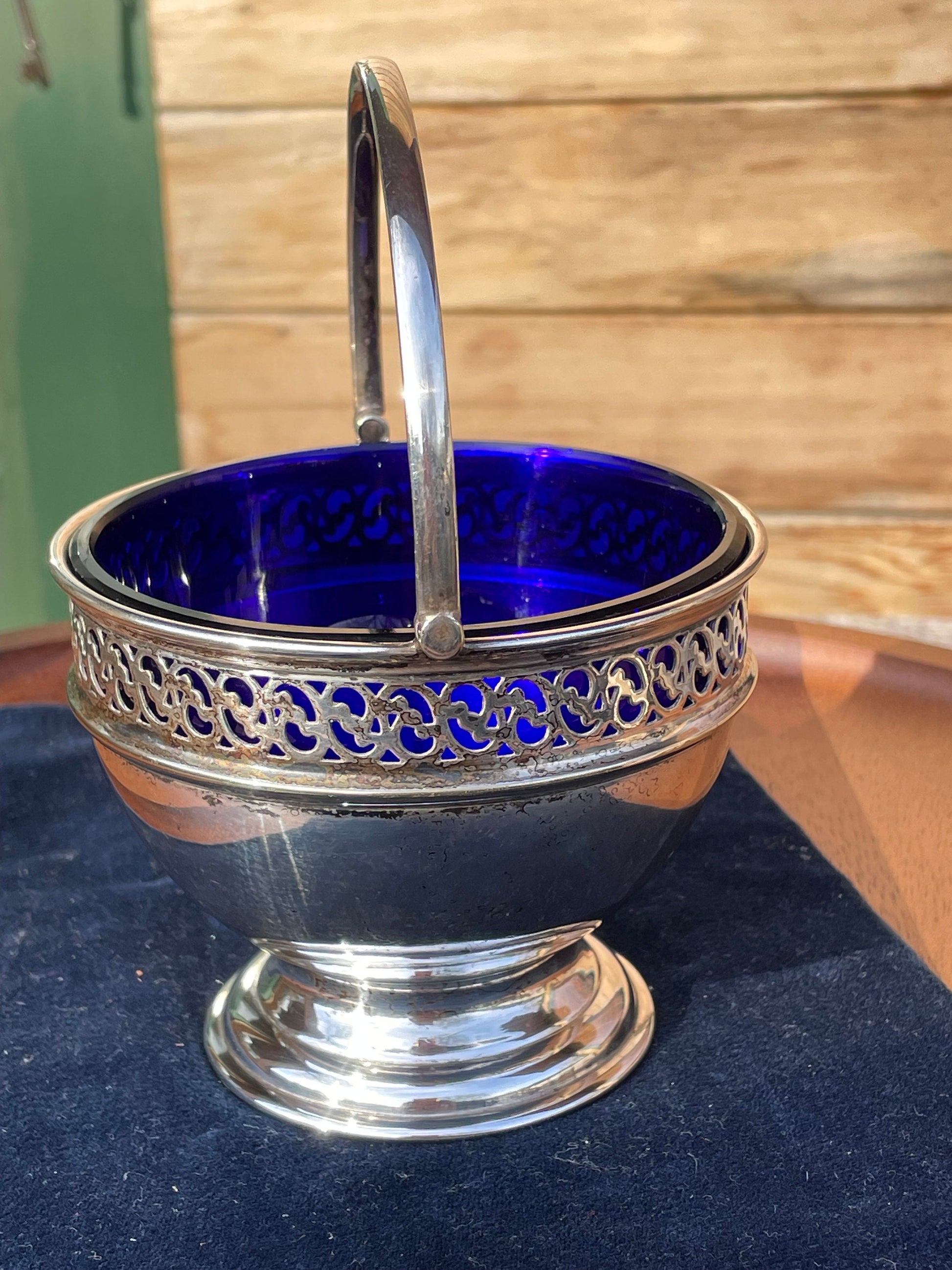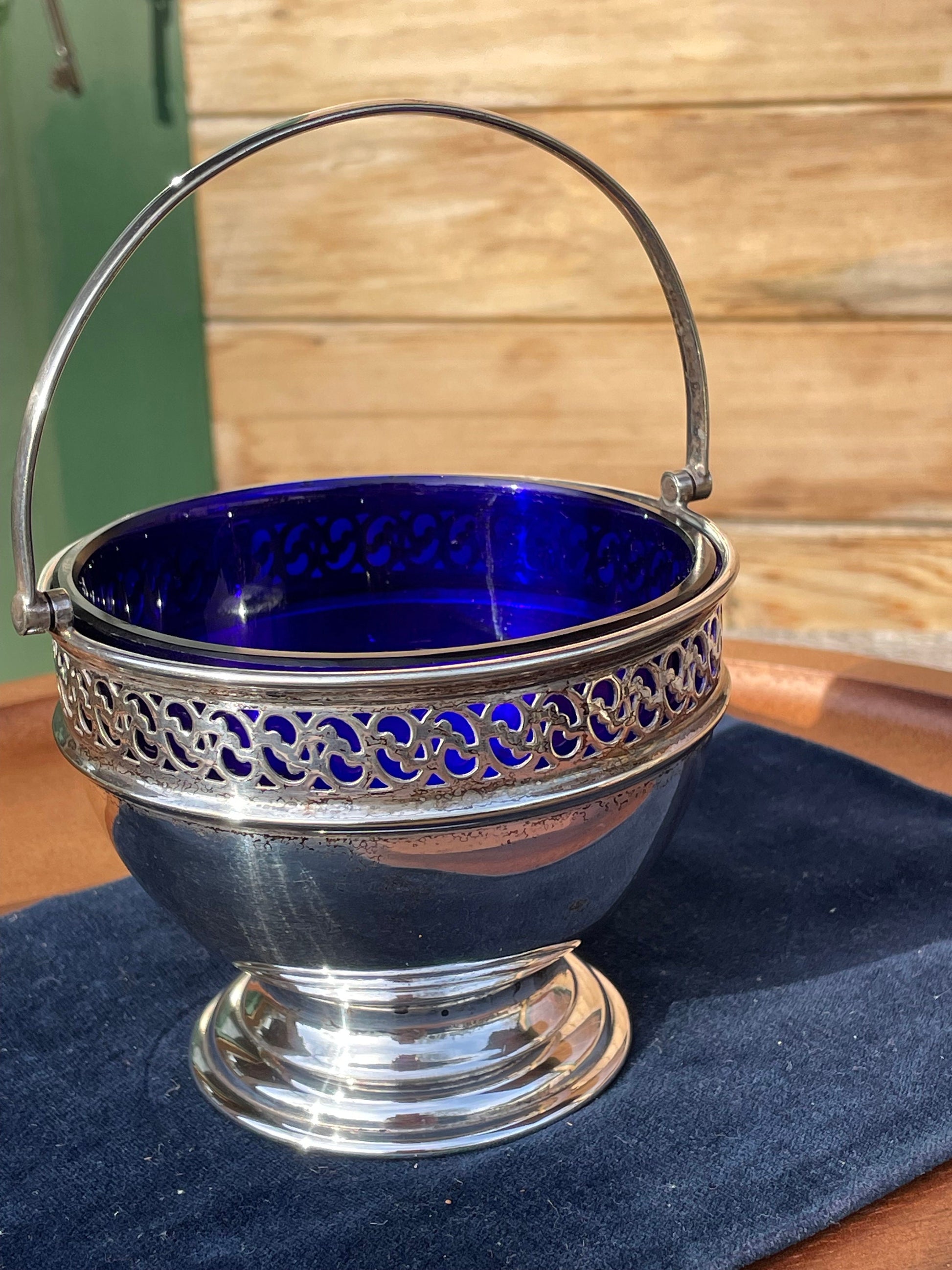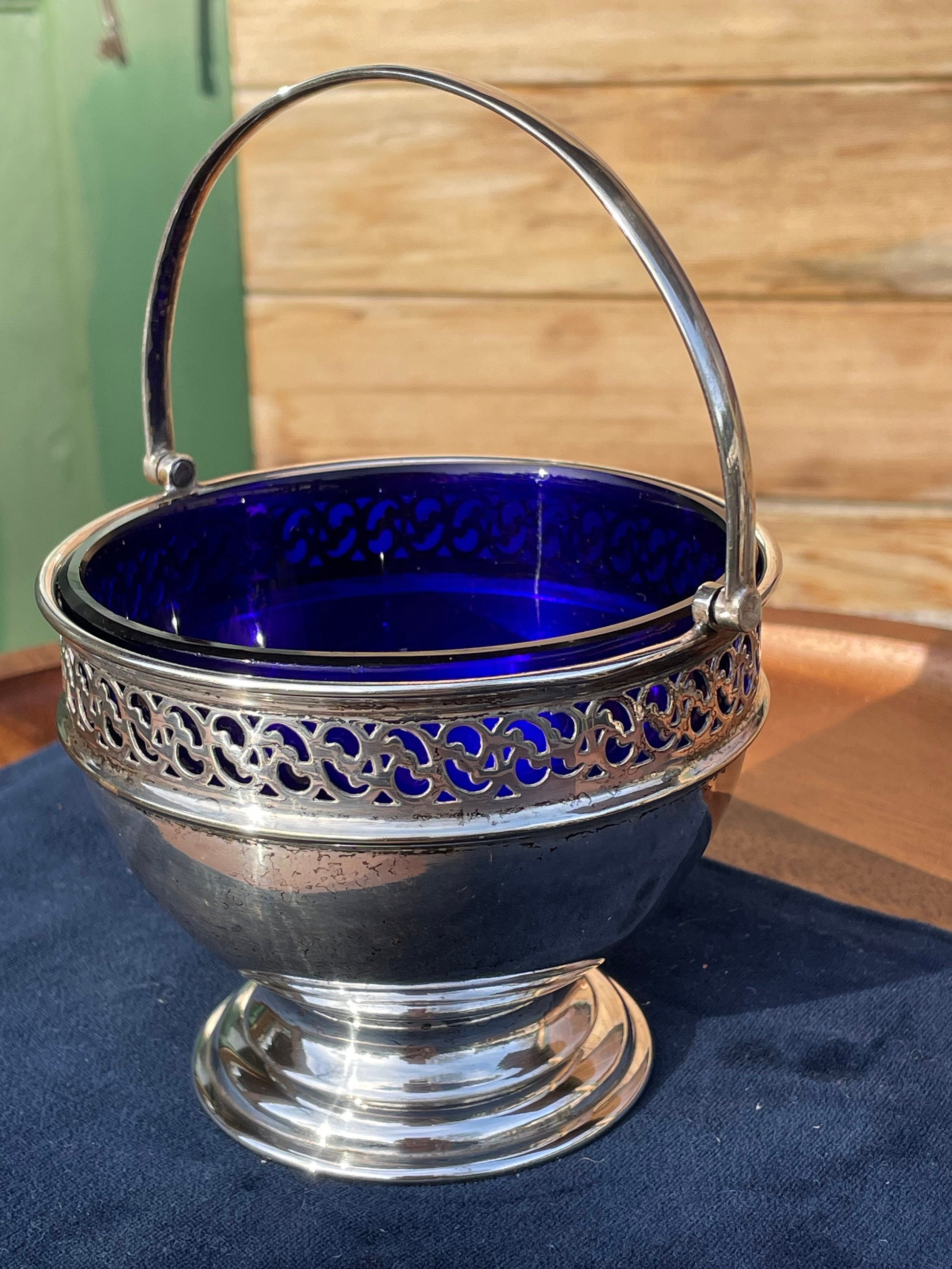 Here we have a good sized silver plated pierced border sugar bowl with Bristol blue liner 10cm diameter