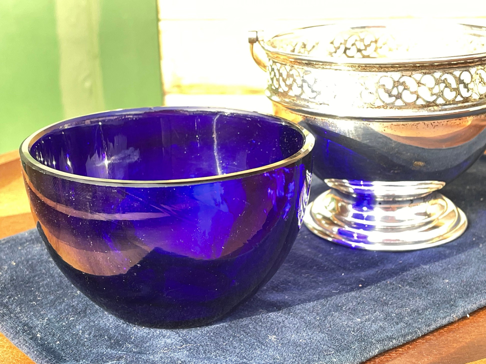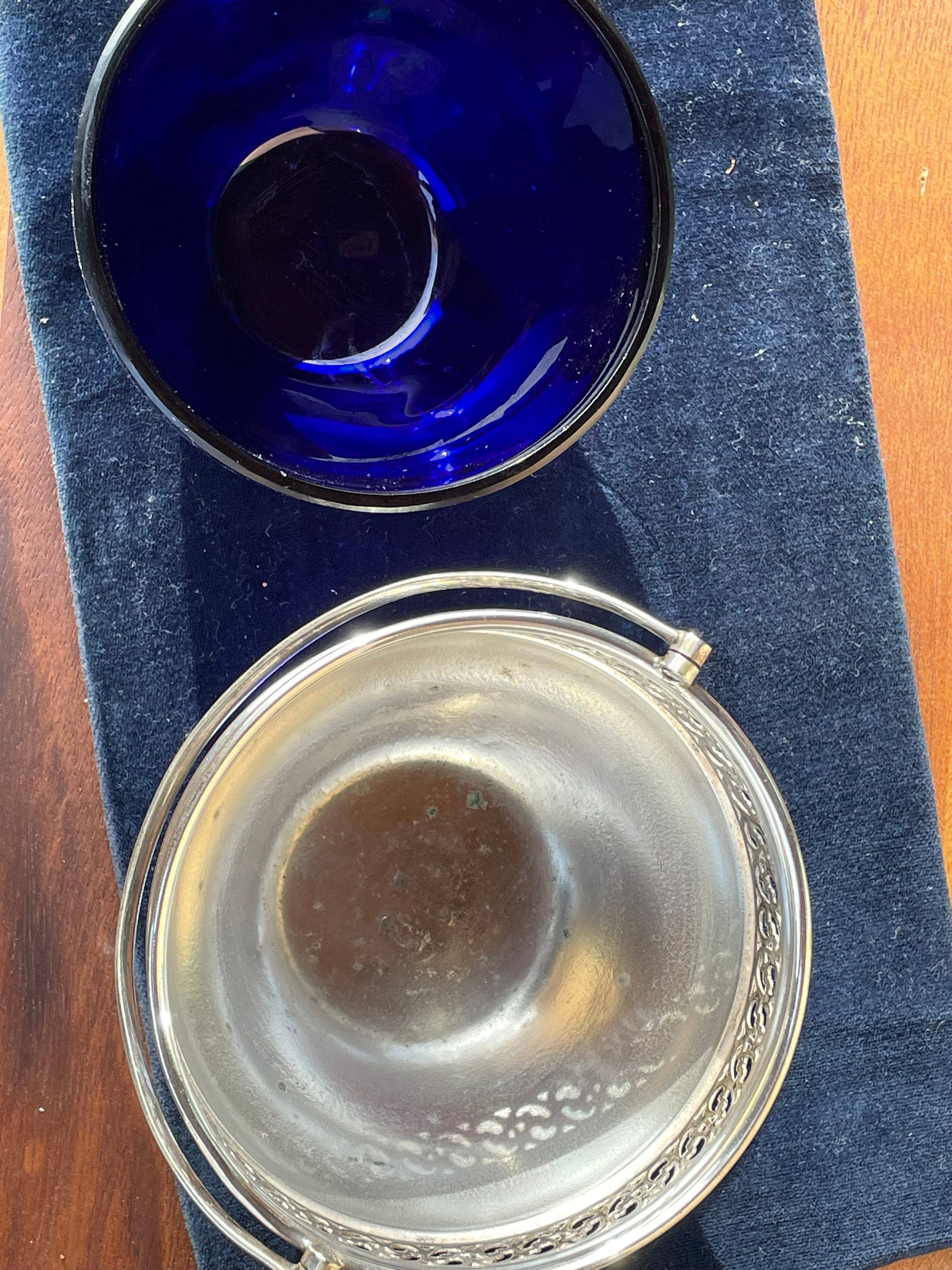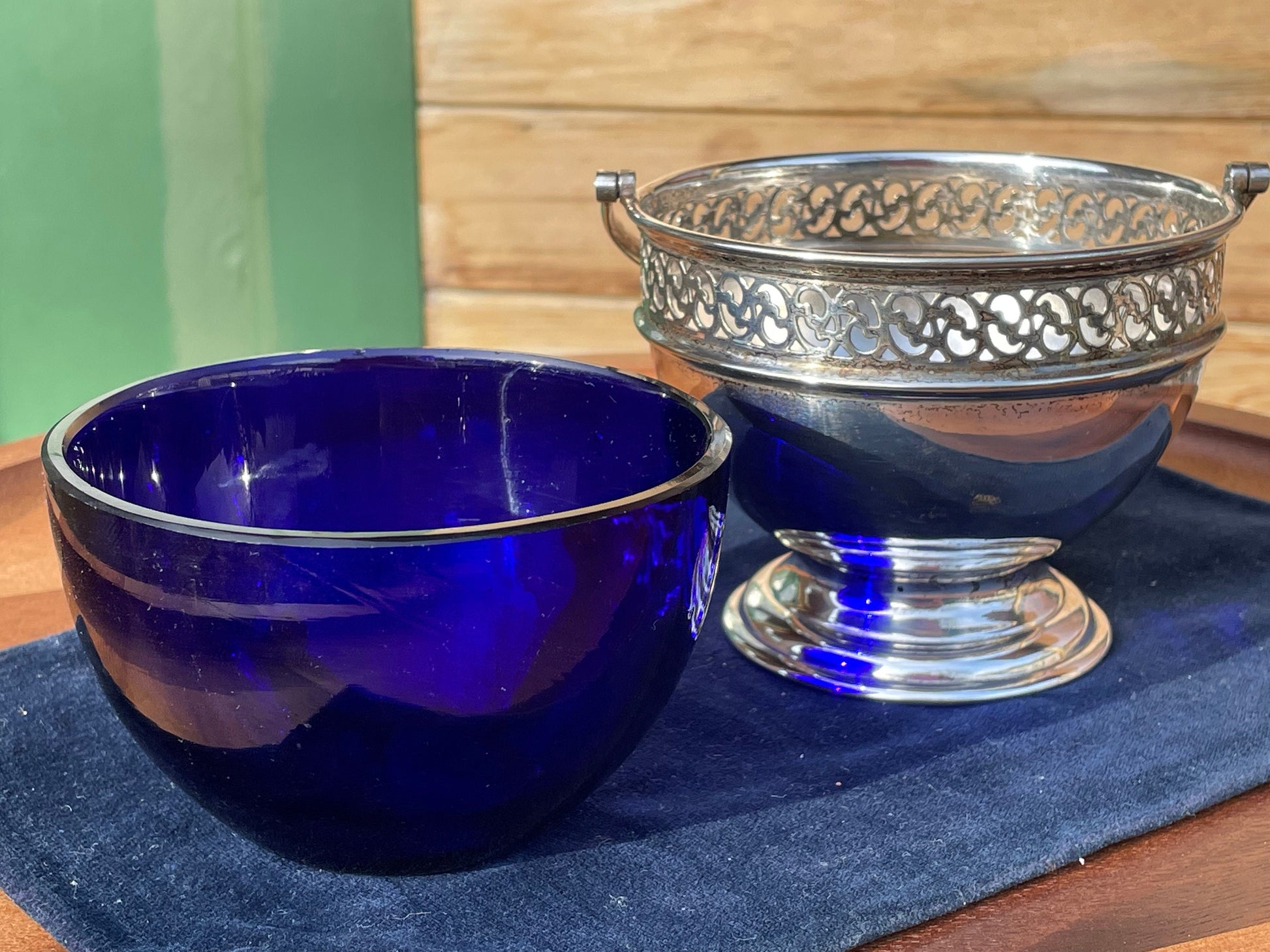Here we have a good sized silver plated pierced border sugar bowl with Bristol blue liner 10cm diameter