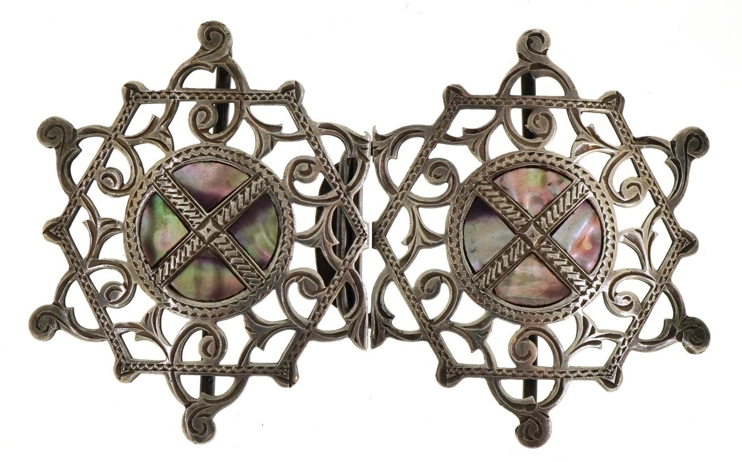 Here we have a hallmarked silver and abalone two-piece buckle, Henry Williamson Ltd, George V - Birmingham 1911