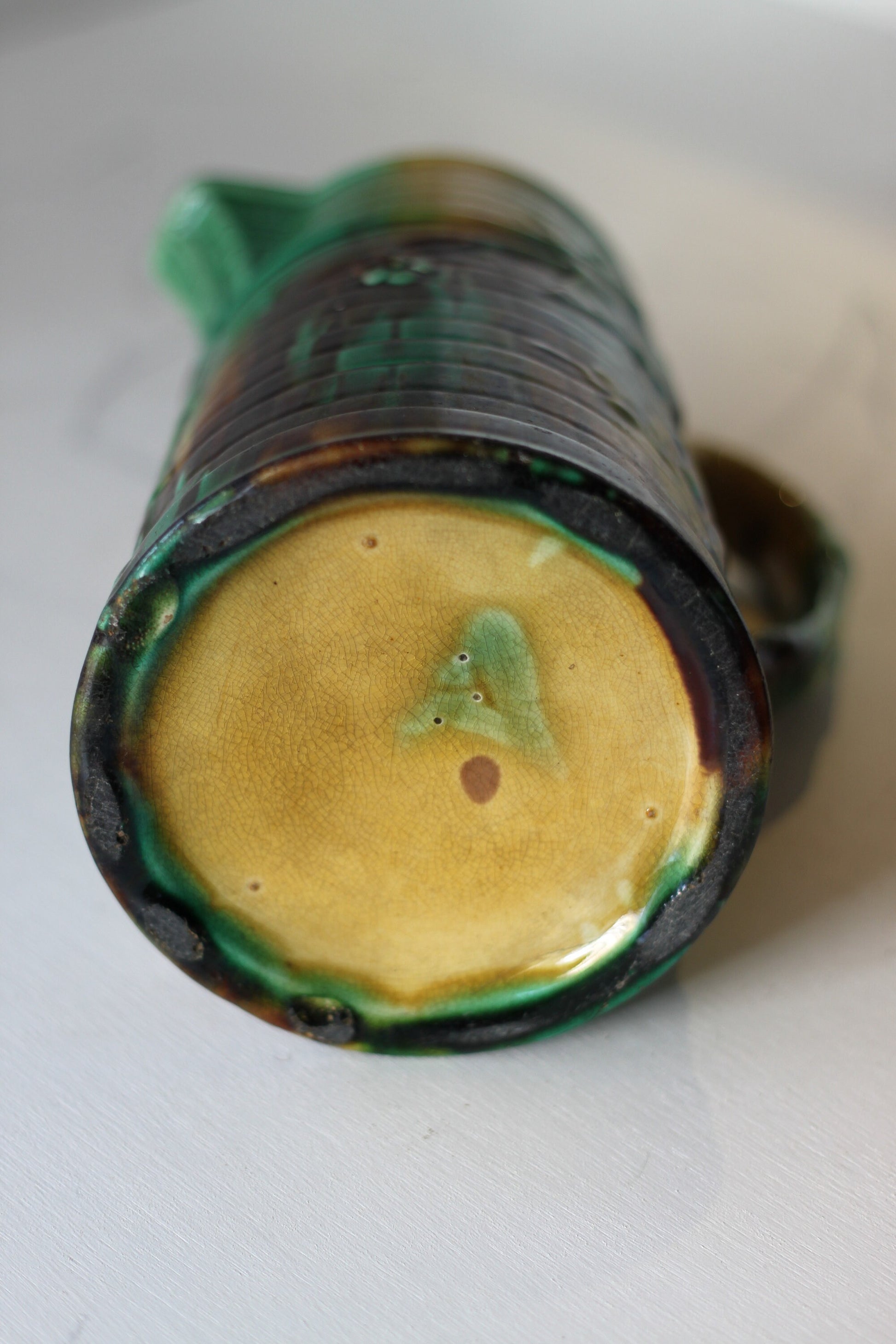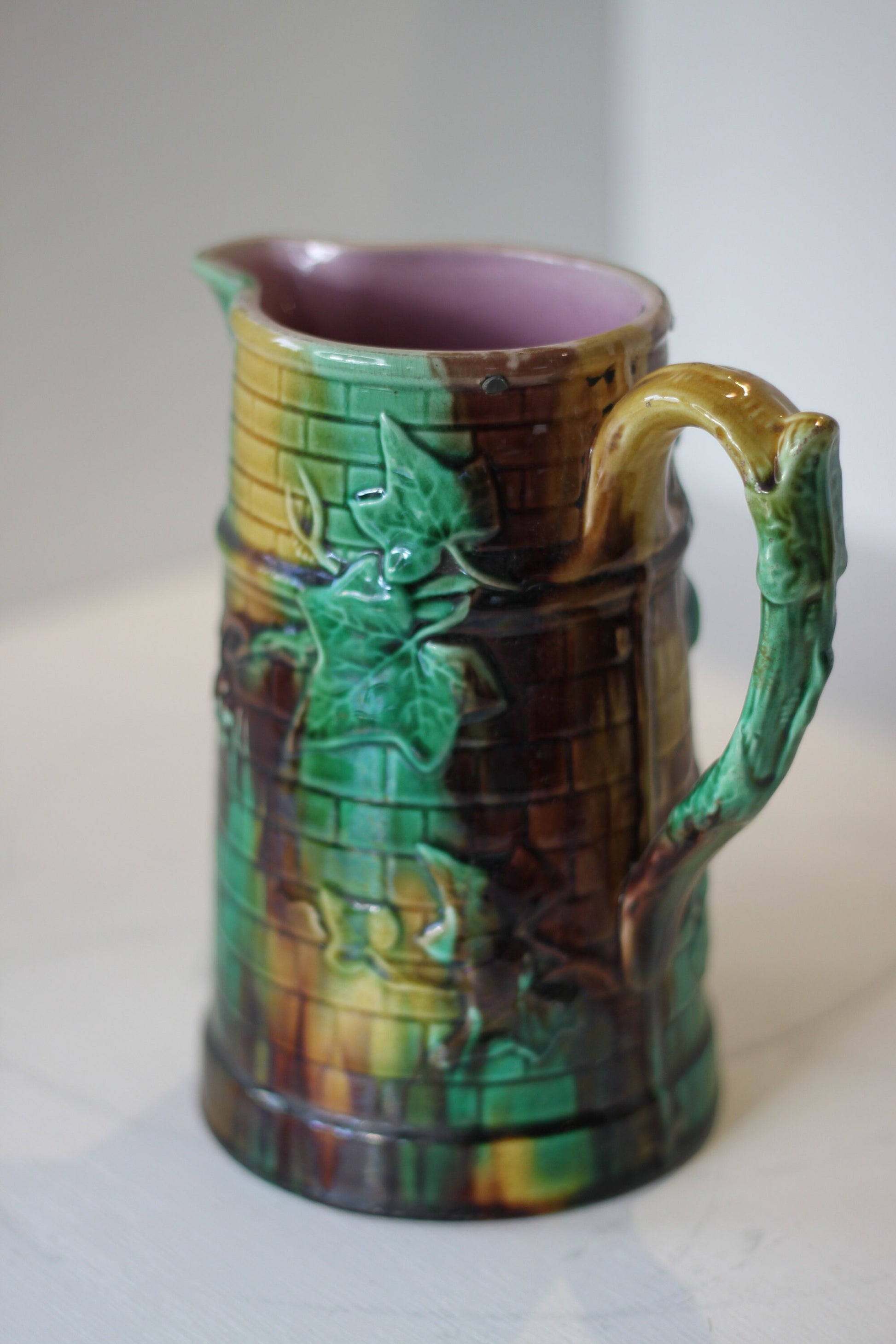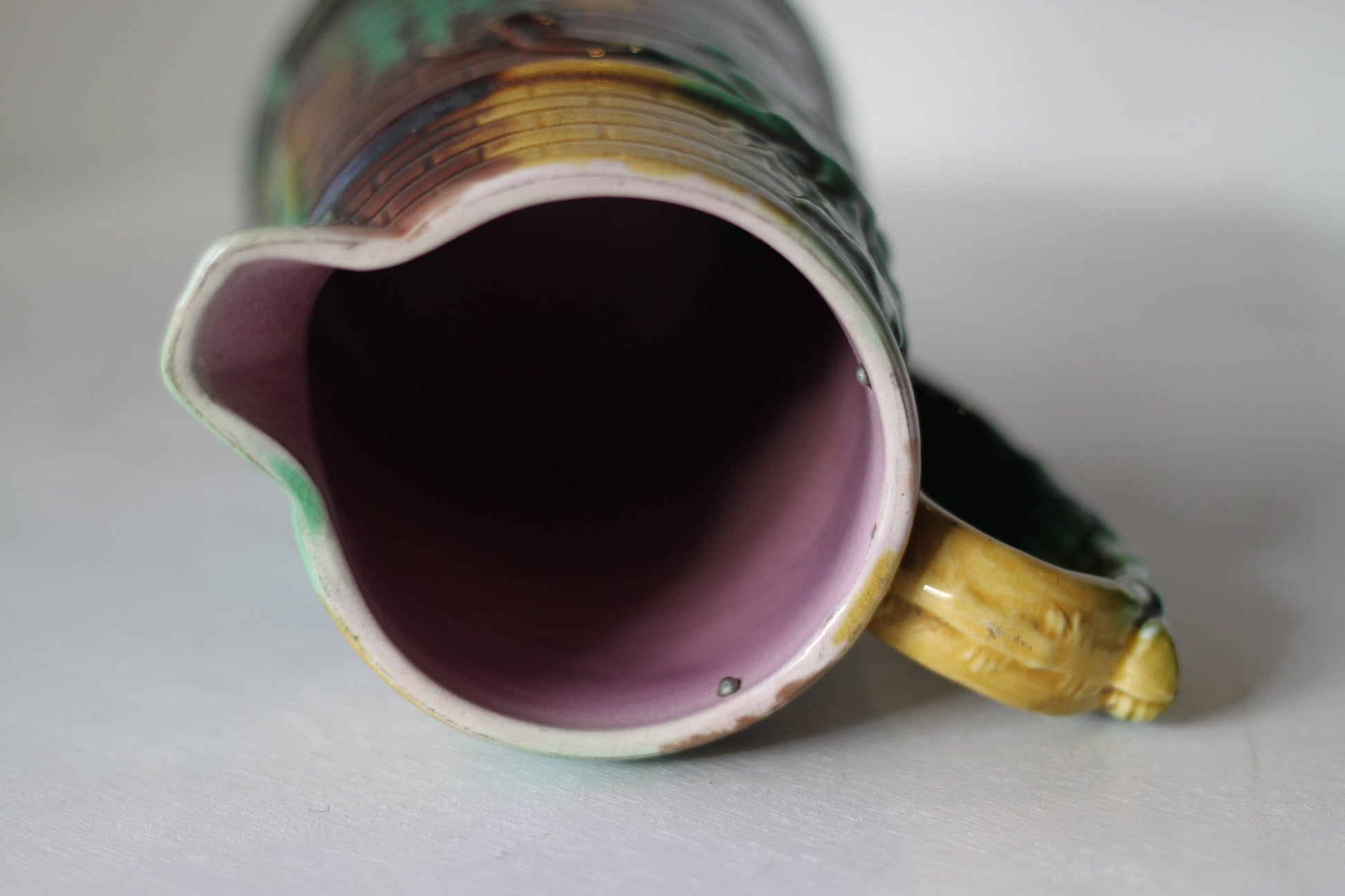 Here we have a Majolica jug 19cm tall with a pink crackle glaze interior - outstanding