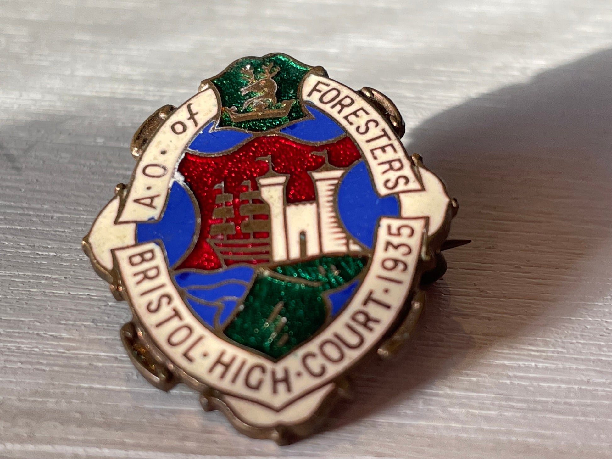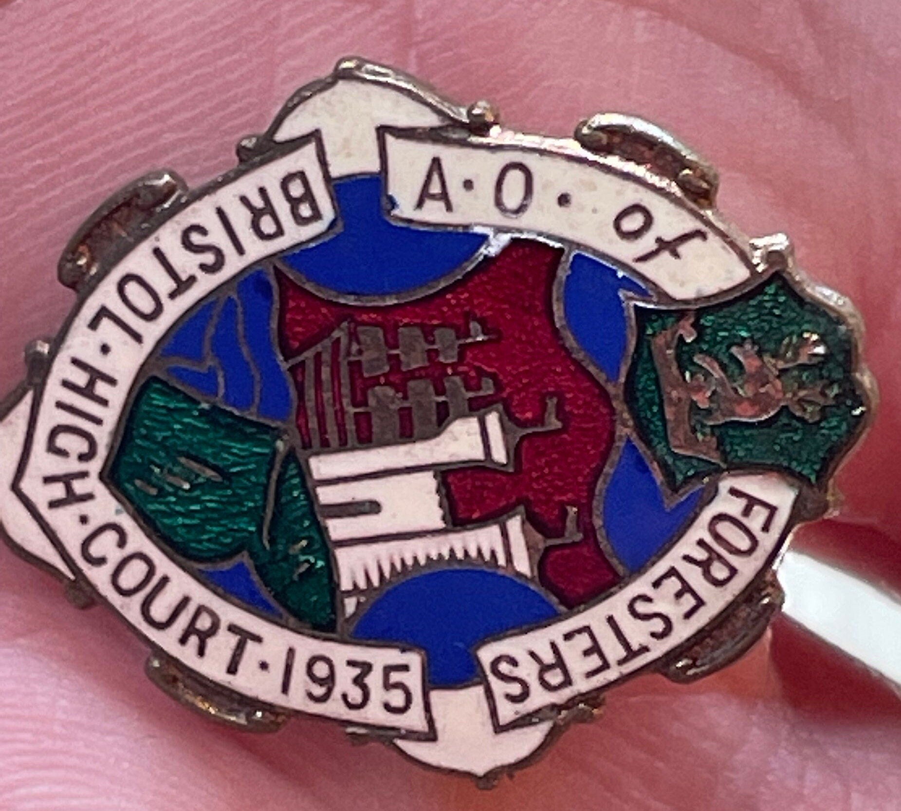 Here we have a Masonic enamel badge saying "A.O. (Ancient order) of foresters Bristol high court 1935" with the colourful crest