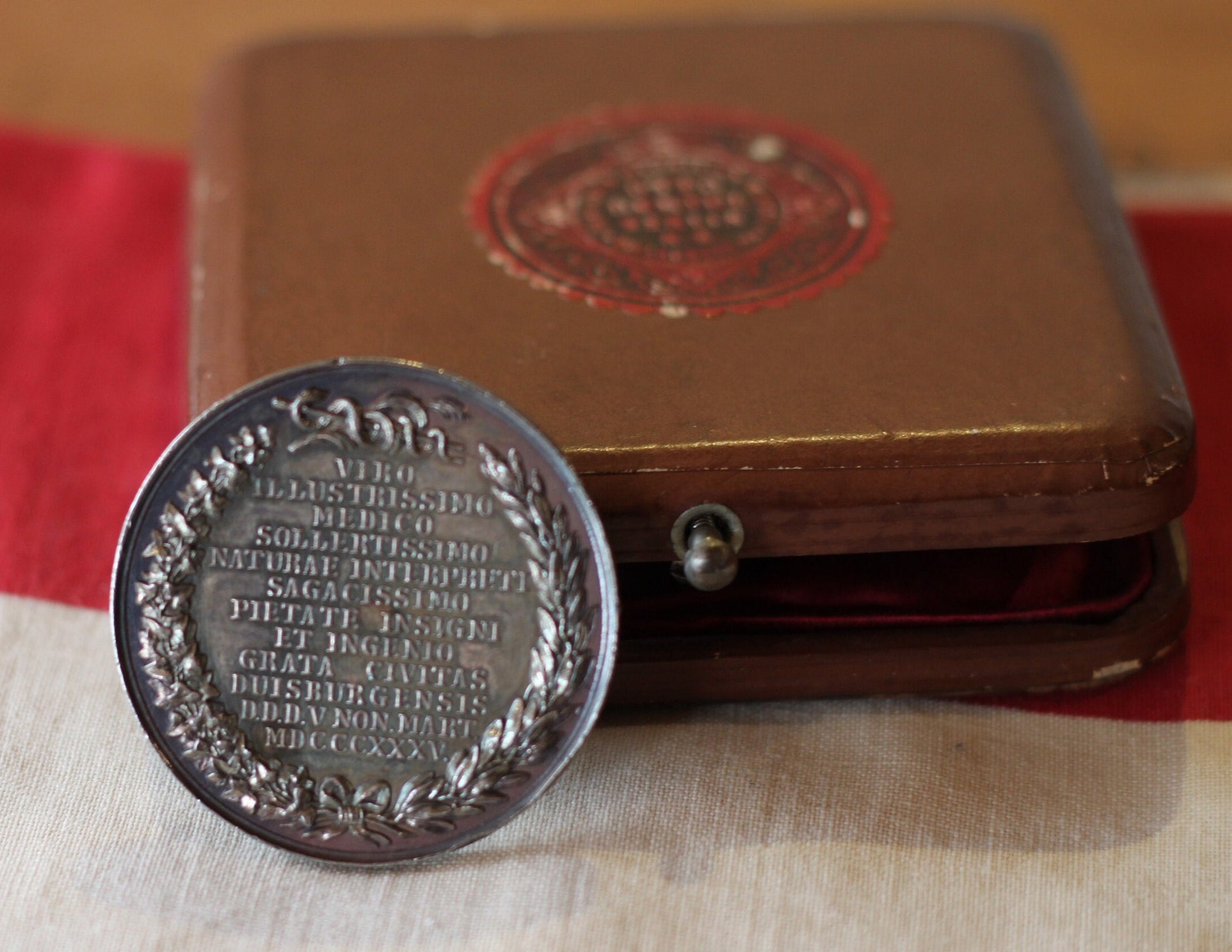 The verso of the medallion has a Latin script that reads: "Viro Illustrissimo Medico Sollertissimo Sagacissimo Pietate Insigni Et Ingenio Grata Civitas Duisburgensis D.D.D. Vnon. Mart. MDCCCXXXV"