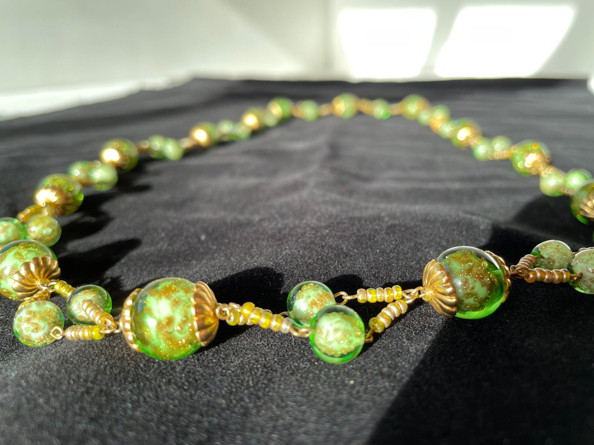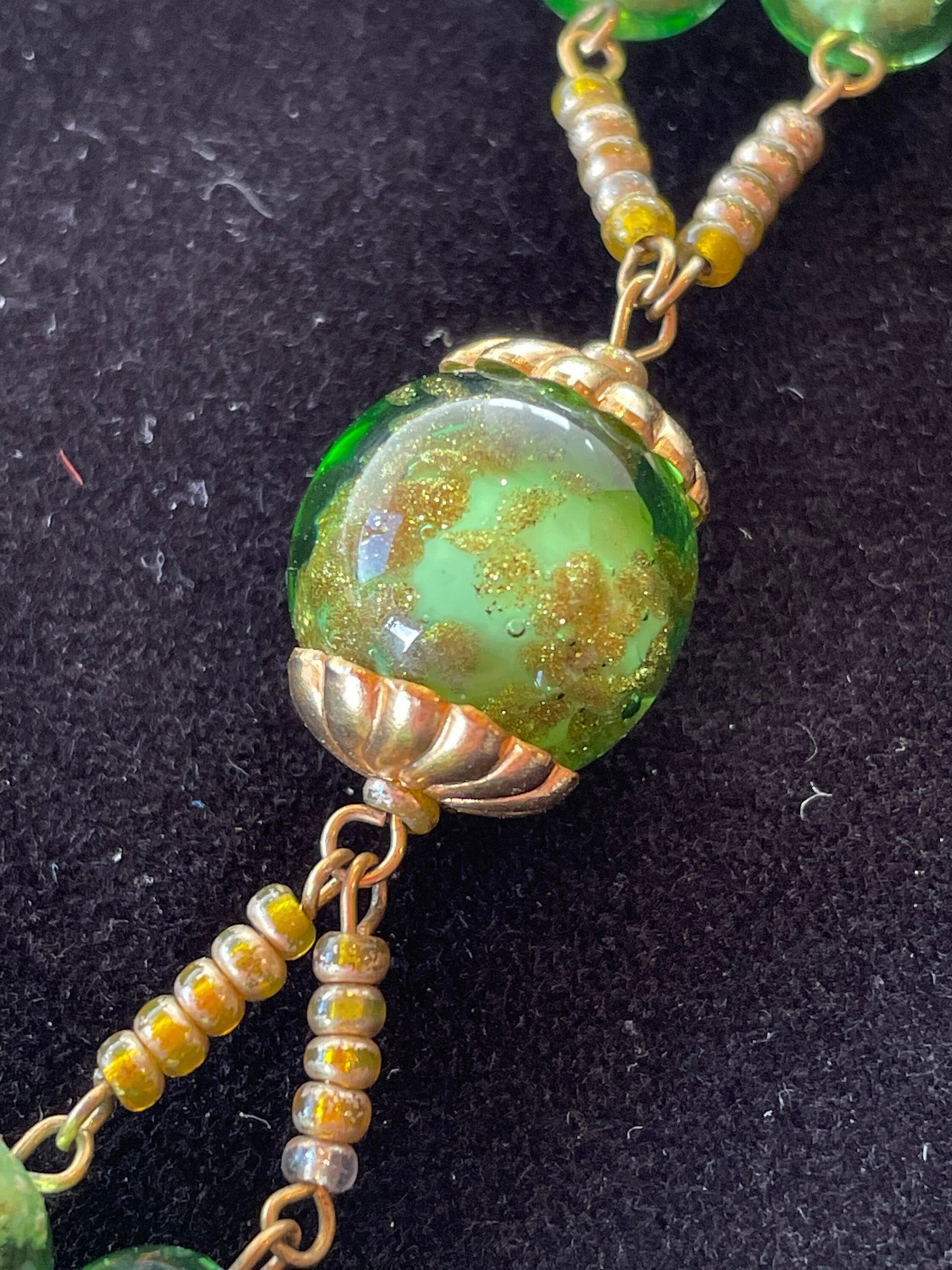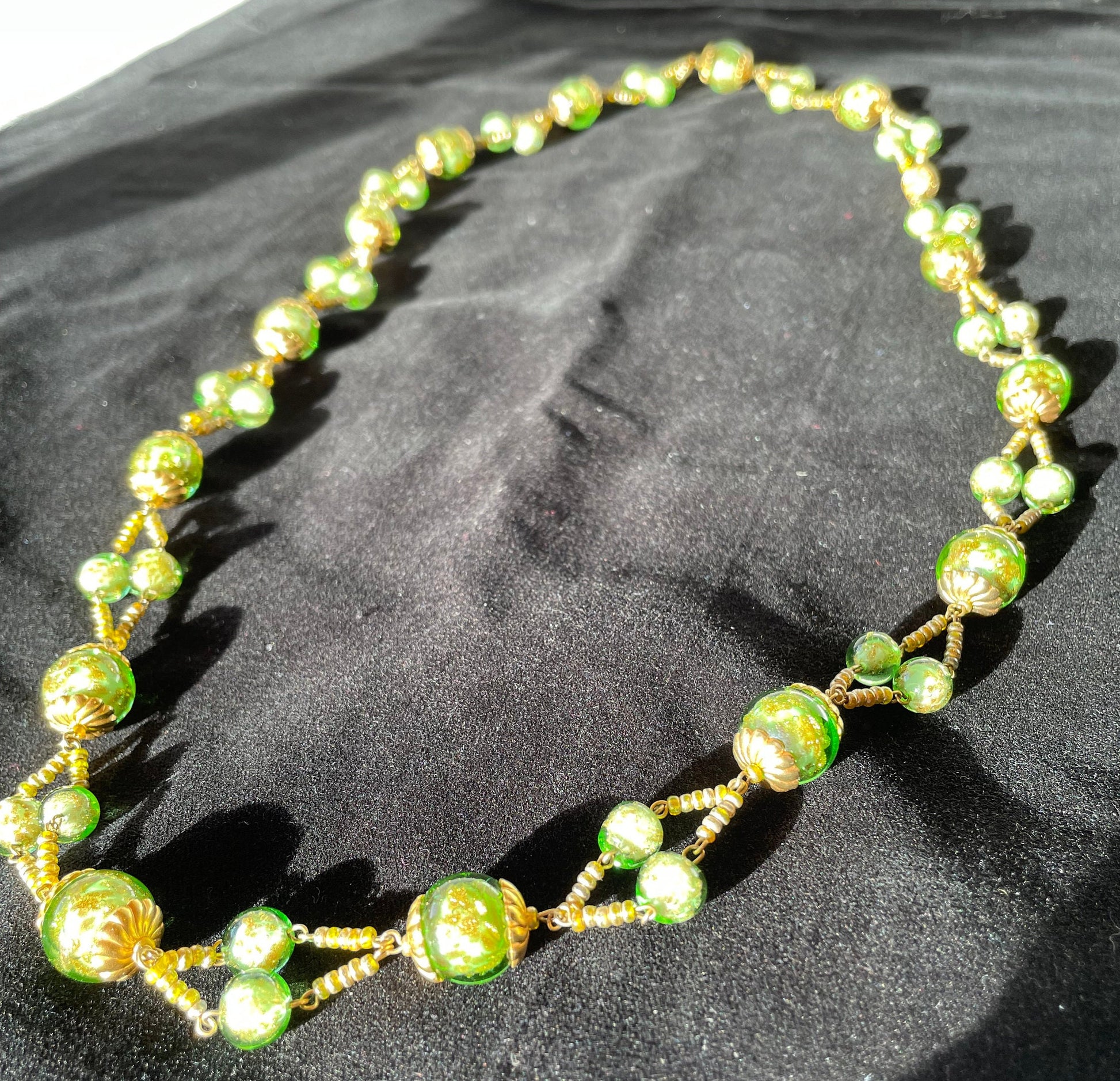 Late 20th-C Murano-style Green & Gold Foil Art Glass Bead Necklace, 74cm – Gilt Metal Caps, Venetian Lampwork Vintage