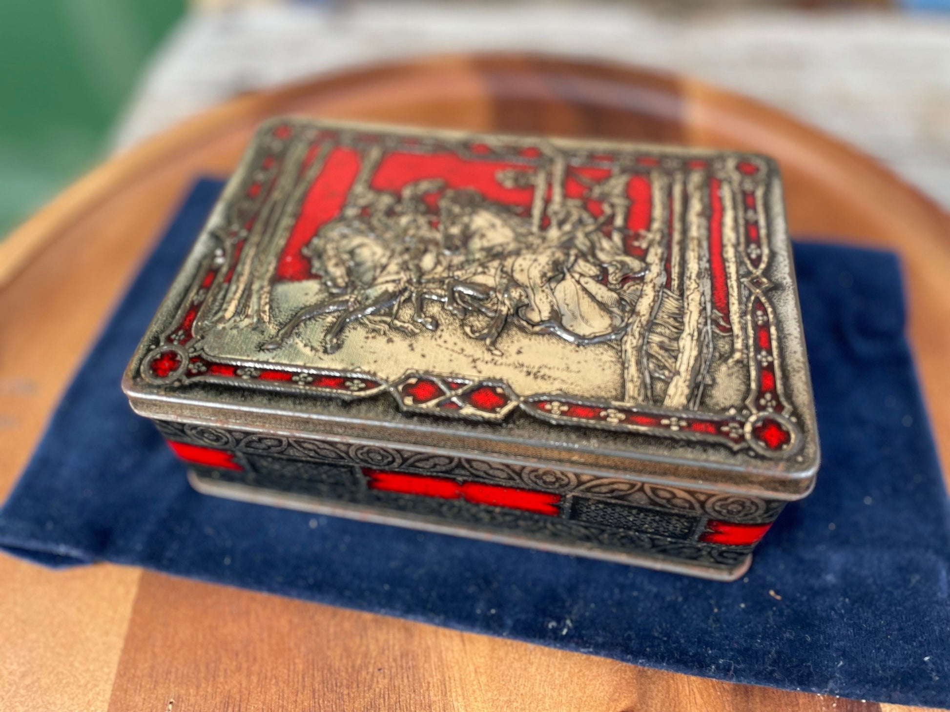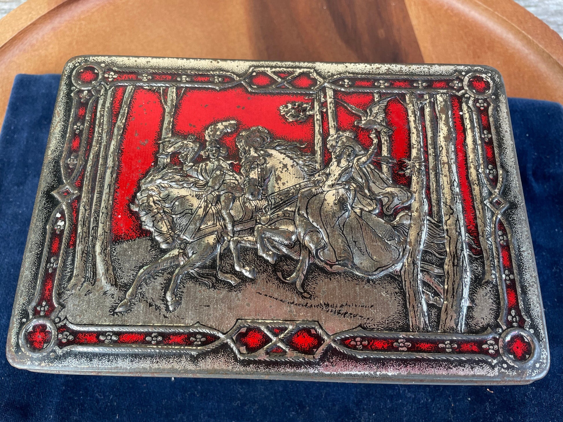 A Mid Century Vintage Riley's Toffee Tin, Depicting Hunters on Horseback in The Woods With Falcons 16.5cm Wide