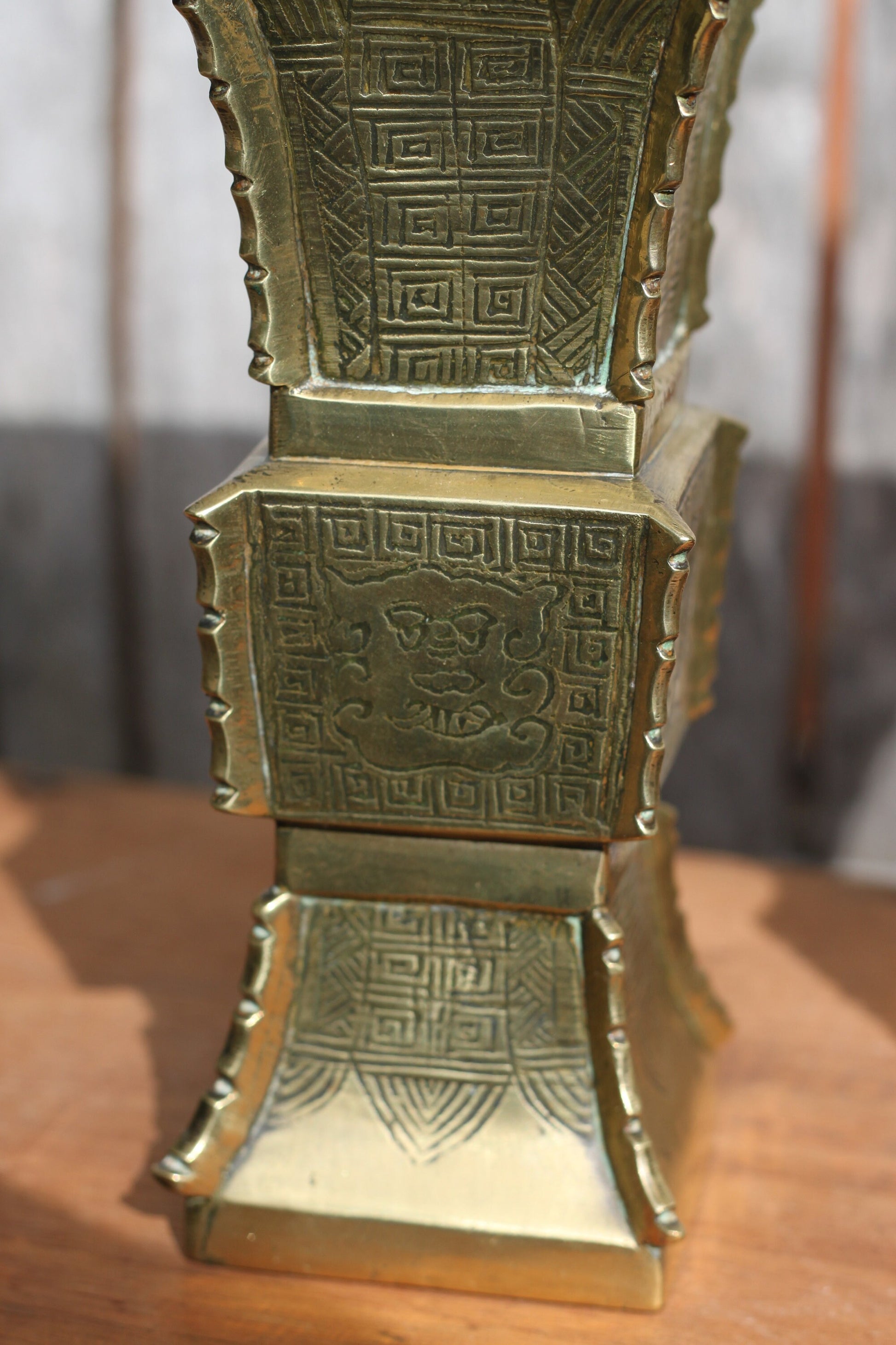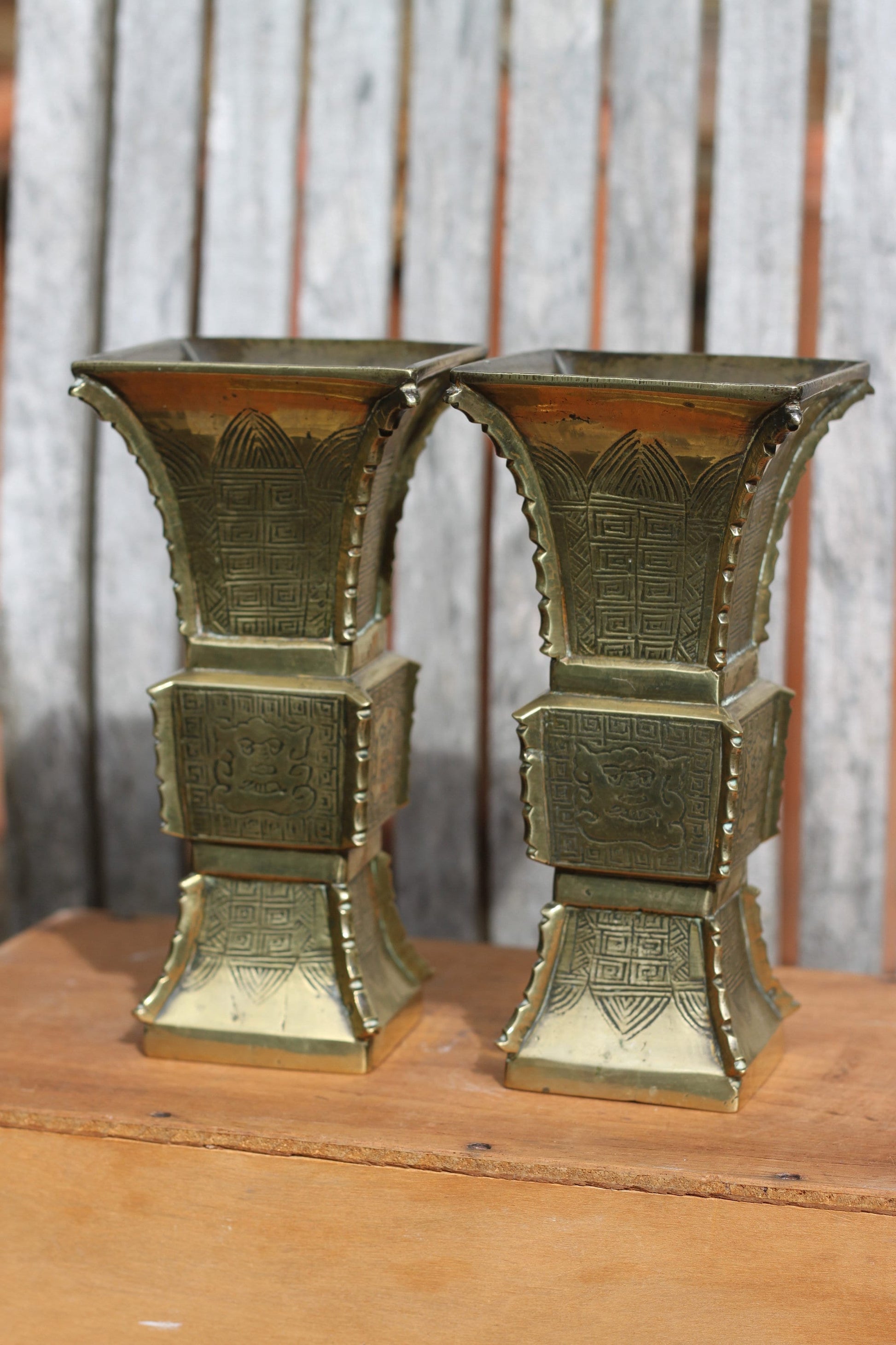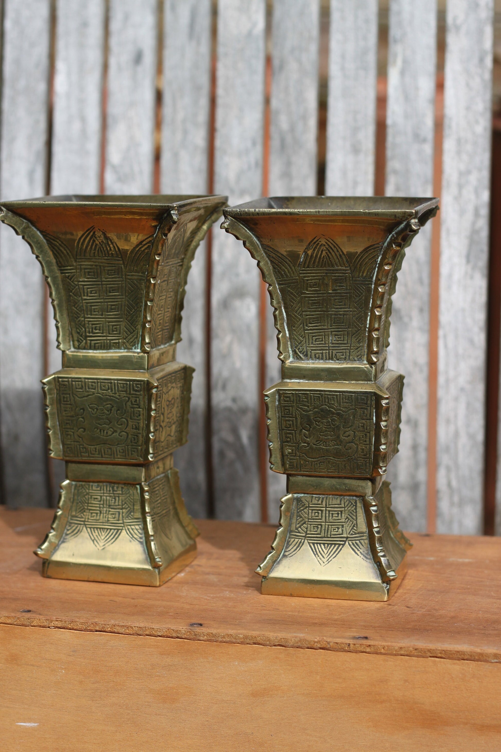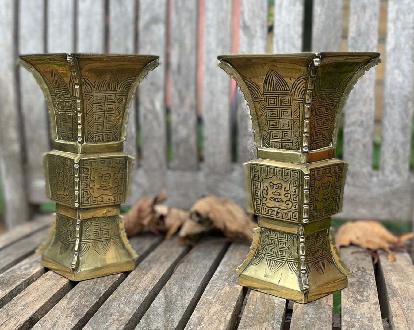 Here we have a pair of Chinese archaic style brass Gu vases, each 19.5cm high - 1.9kg