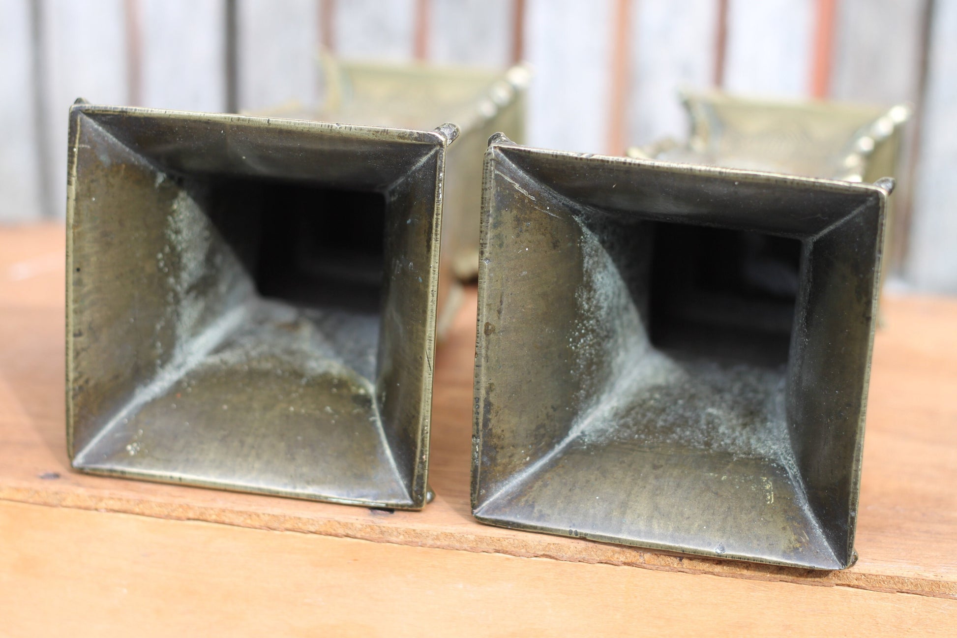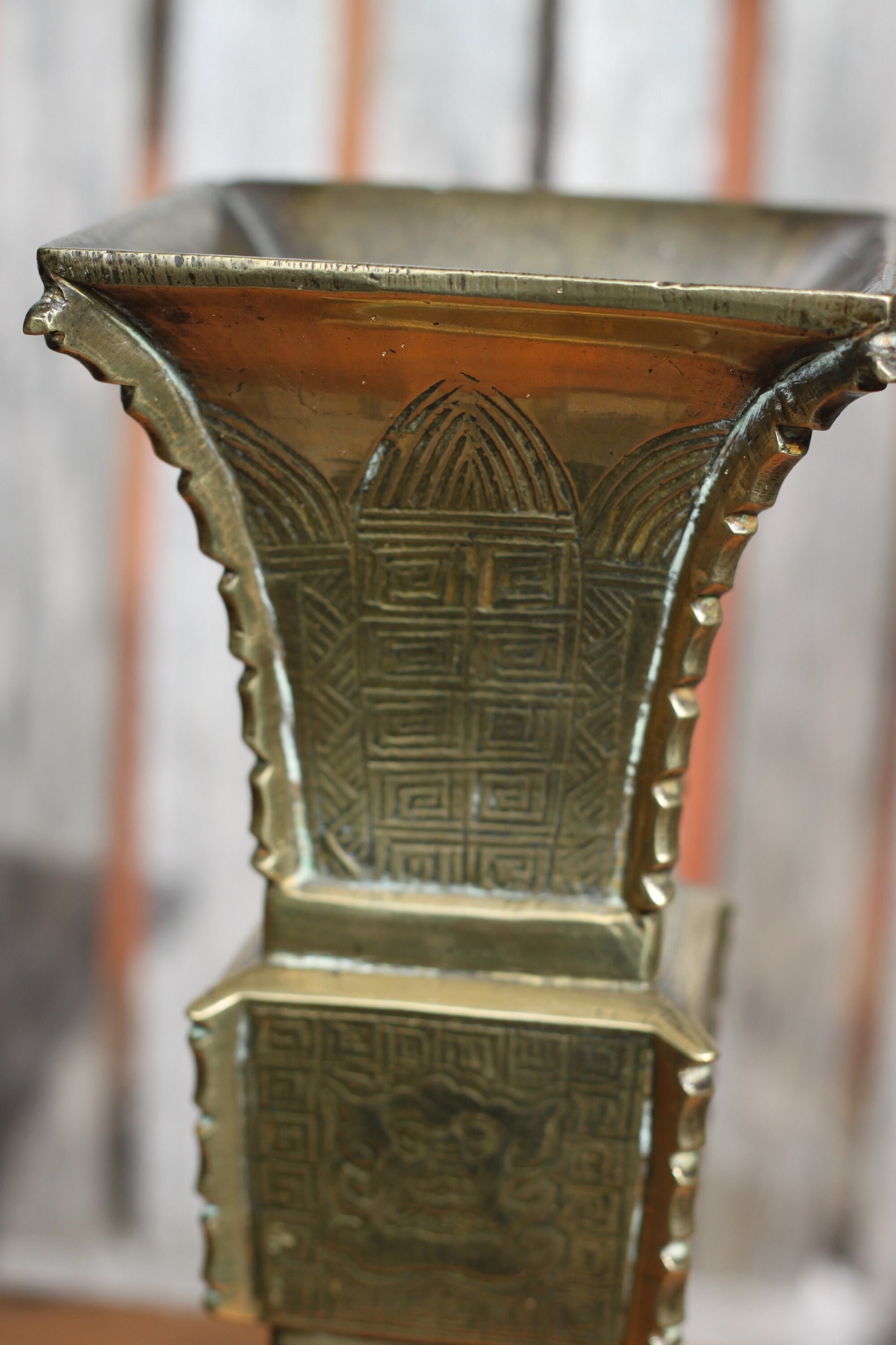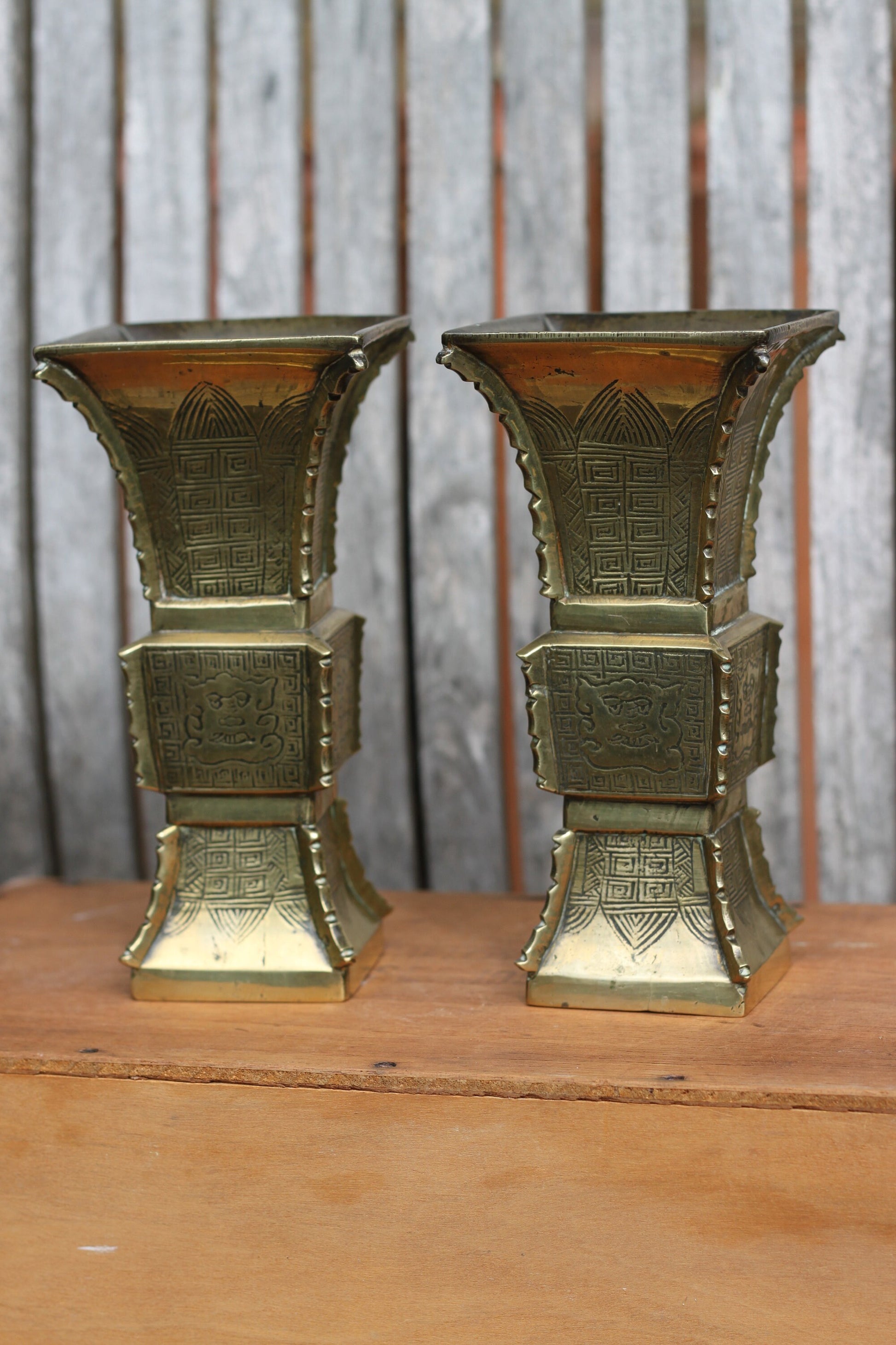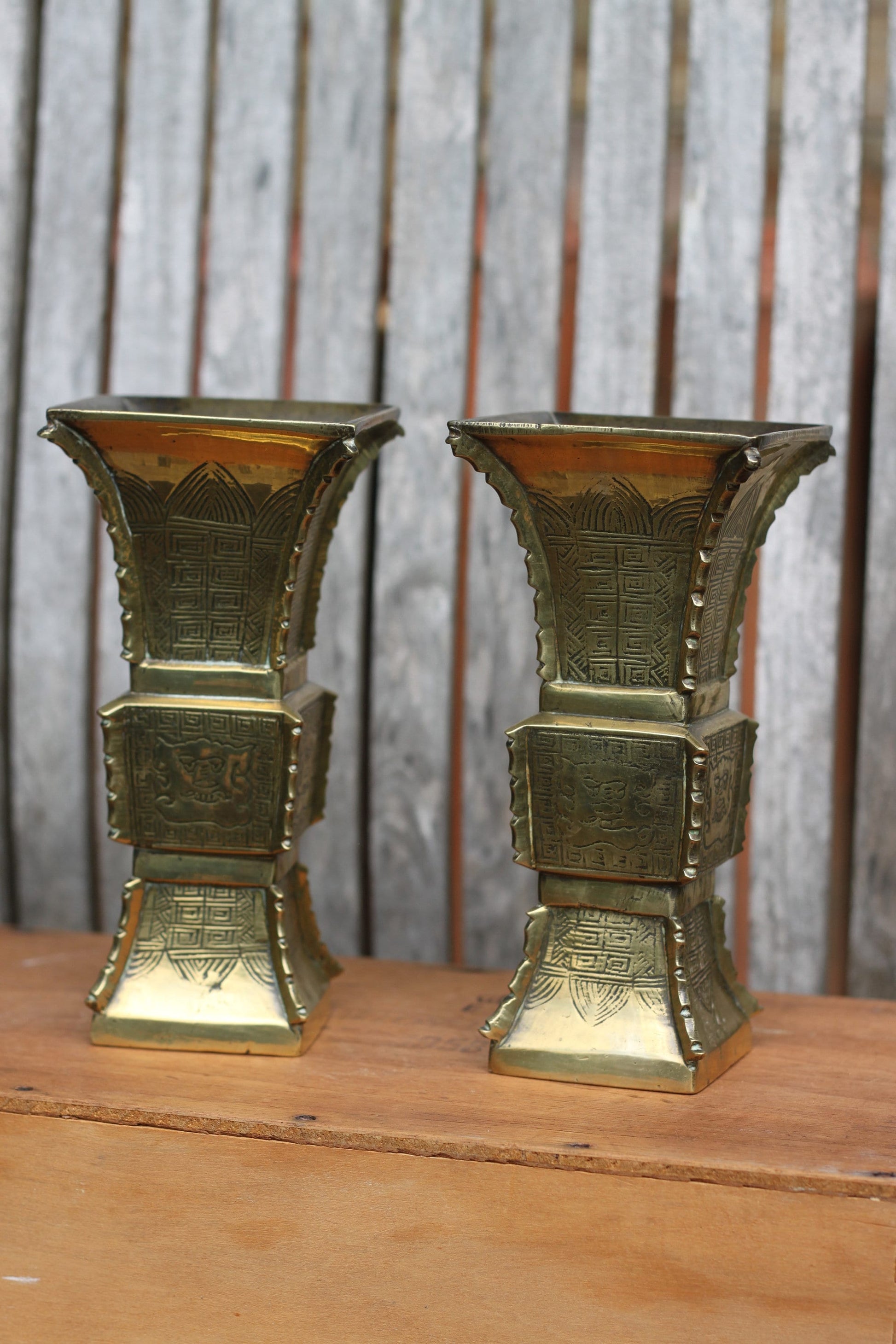 Here we have a pair of Chinese archaic style brass Gu vases, each 19.5cm high - 1.9kg