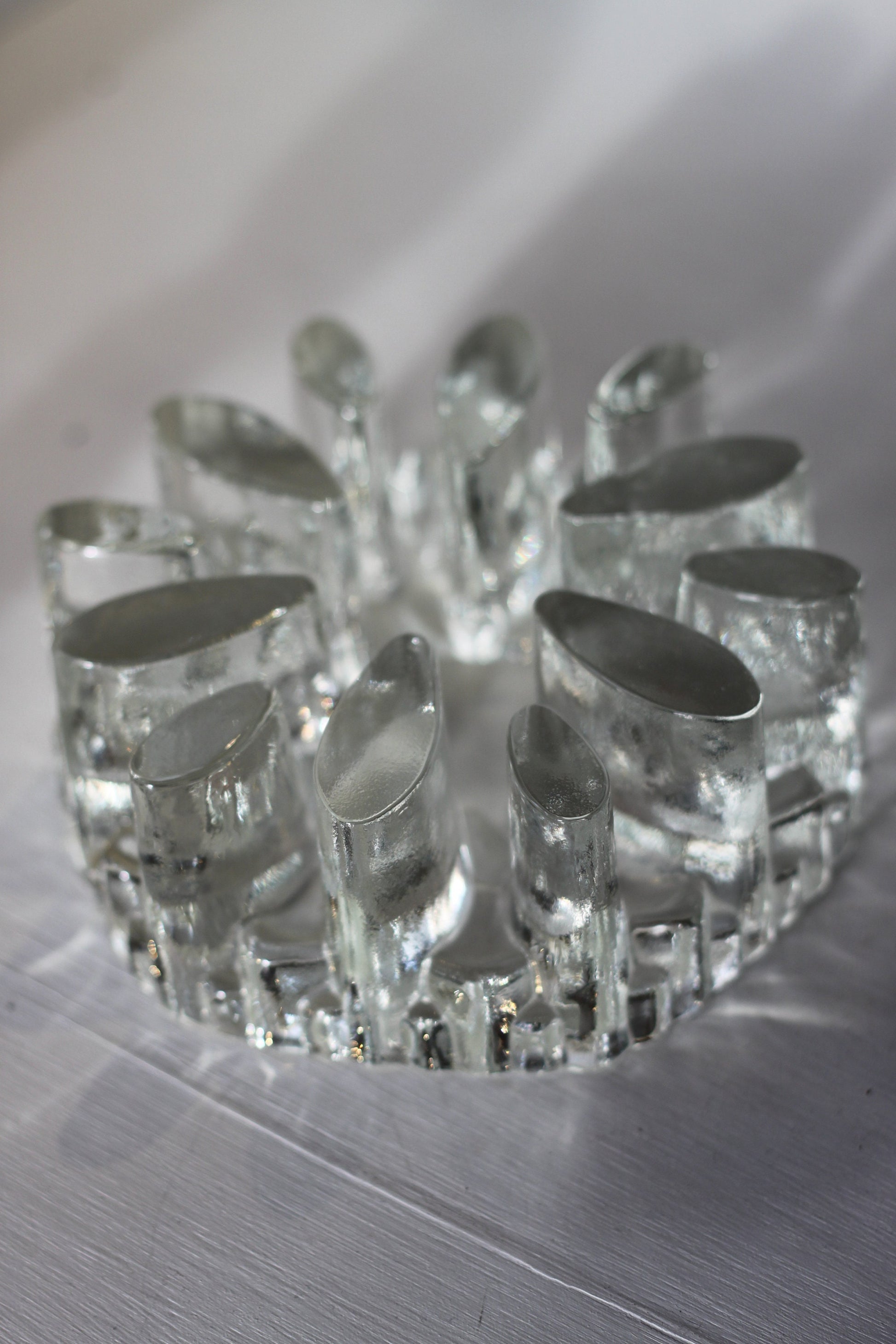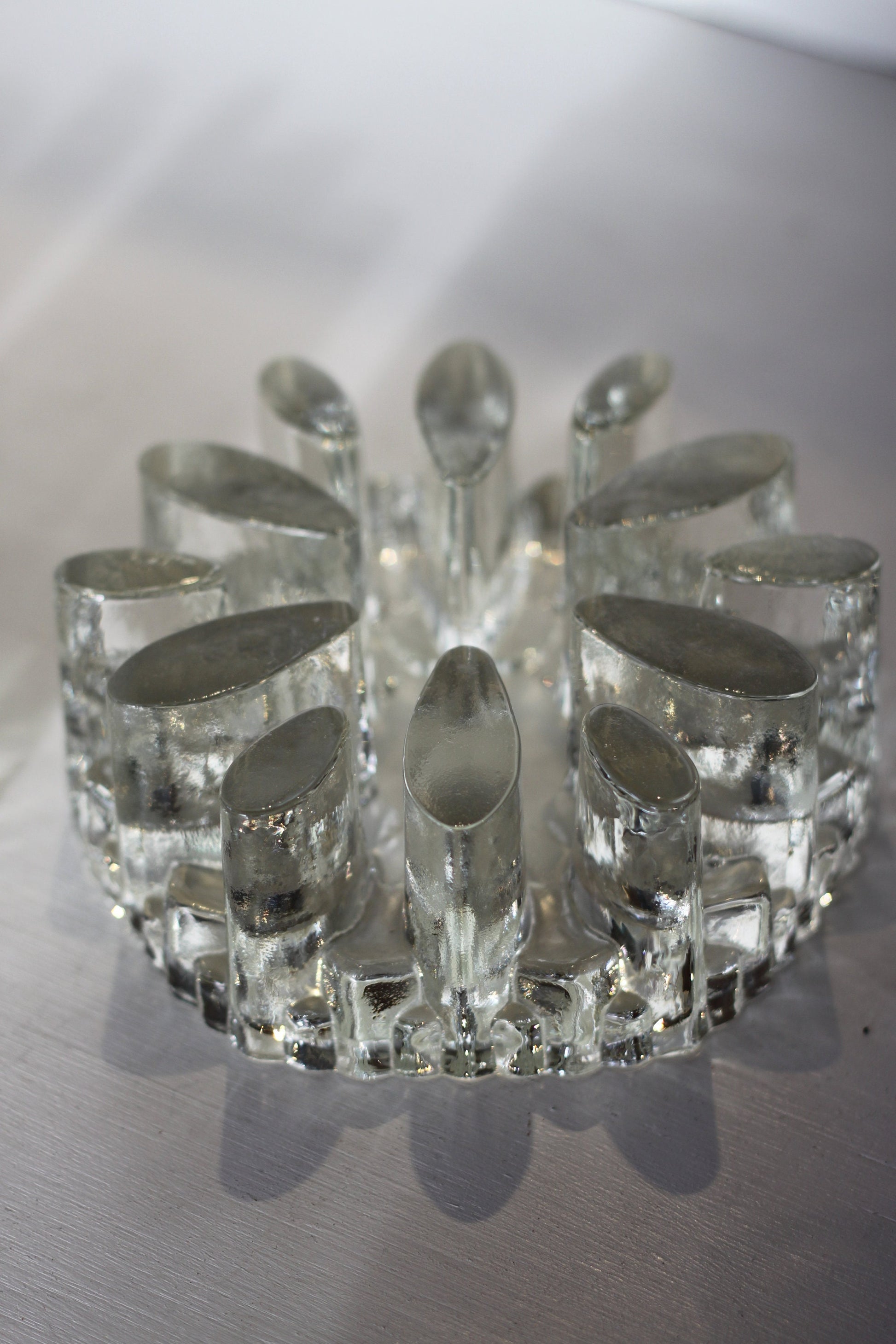 These are in our view have a couple of uses, they will carry a nice size candle when sat with the glass legs pointing up but equally if you turn the piece the other way you can see the feet through the top and would form a flat dish or indeed a candle base etc. But they were originally designed to hold a tealight and to keep pots warm in the centre of the table in the 1970's