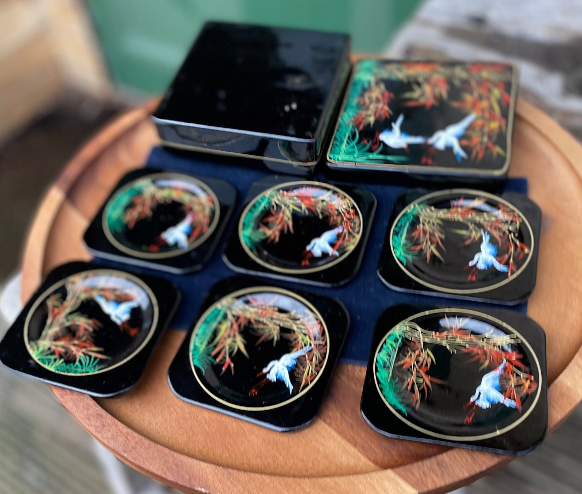 Here we have a set of six boxed Japanese lacquer coasters with hand painted egret and bamboo design 12x12cm box 1950's