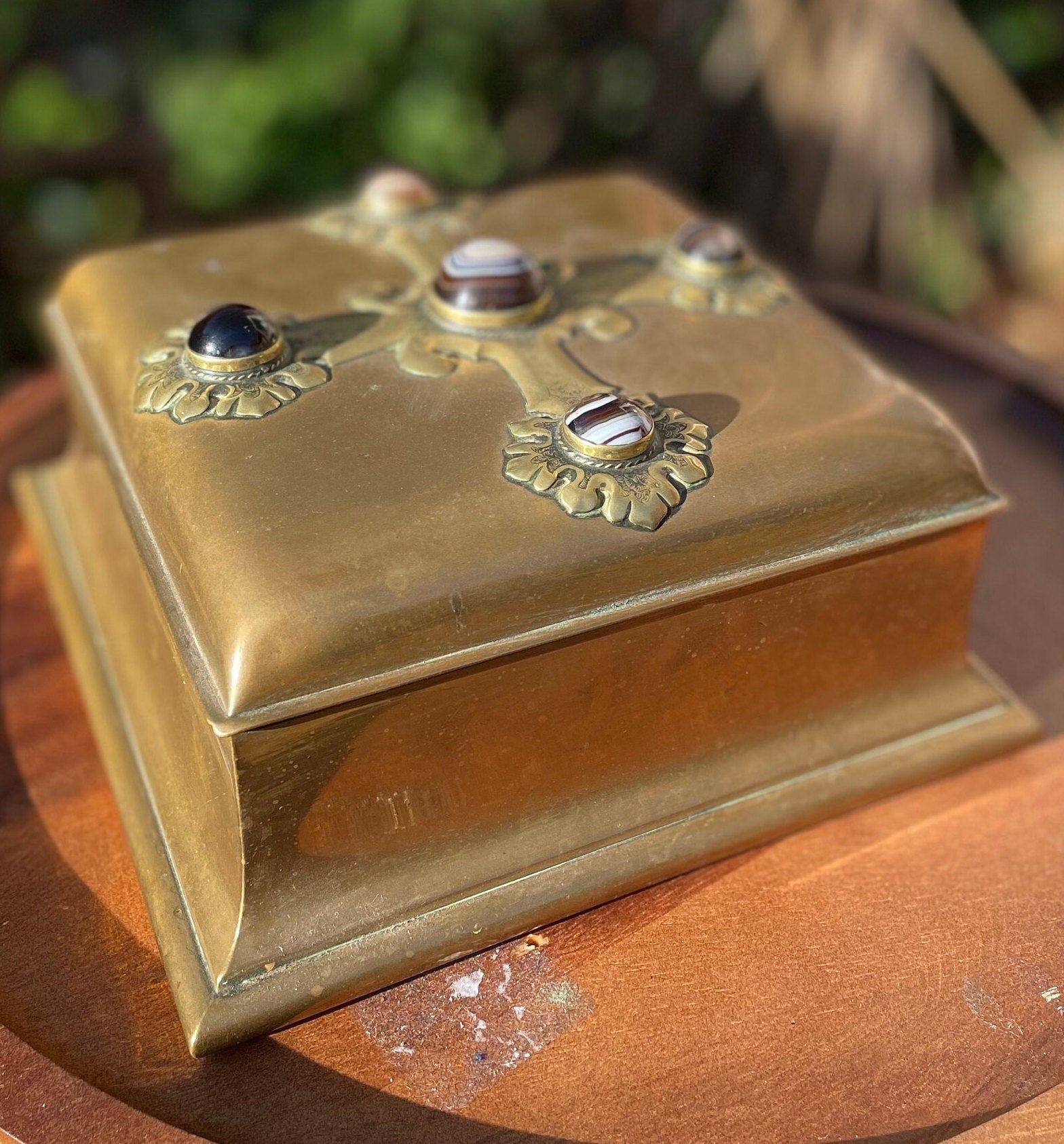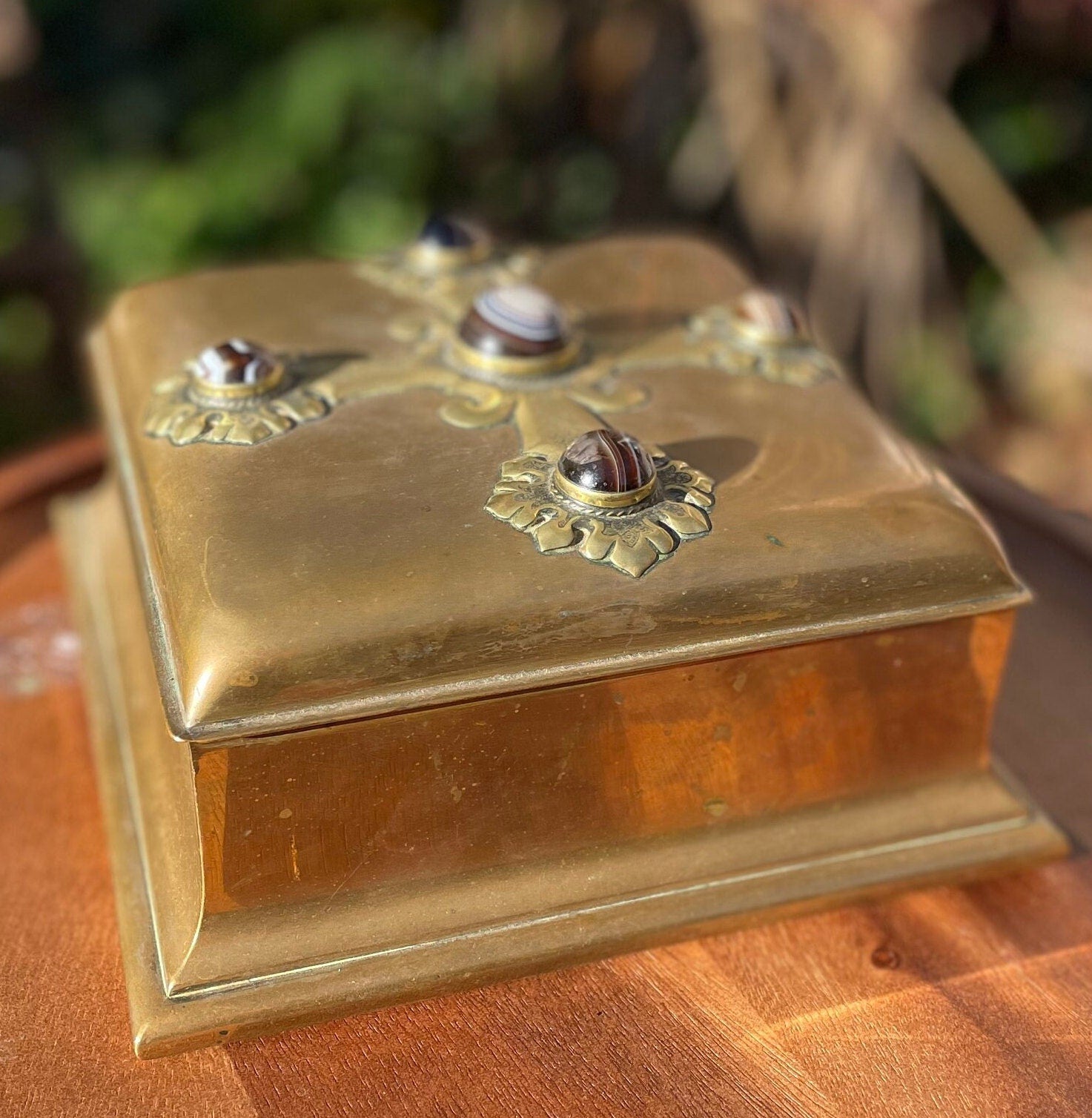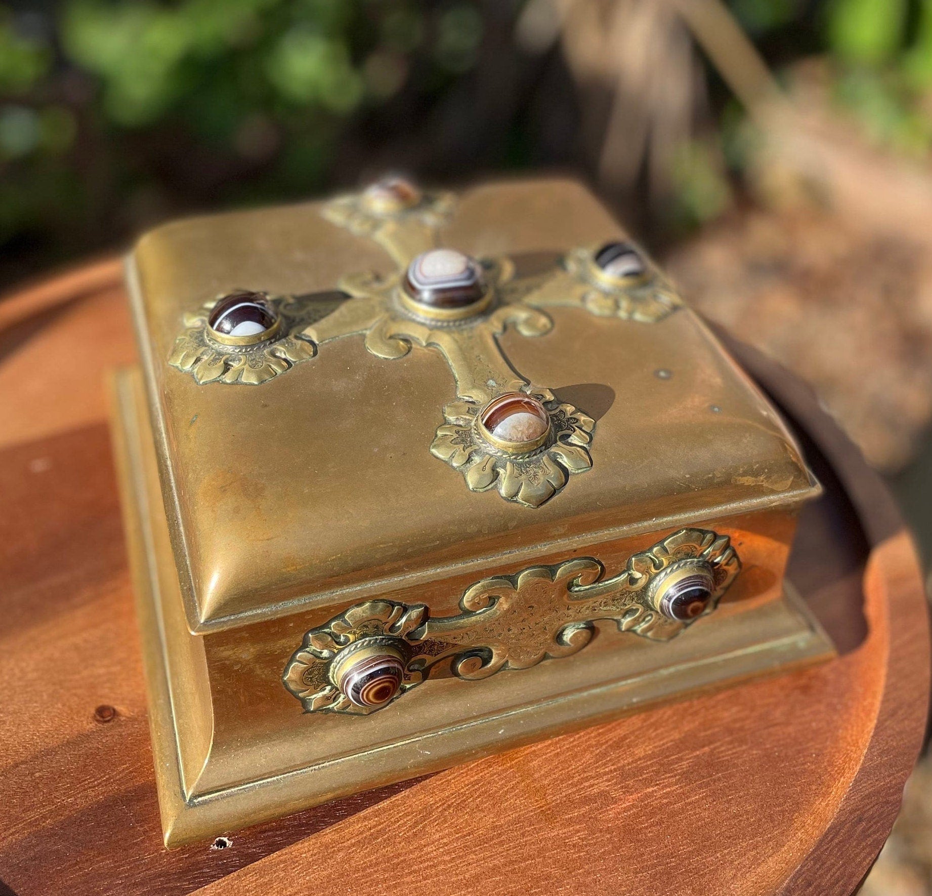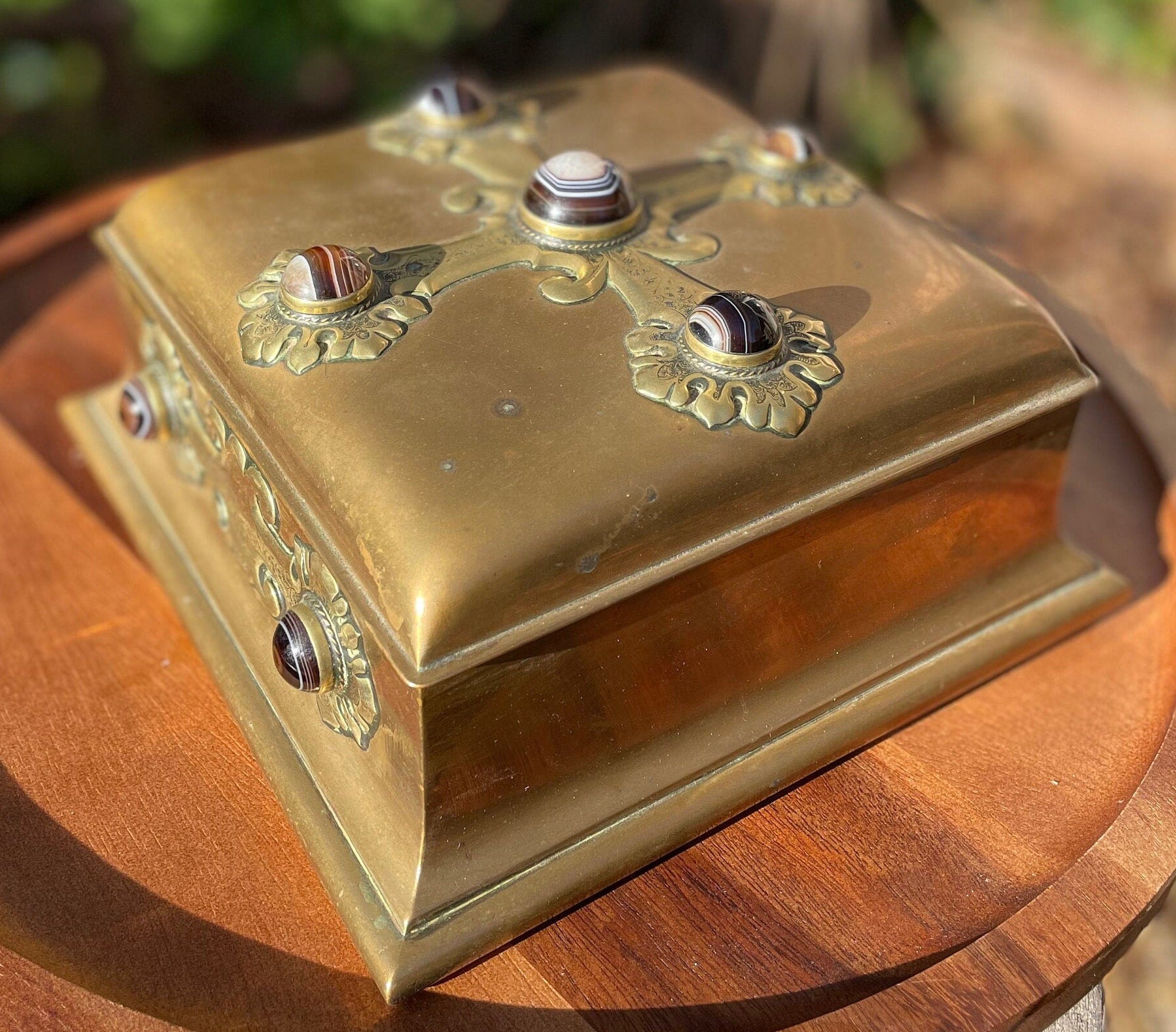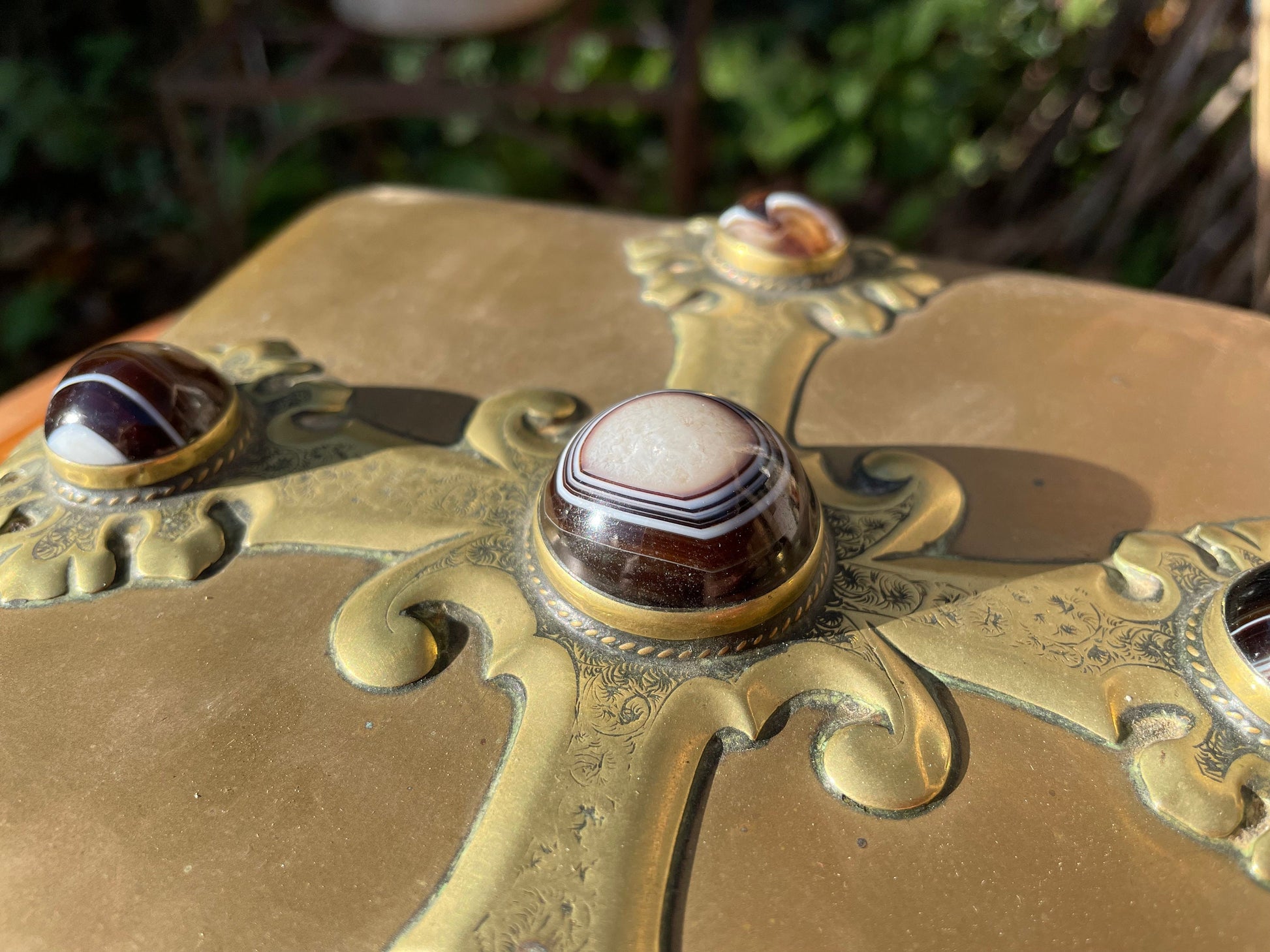 A Very Fine Victorian Brass Table Box Decorated with Cabochon Agate Stones - Stamped Howell James & Co Regent St London c1870 20cm wide