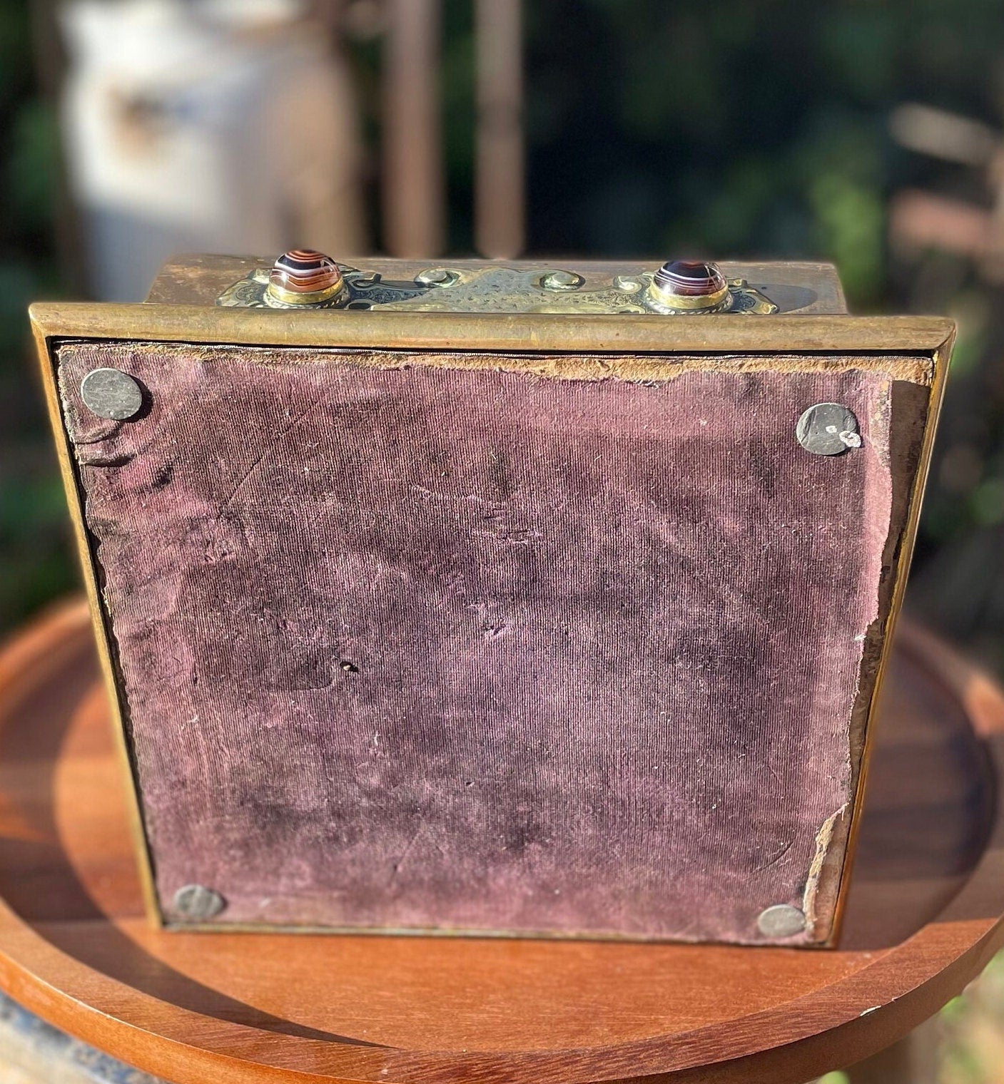 Here we have a very fine Victorian brass table box decorated with Cabochon agate stones - stamped Howell James & Co Regent St London c1870