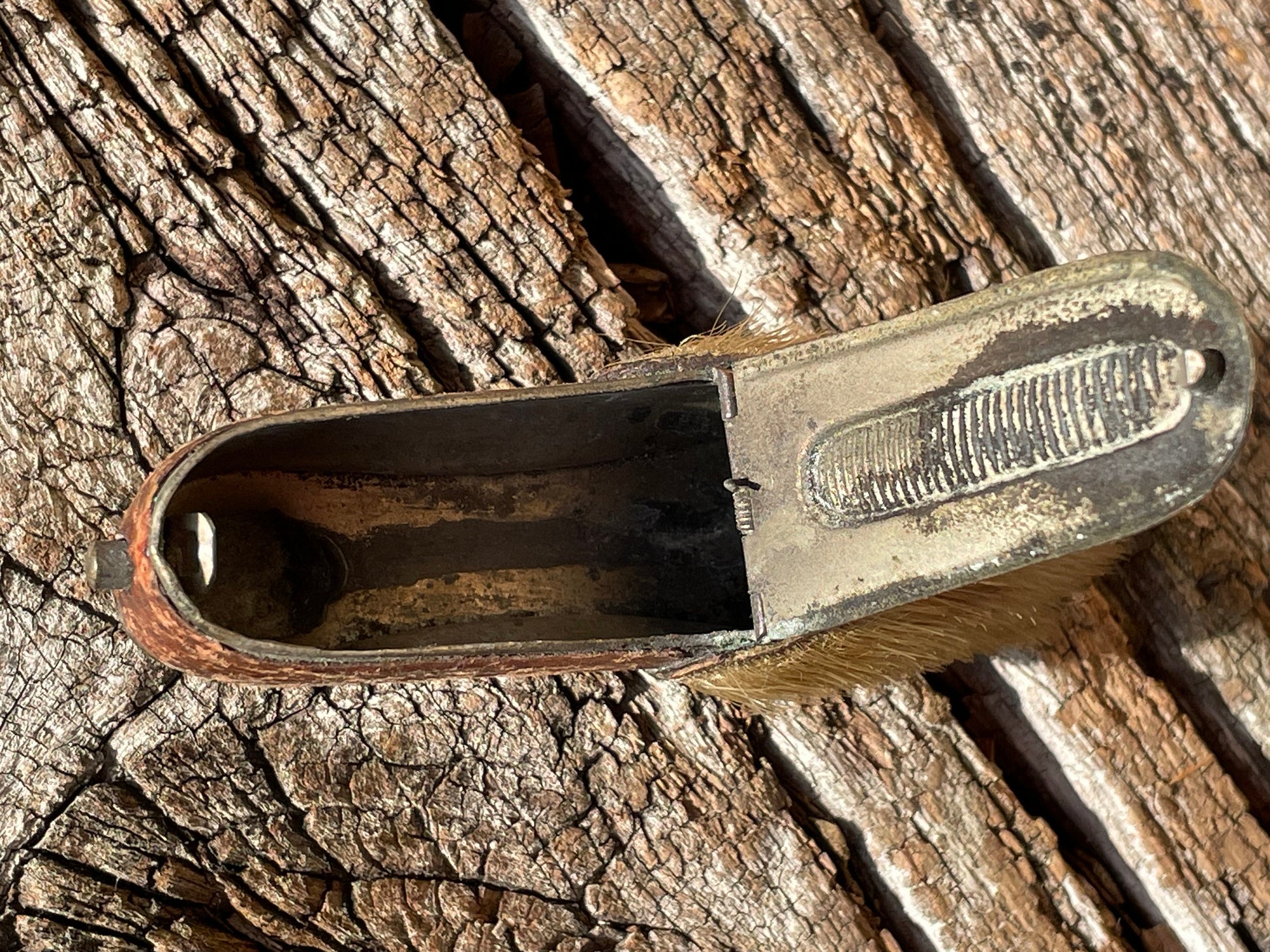 The tiny tiny spring hinge works beautifully triggered by a tiny switch at the heel - once opened the matches would be stored in the shoe and when needed taken out and struck on the ribbed top - Highly collectable