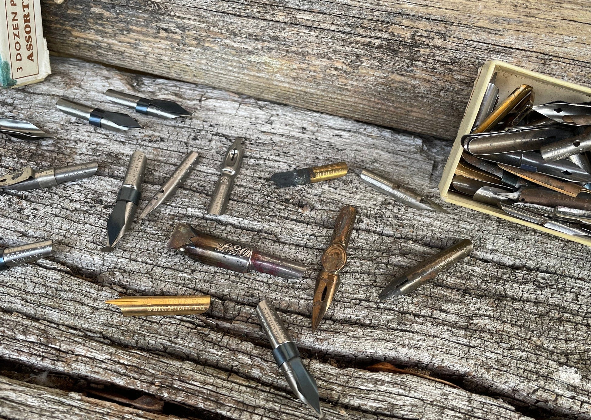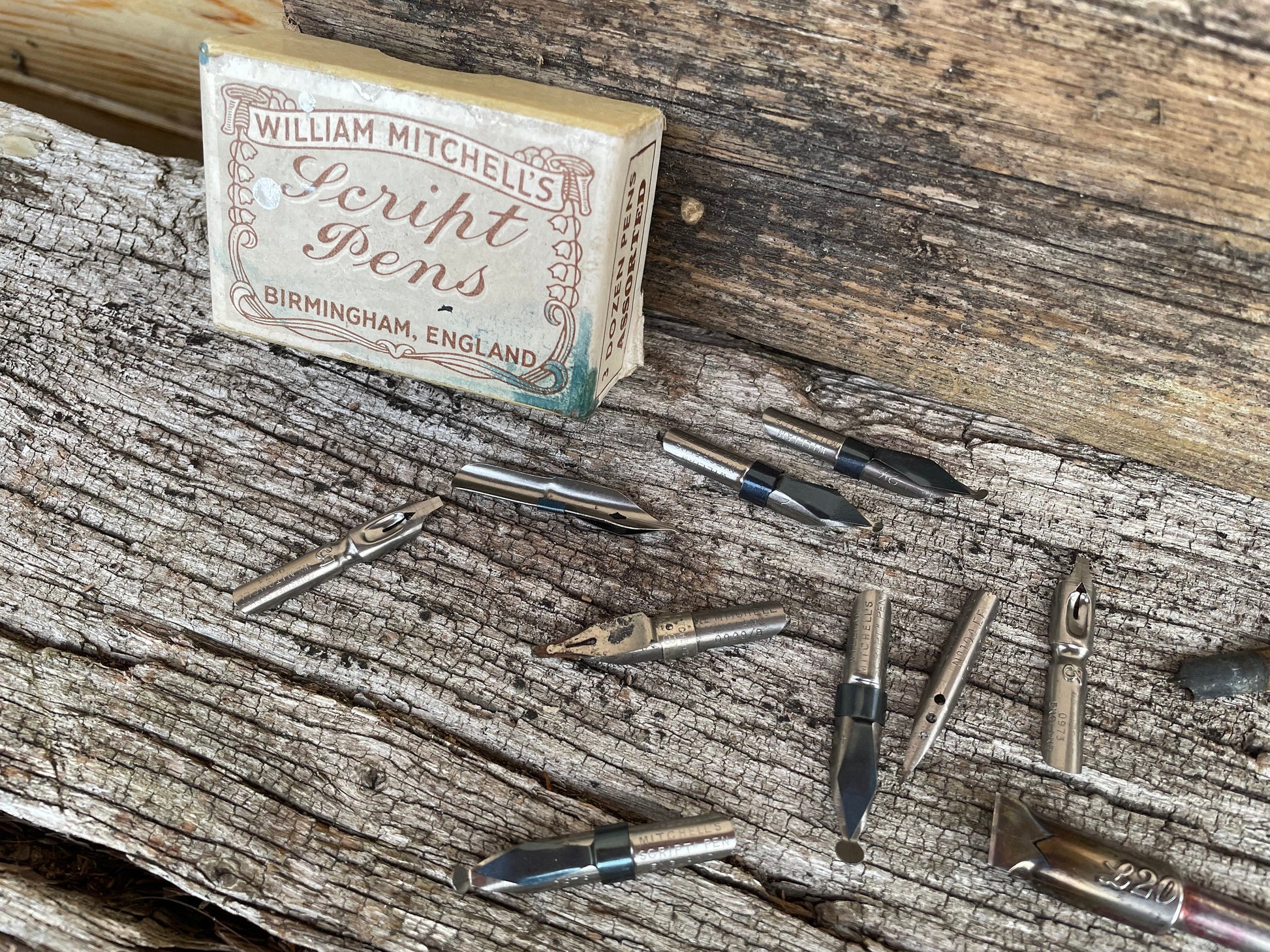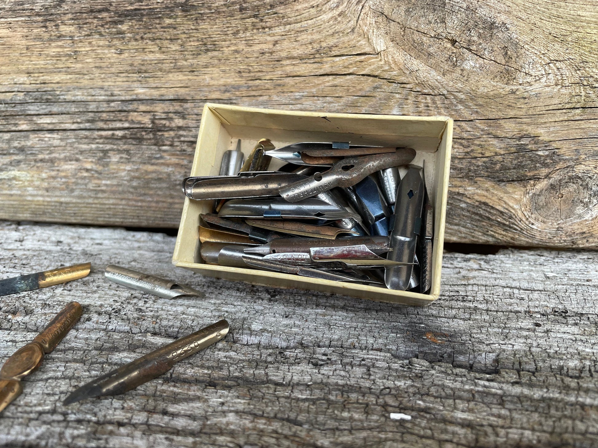 This is a lucky dip nib box with a lovely collection of different nibs such as script, left hand, Shellfish, lino cutter, Decro, Shakespeare - they are unused from old stock approx. 50 in all