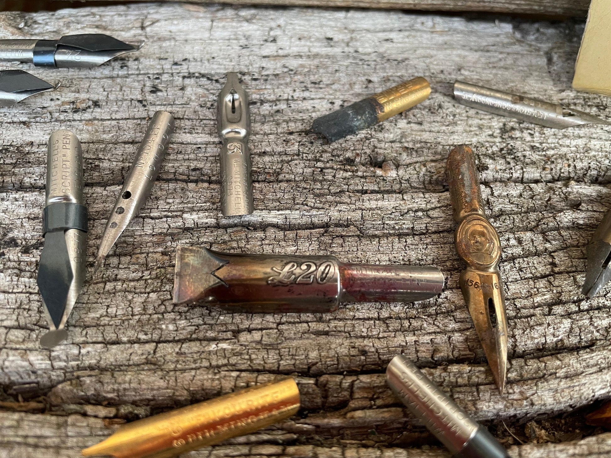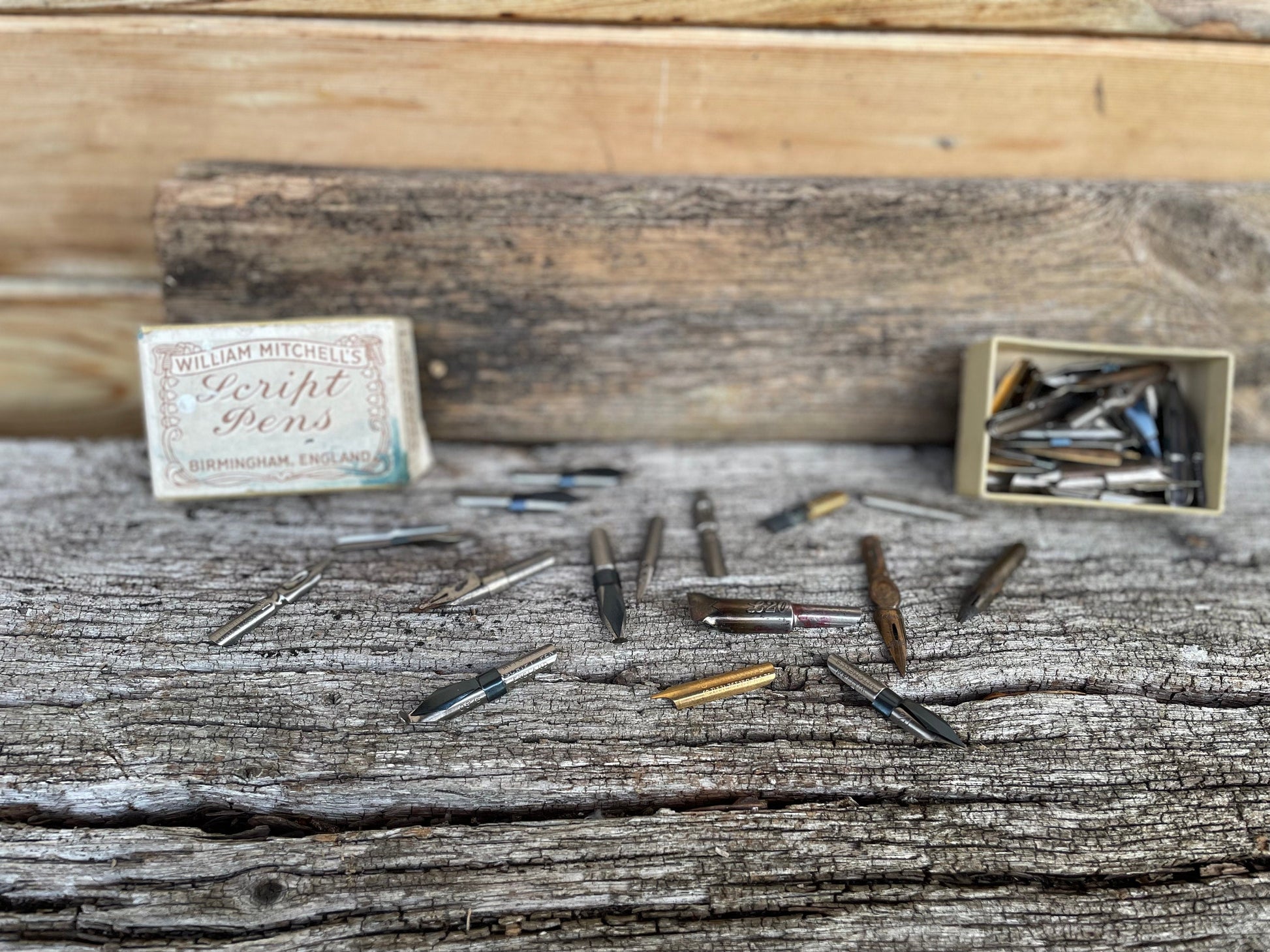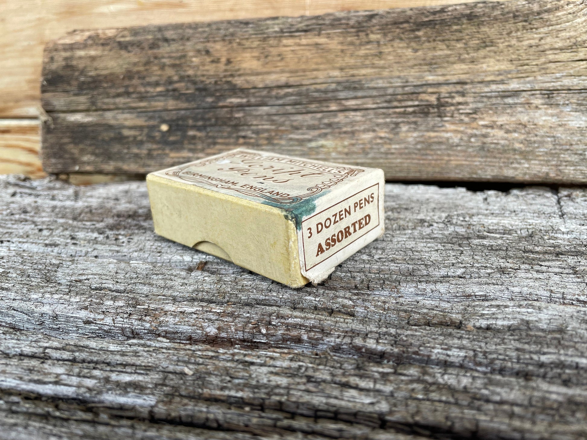 This is a lucky dip nib box with a lovely collection of different nibs such as script, left hand, Shellfish, lino cutter, Decro, Shakespeare - they are unused from old stock approx. 50 in all