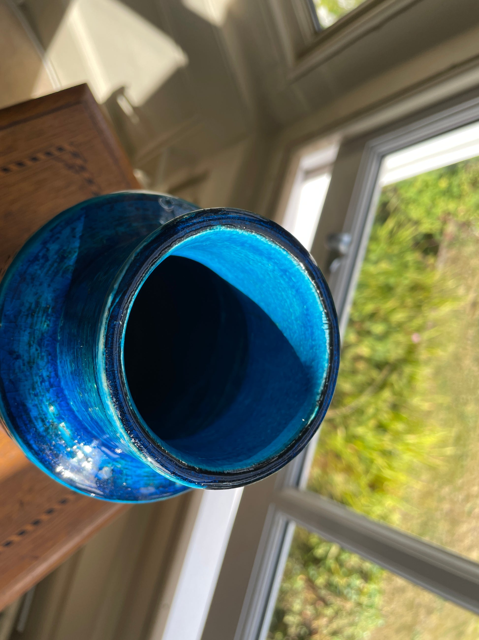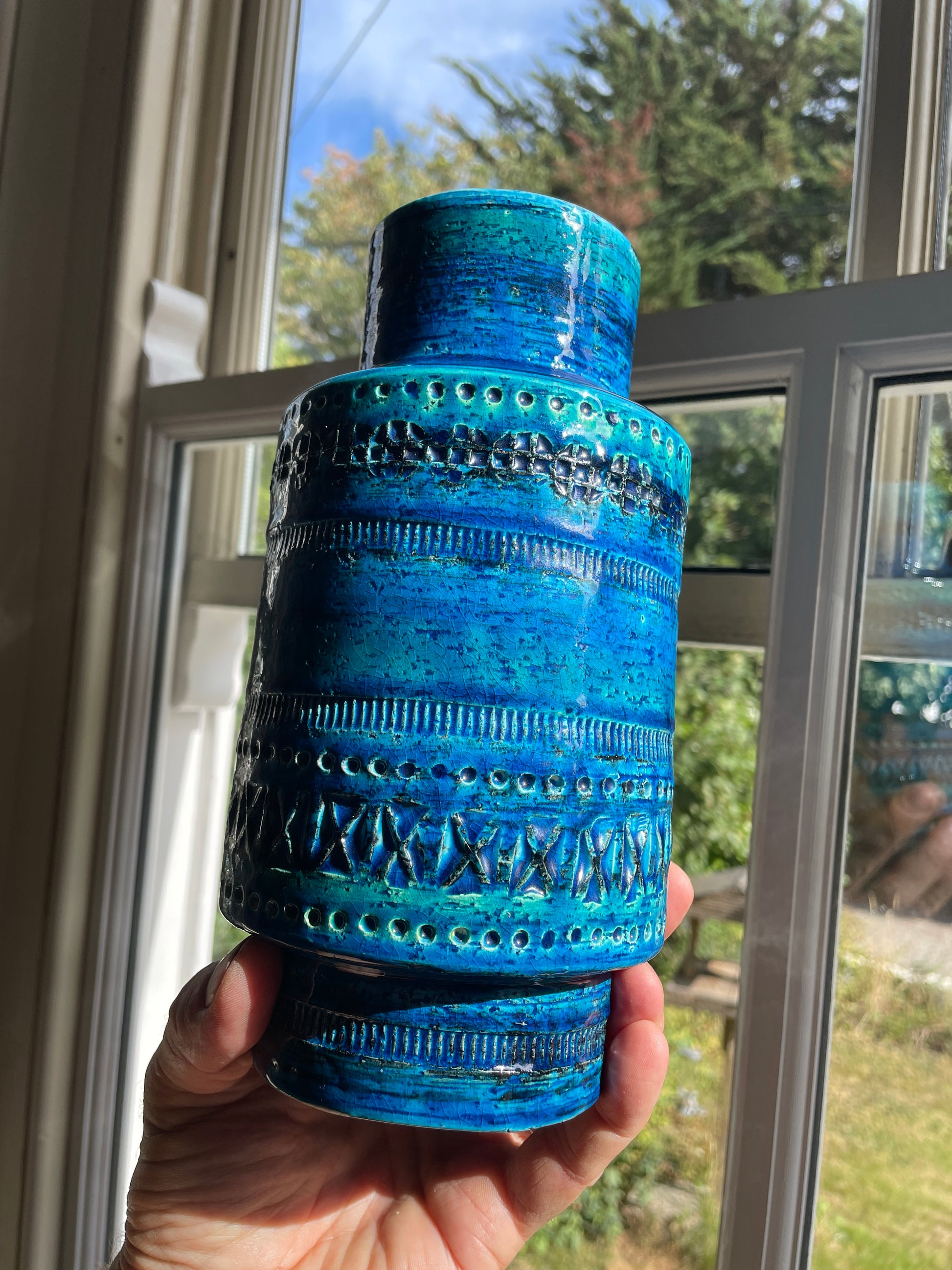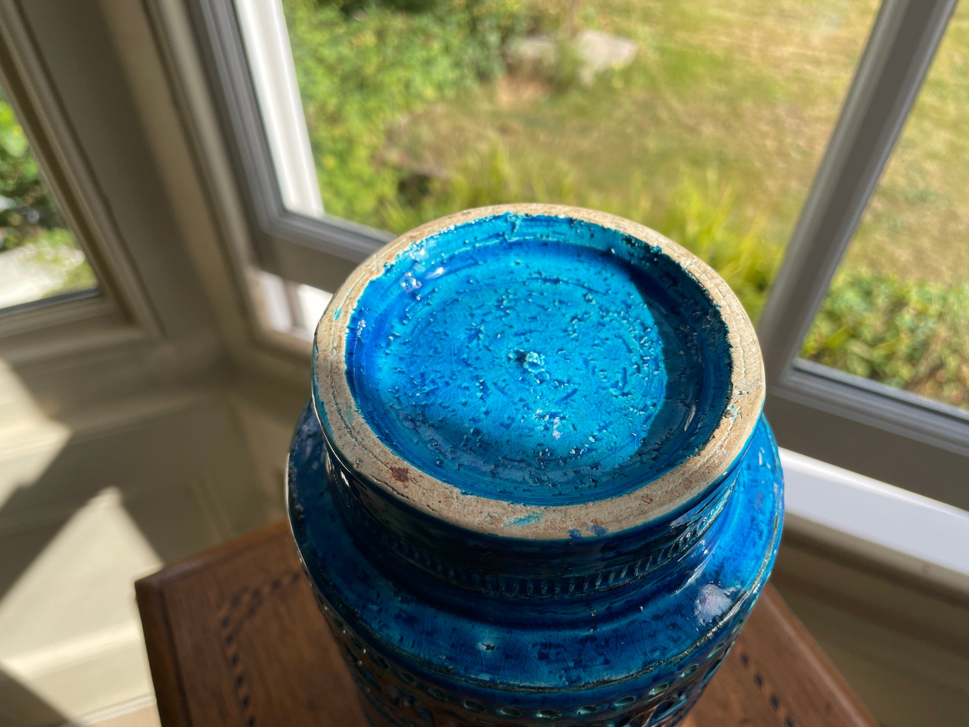 Aldo Londi for Bitossi Rimini Blu Vase – Mid Century Italian Pottery, 22.5cm Turquoise & Cobalt Geometric Glaze, c.1960s