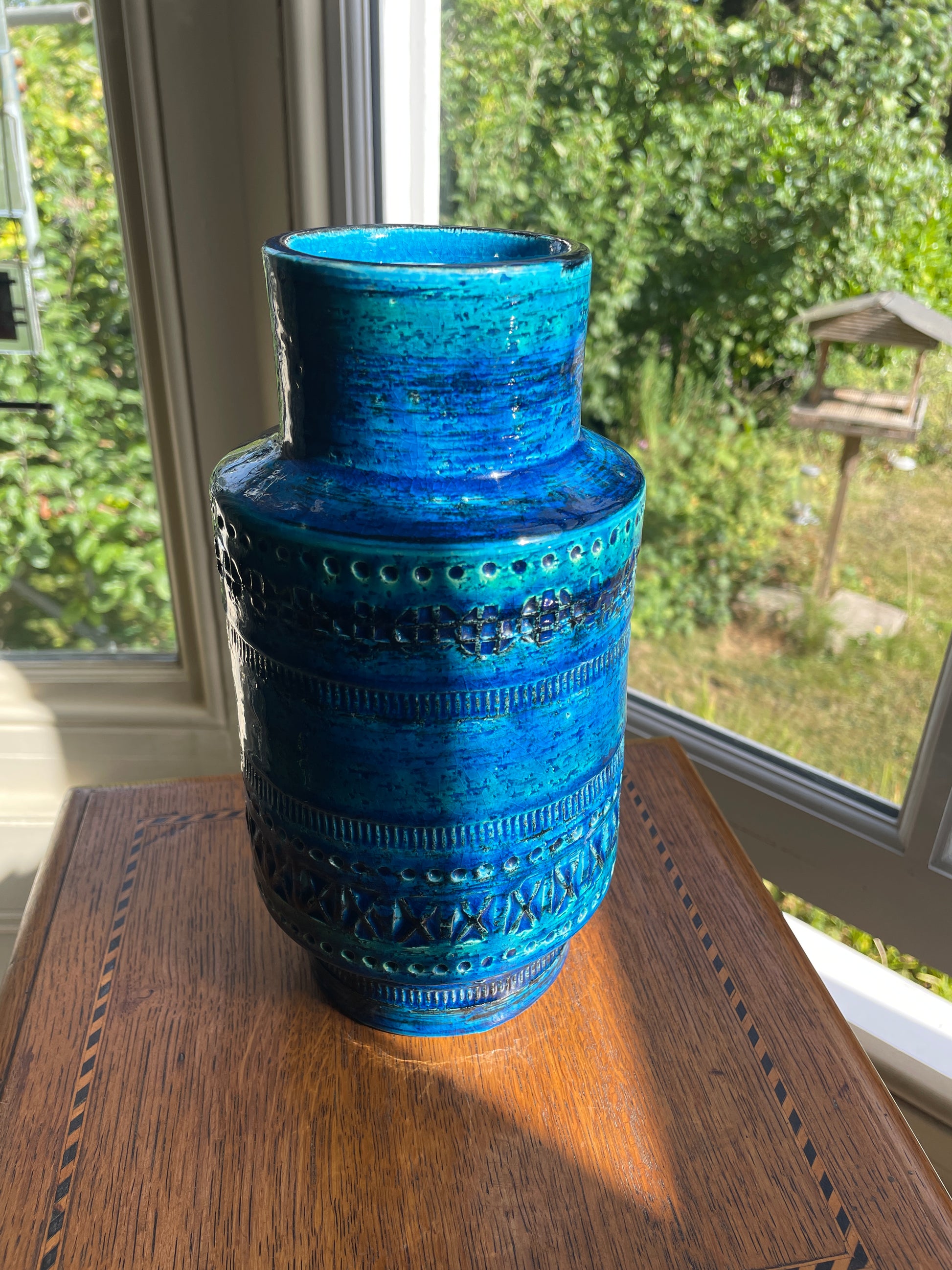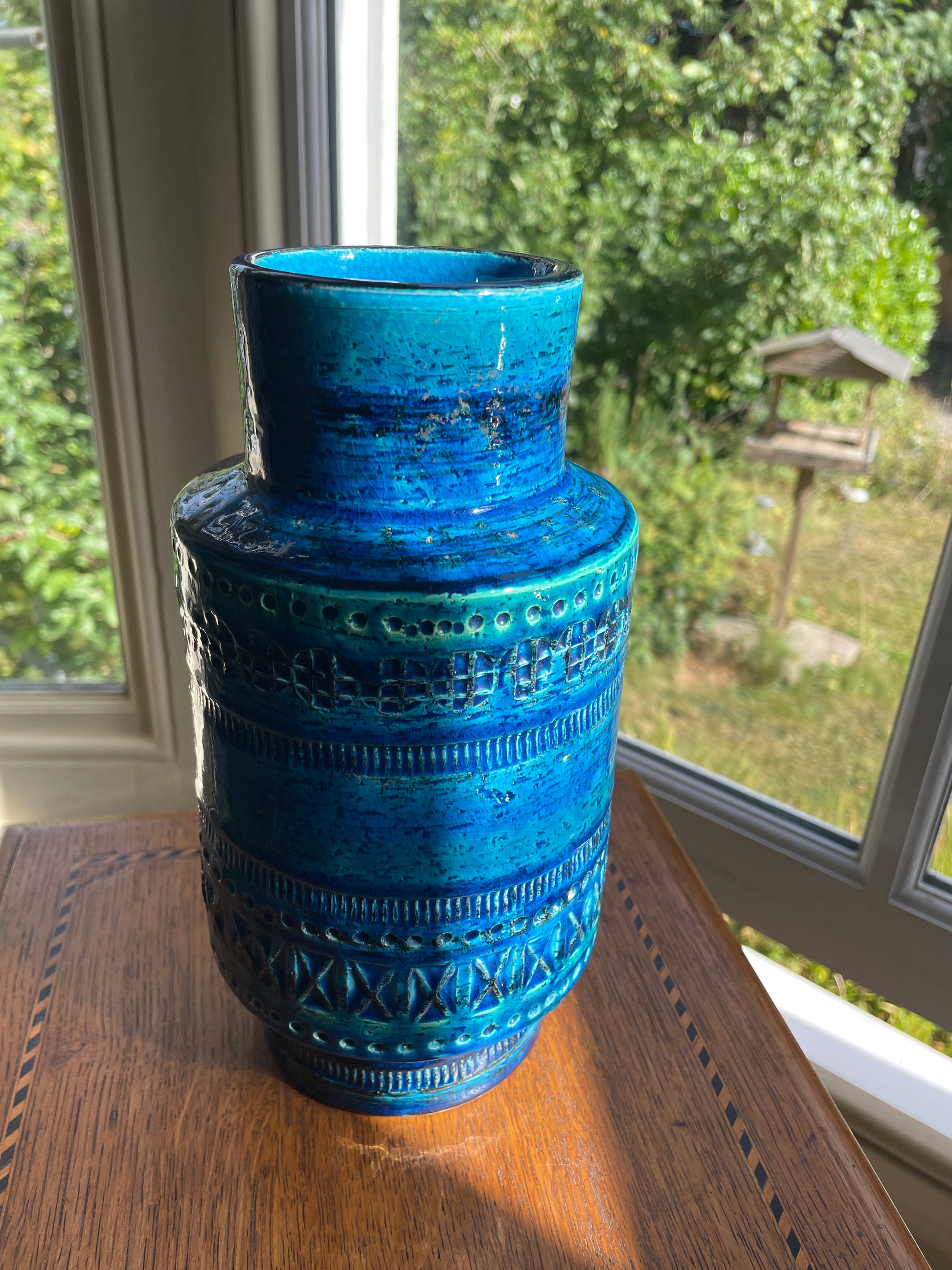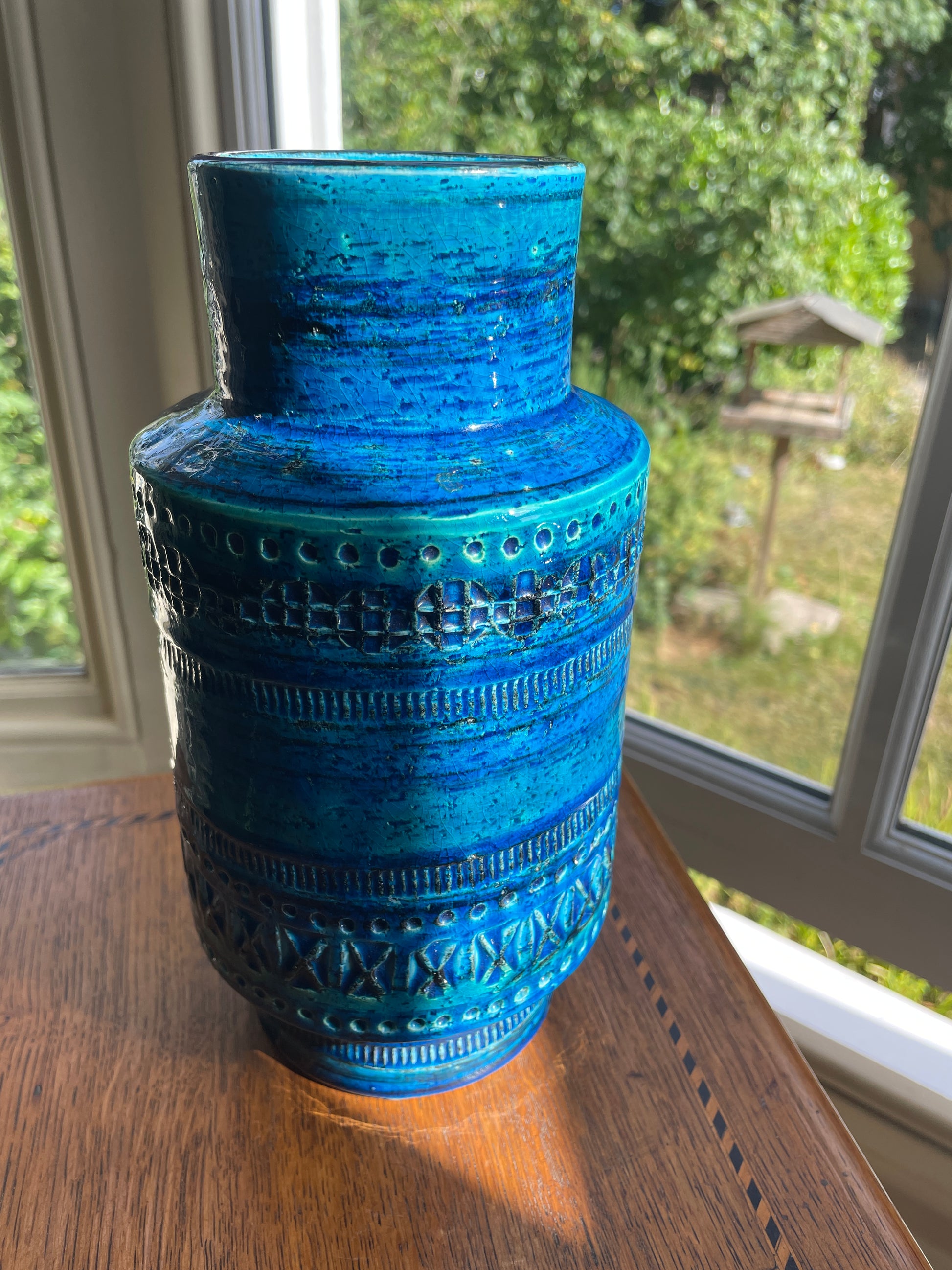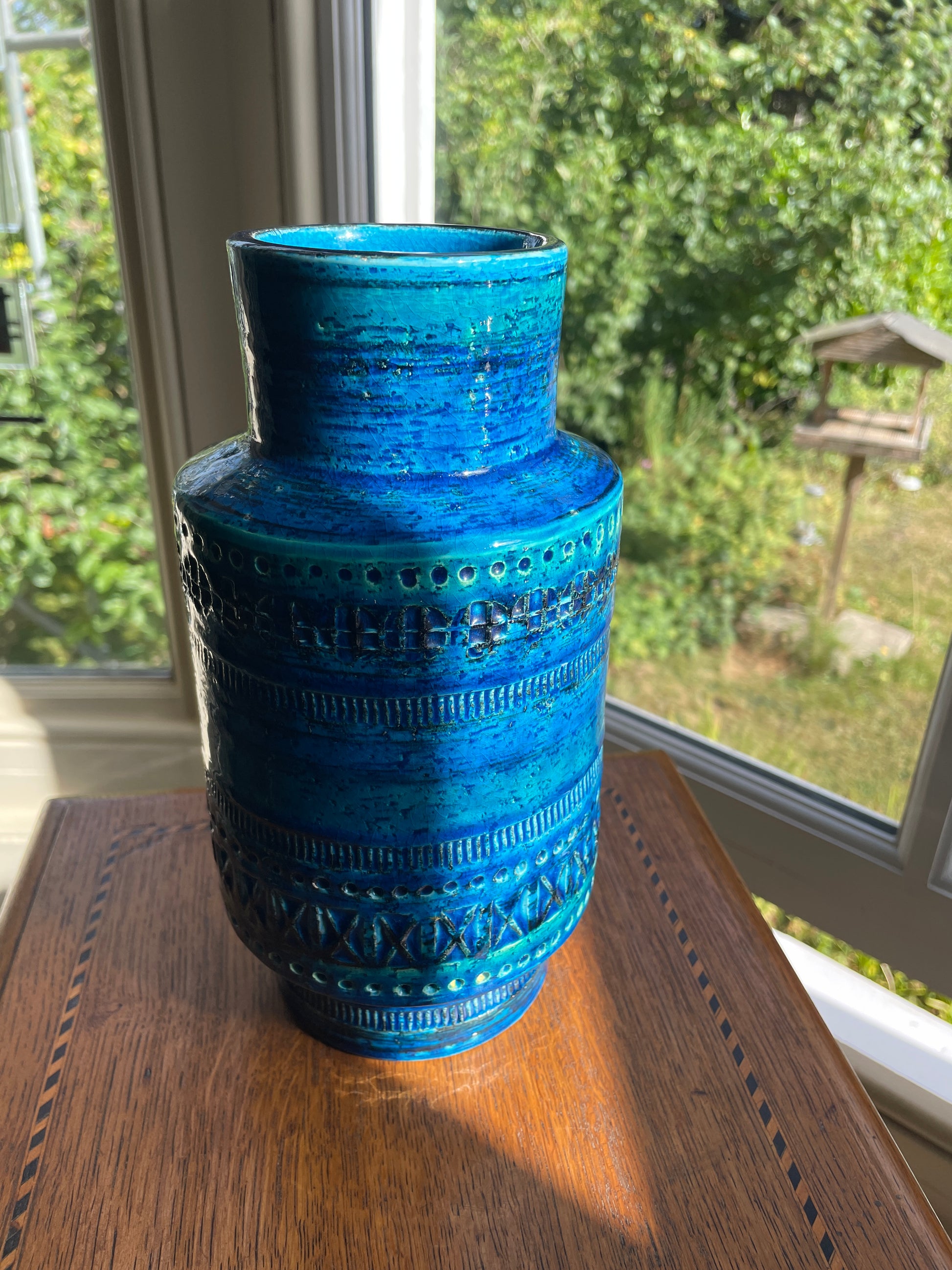 Aldo Londi for Bitossi Rimini Blu Vase – Mid Century Italian Pottery, 22.5cm Turquoise & Cobalt Geometric Glaze, c.1960s