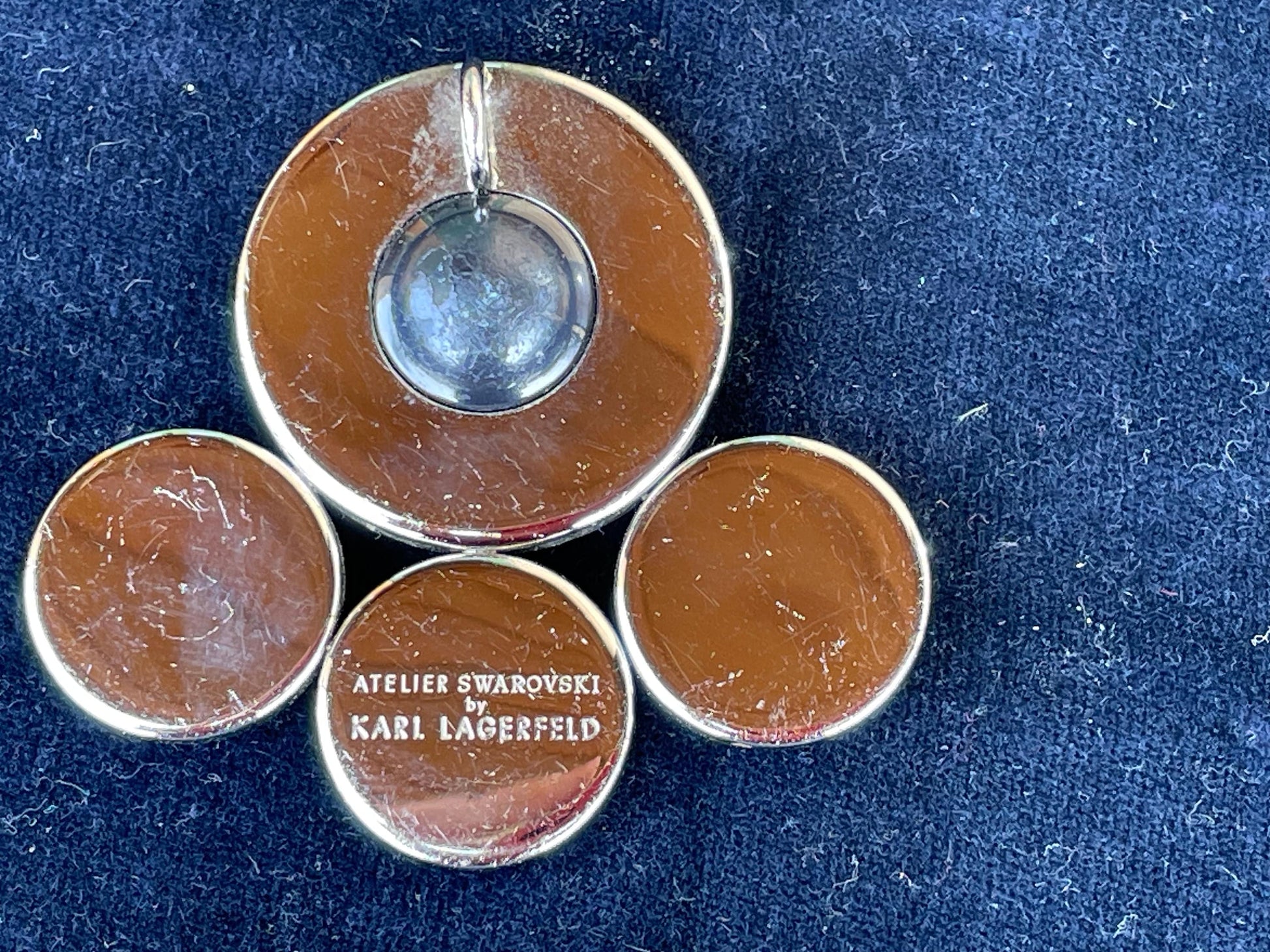 Measuring 55mm across (approx. 2.2 inches), this pendant features a fixed bail loop on the reverse, allowing it to be worn on a chain or ribbon as a dramatic focal necklace. The reverse is stamped “Atelier Swarovski by Karl Lagerfeld”, confirming its authenticity and origin.