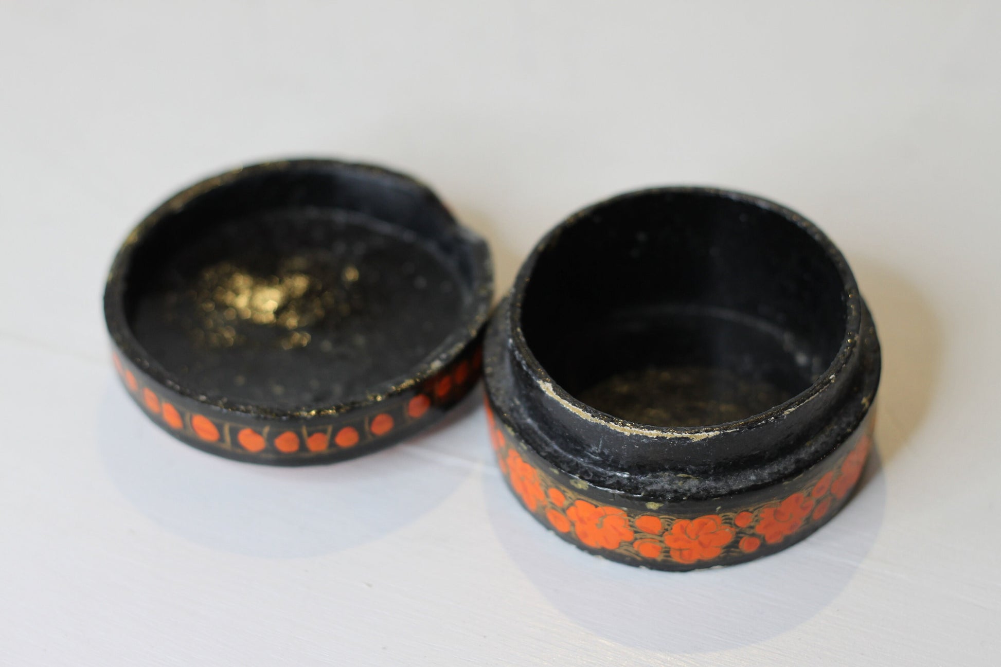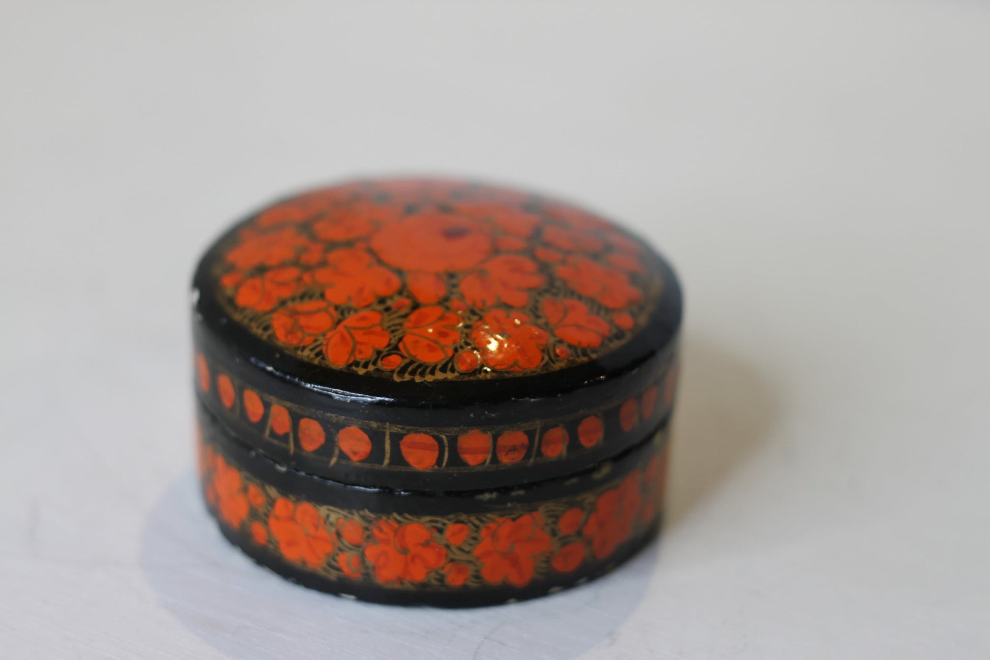 Here we have an Indian lacquered papier-mch box and cover hand painted with orange flowers
