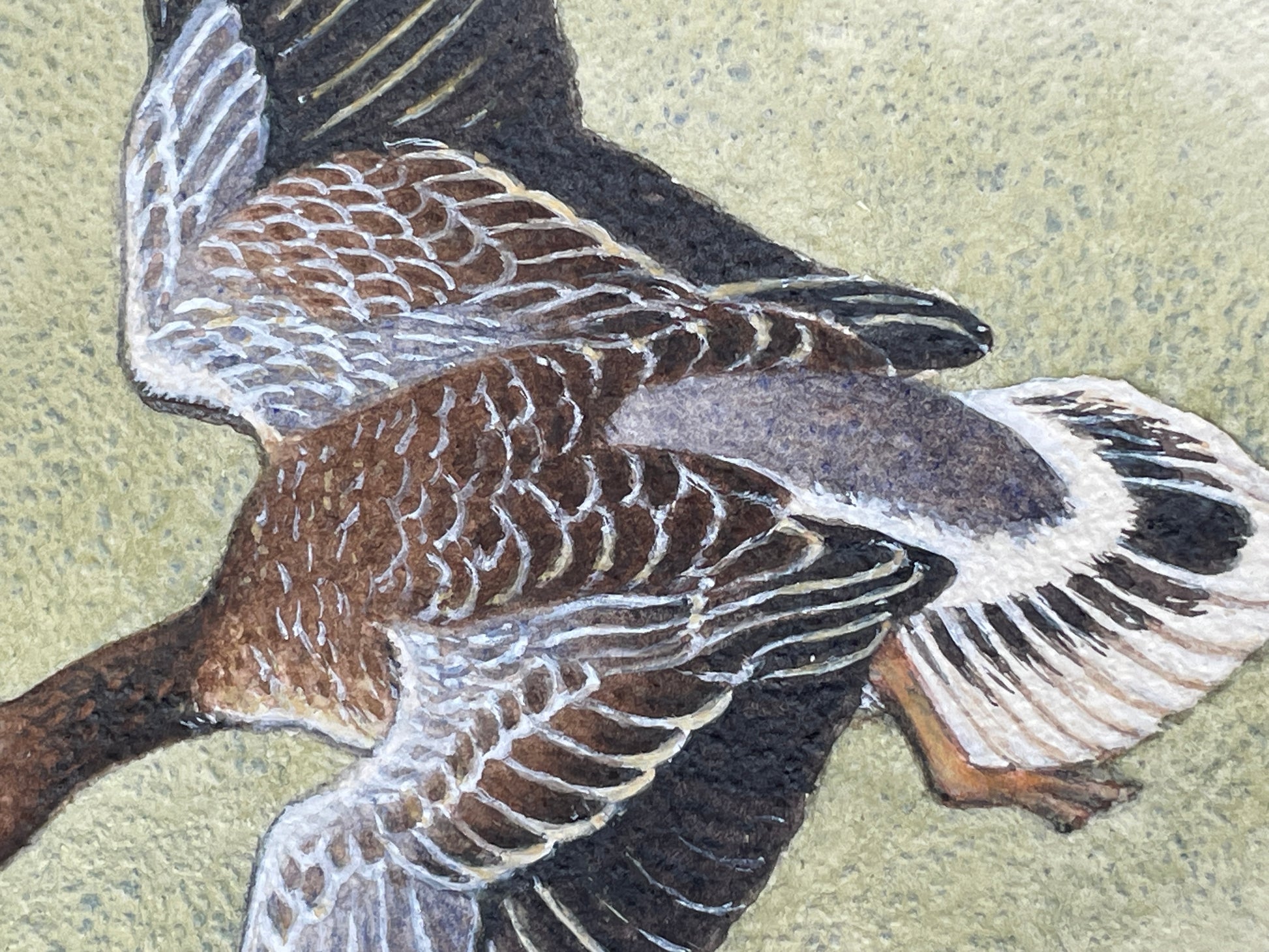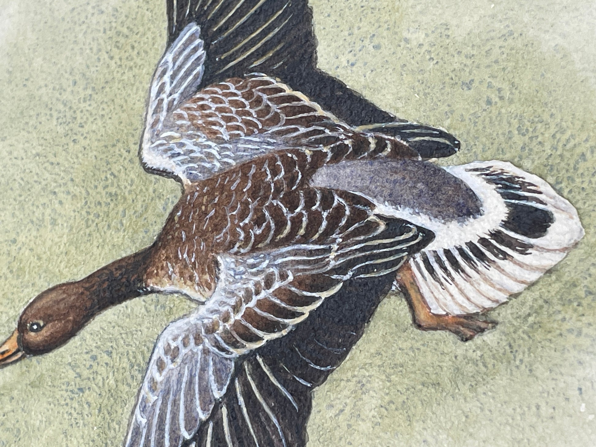 An original Herbert Ahier watercolour on paper of a duck in flight 19x19cm