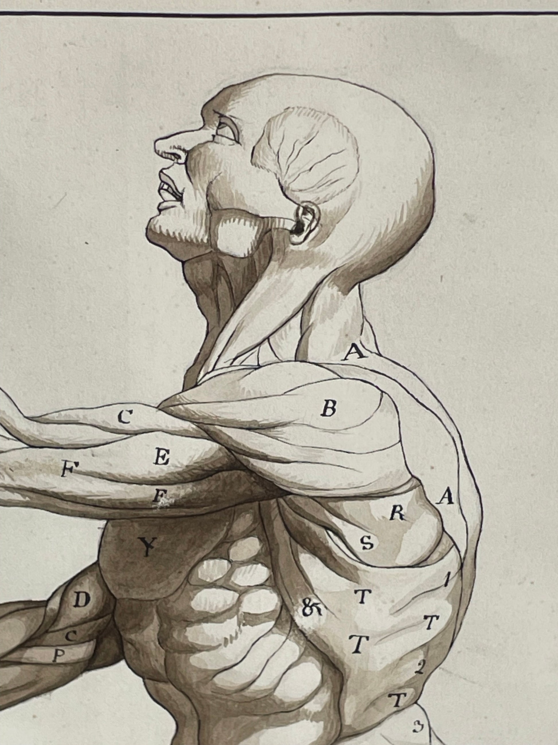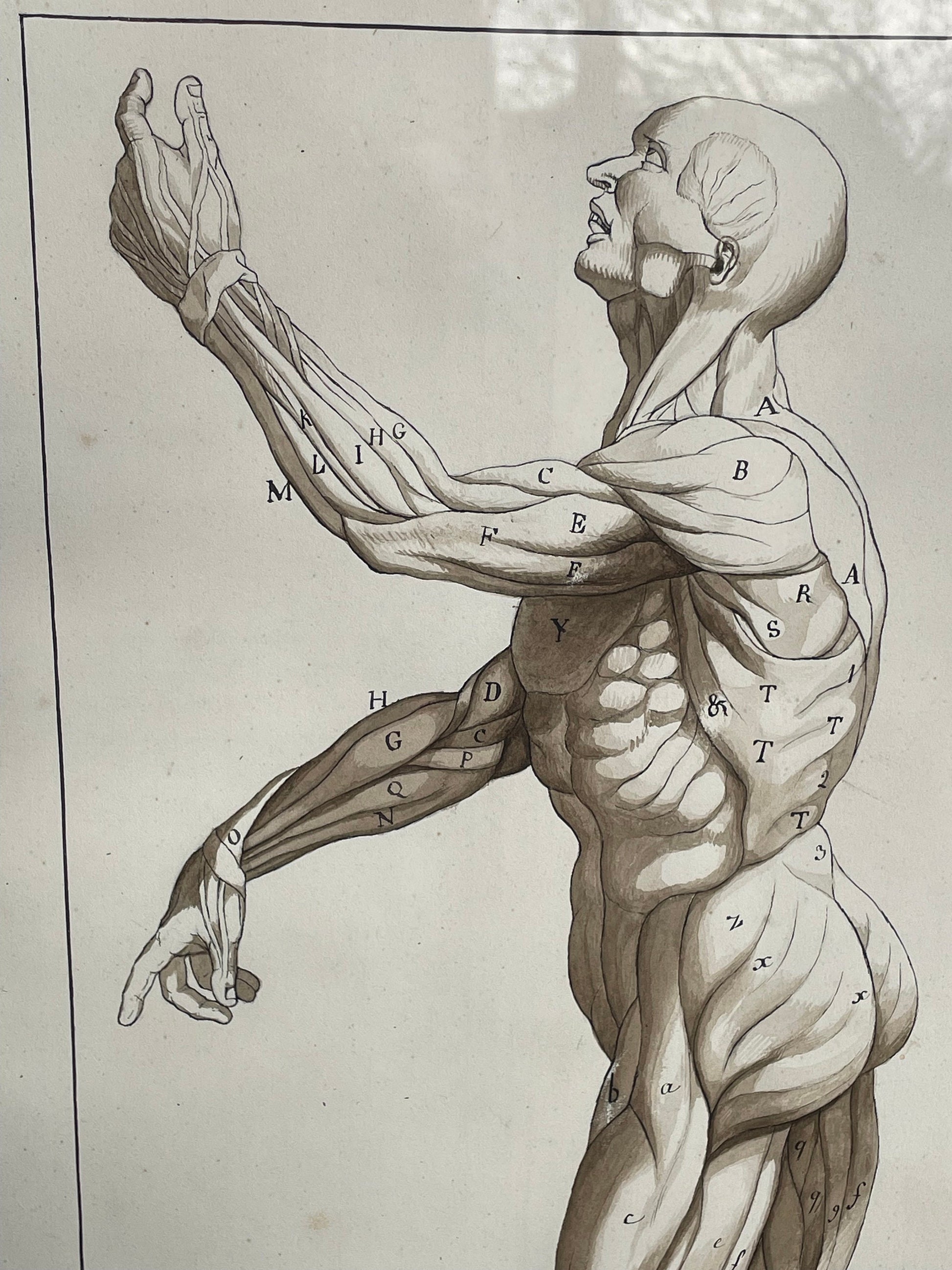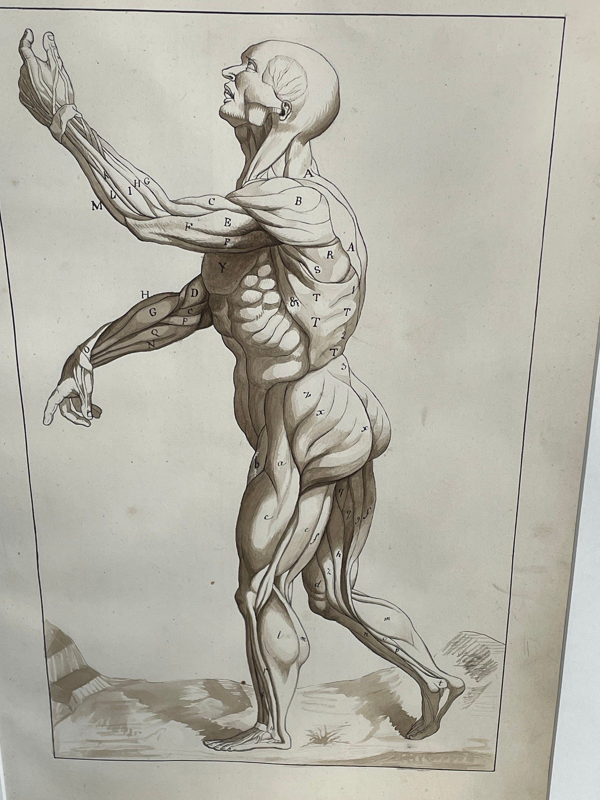 An original ink and wash on paper human musculature framed print, after Andreas Vesalius plate size 46 x 29cm