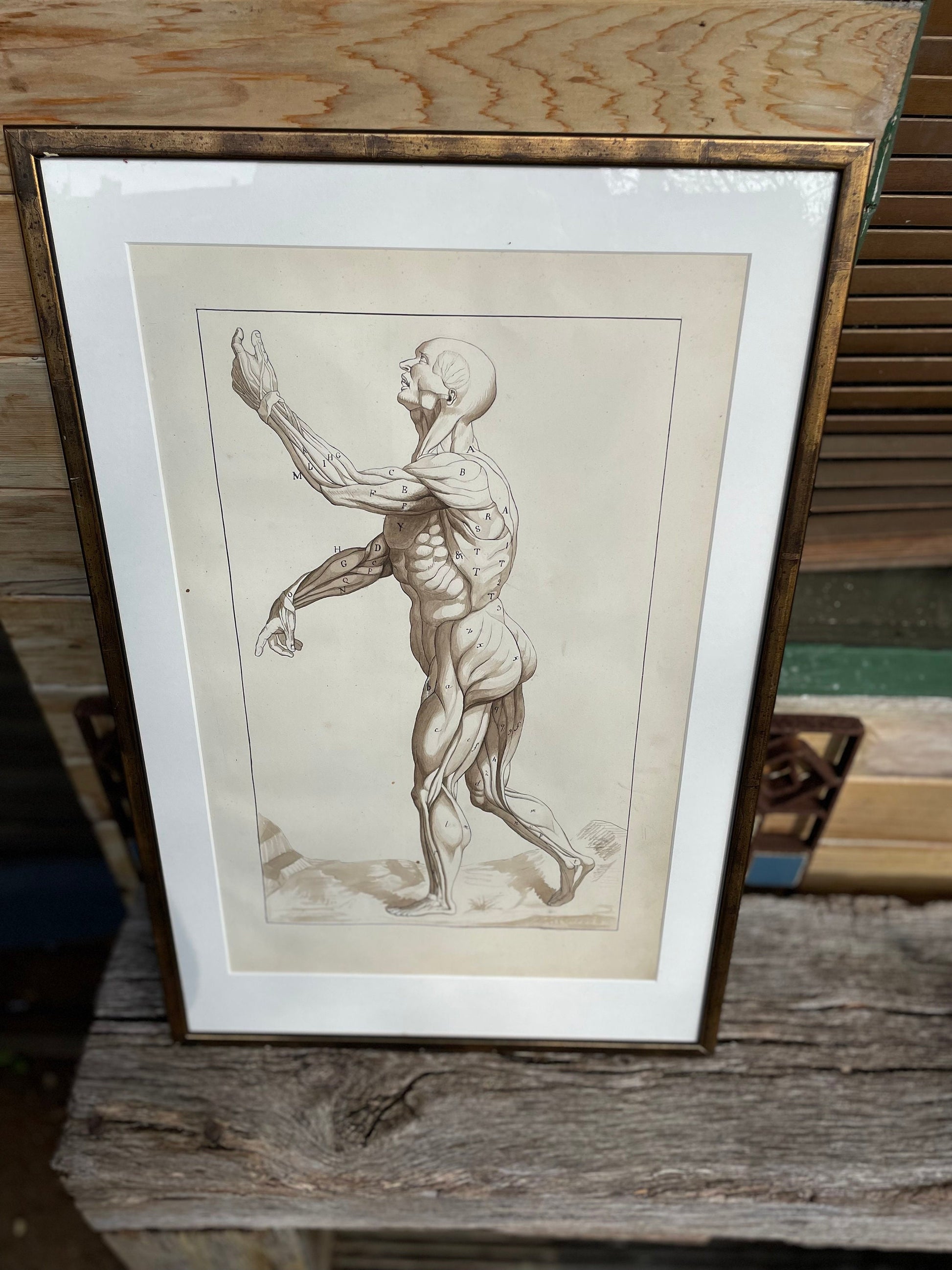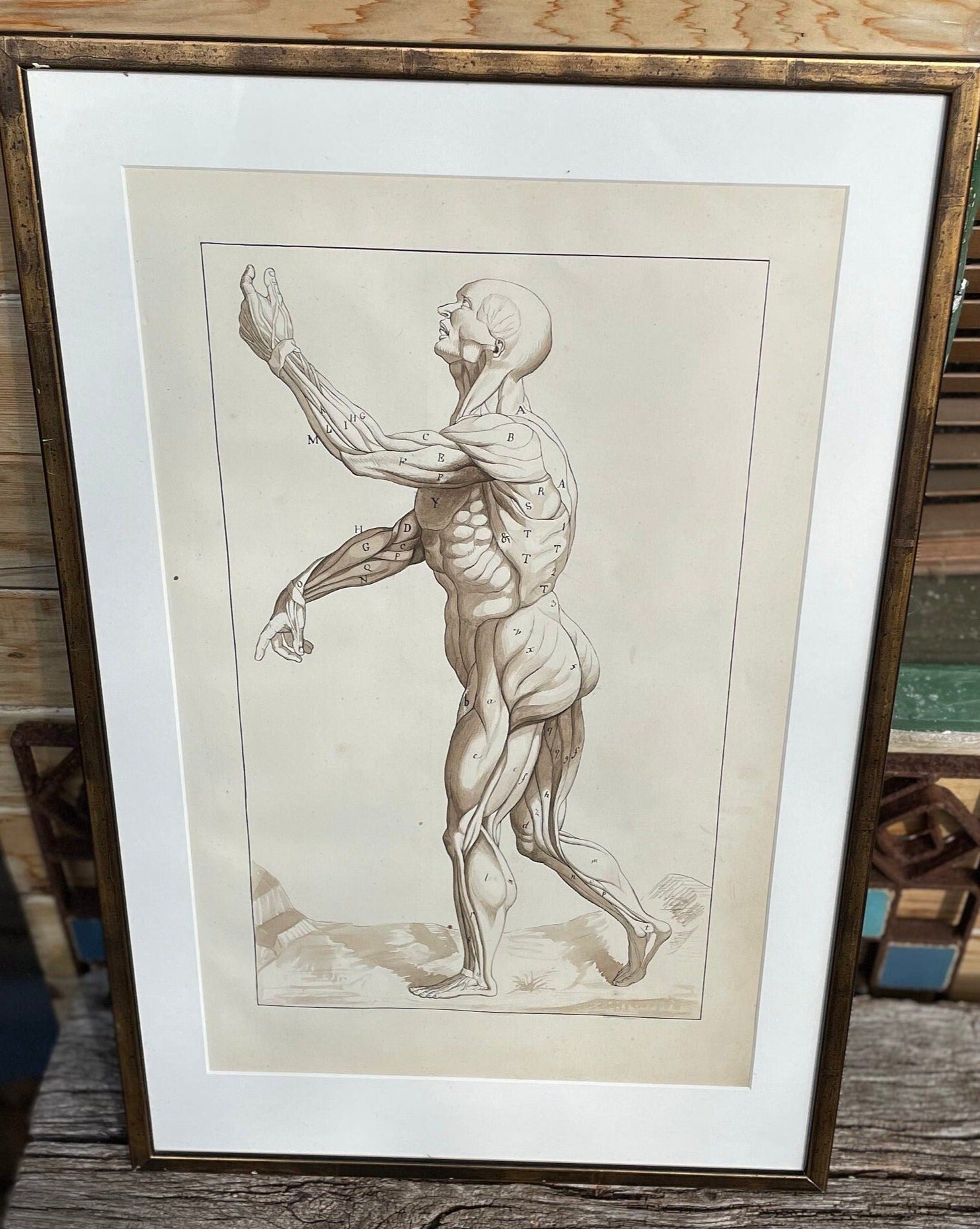 Here we have an original ink and wash on paper human musculature framed print, after Andreas Vesalius plate size 46 x 29cm