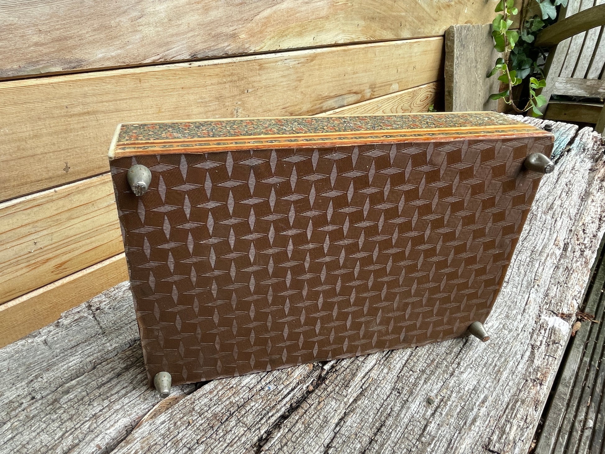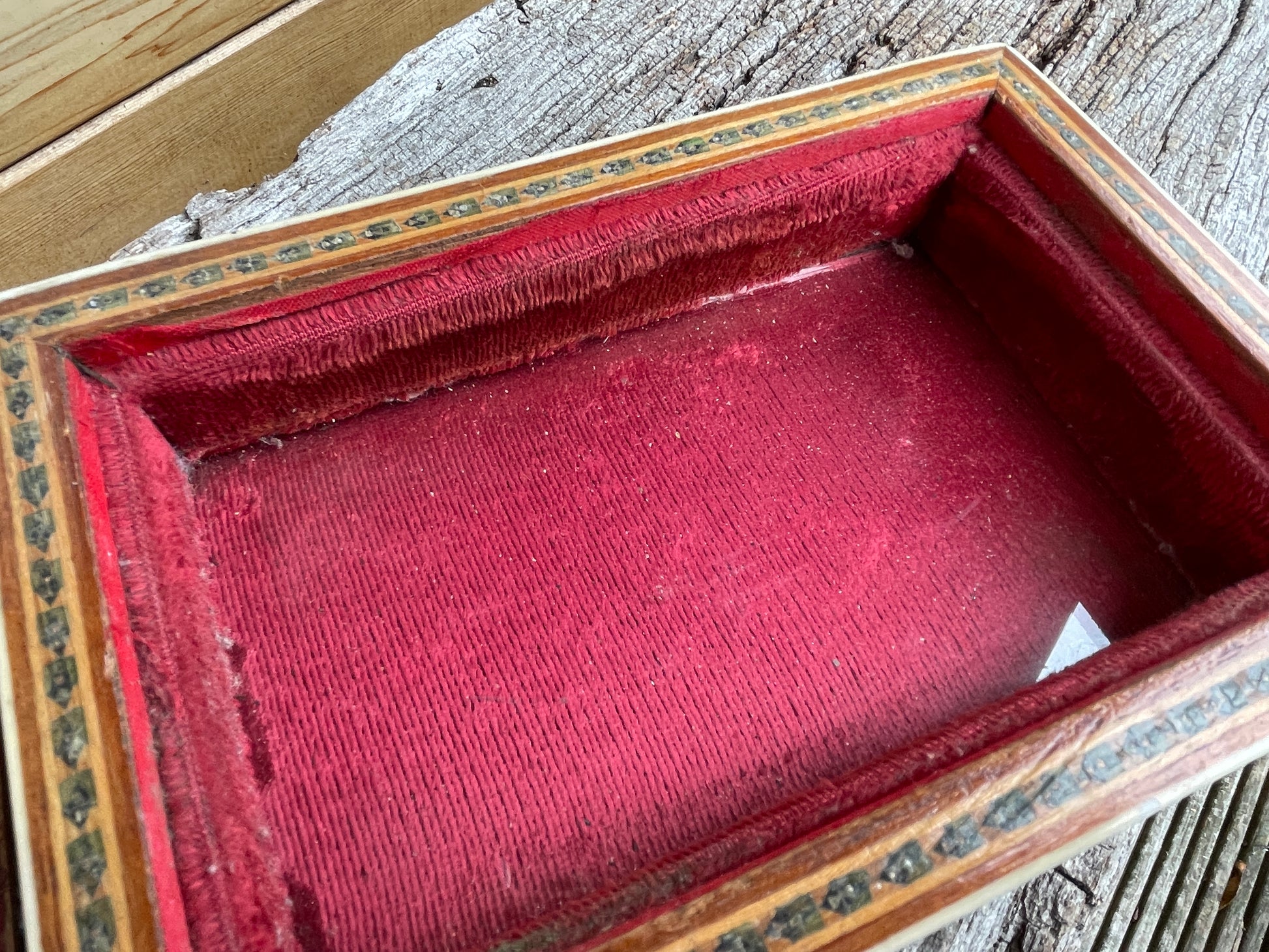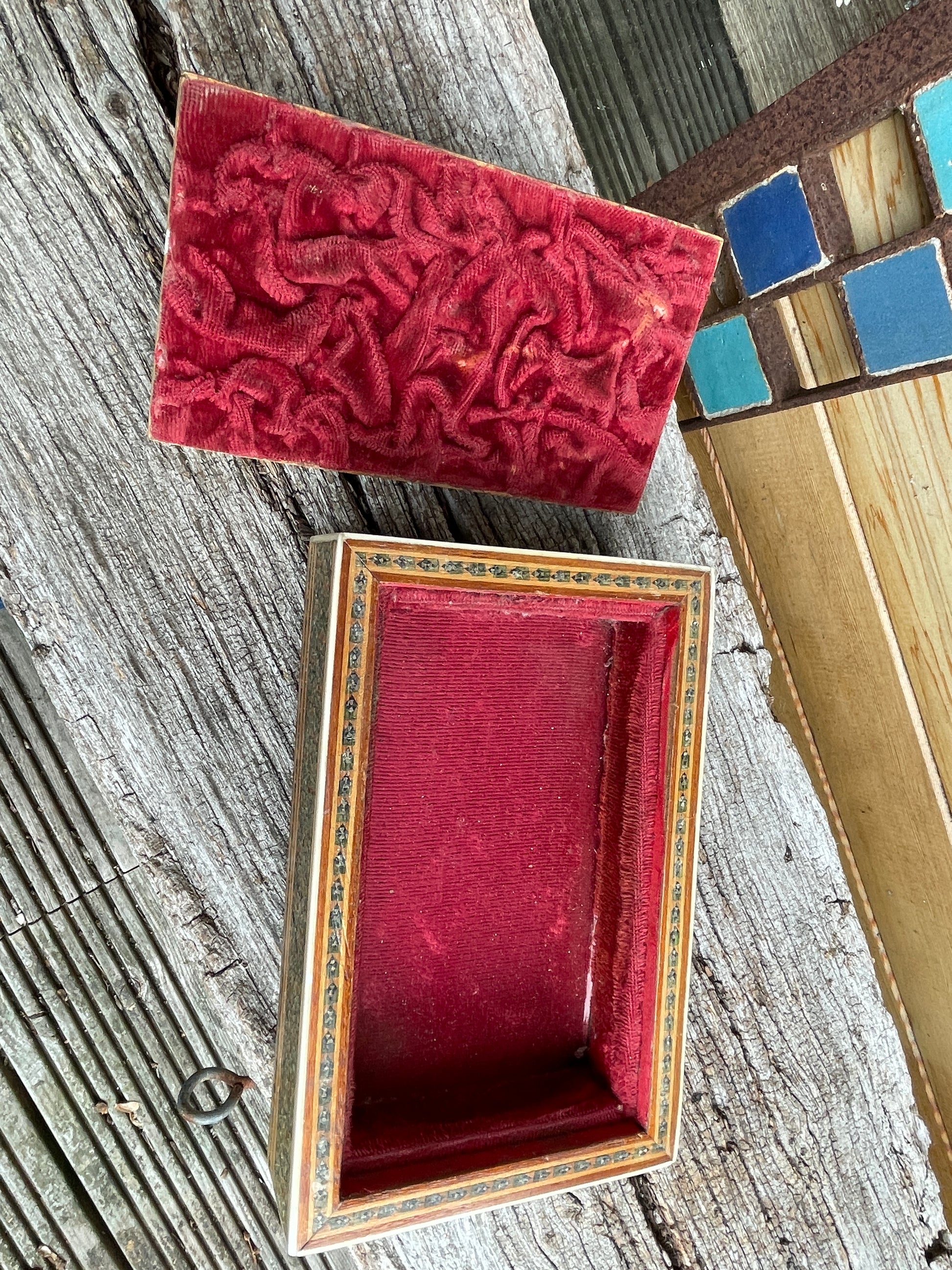 Measuring 17x11x6 cm this jewellery casket is in a used antique condition - the lid has a lovely crackled feel perhaps left in a sunny spot - but gives the box an injection of character
