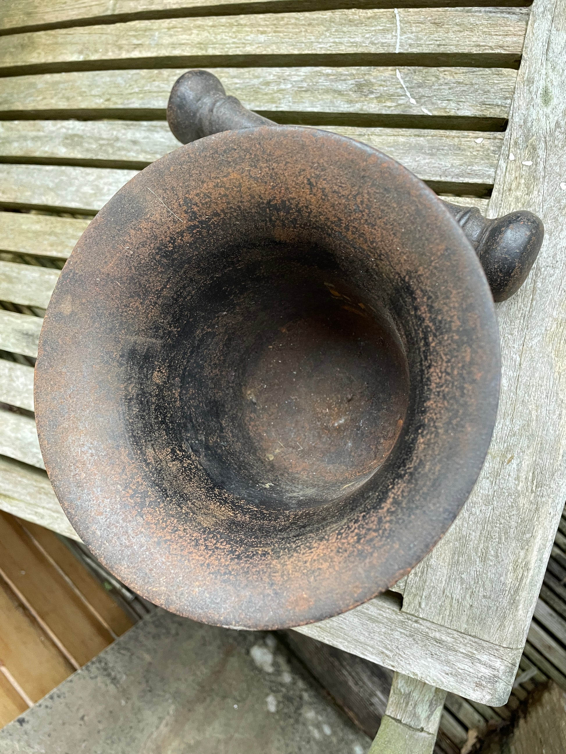 A proper workhorse from an old chemist’s near Barnard Castle, County Durham. This antique cast iron mortar and pestle has the weight and wall thickness you want for serious grinding, with a gently flared rim and a turned foot. It carries an honest industrial patina with a few casting pits and light surface rust from age.