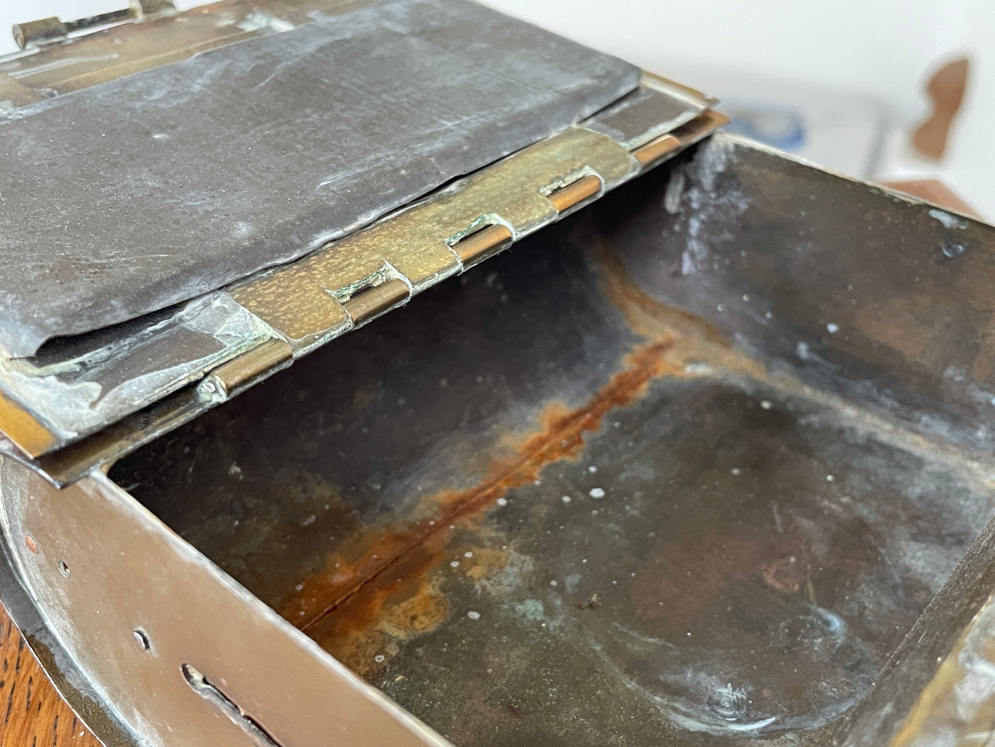 The slot at the top was designed for coins, making this an early example of a savings or penny bank. Its clasped hinged lid opens to reveal a solid brass interior with traces of age and use, adding to its authentic patina. The combination of warm brass and subtle copper tones gives it a distinctive handcrafted feel.