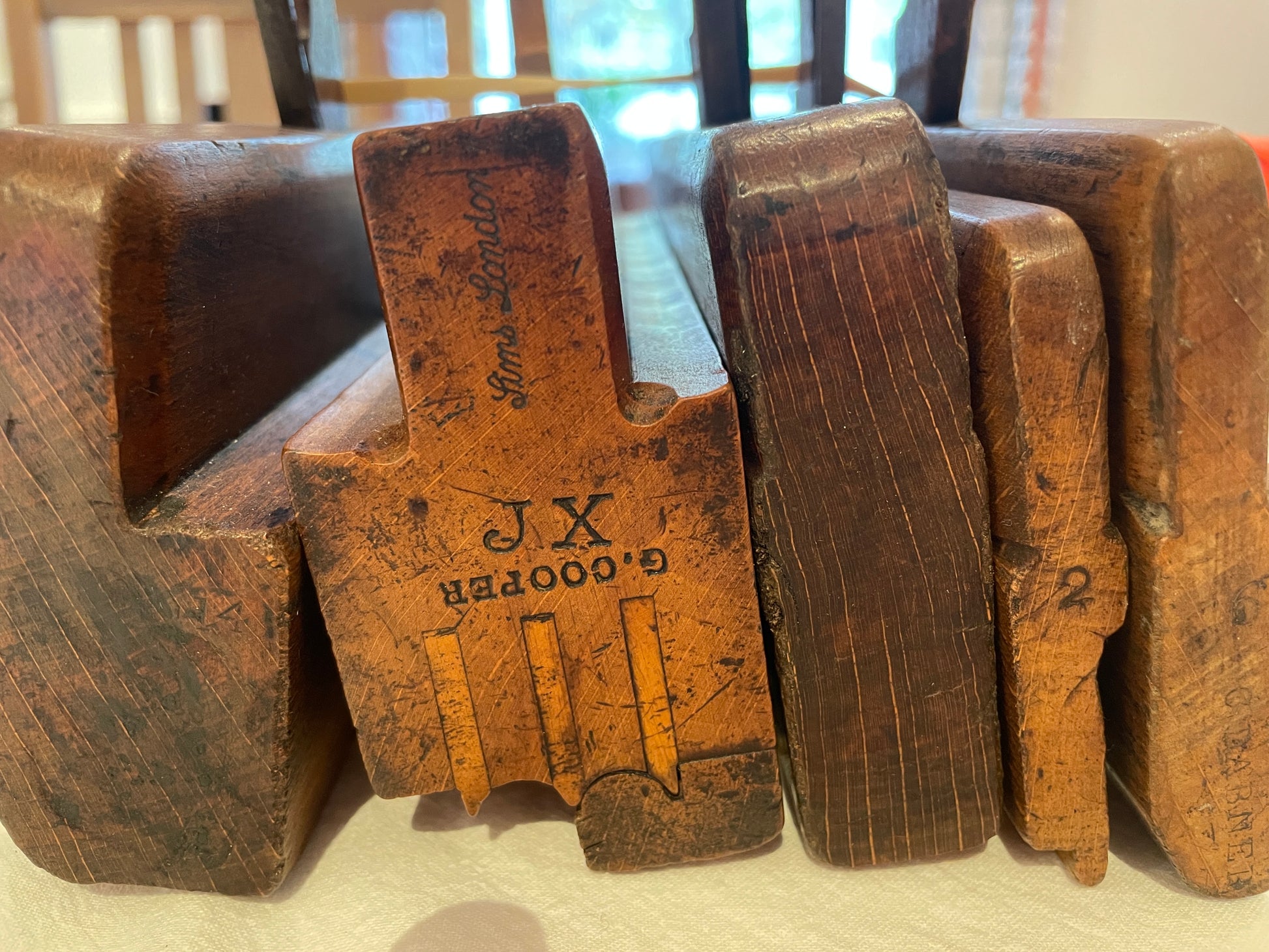 The set includes a variety of traditional profiles used by cabinetmakers and joiners: ovolo and bead planes, a hollow-and-round type, and a more complex moulding profile by G. Cooper with the distinctive JX mark. All are made from dense beech with good colour, tool marks and the patina that develops through long workshop use.
