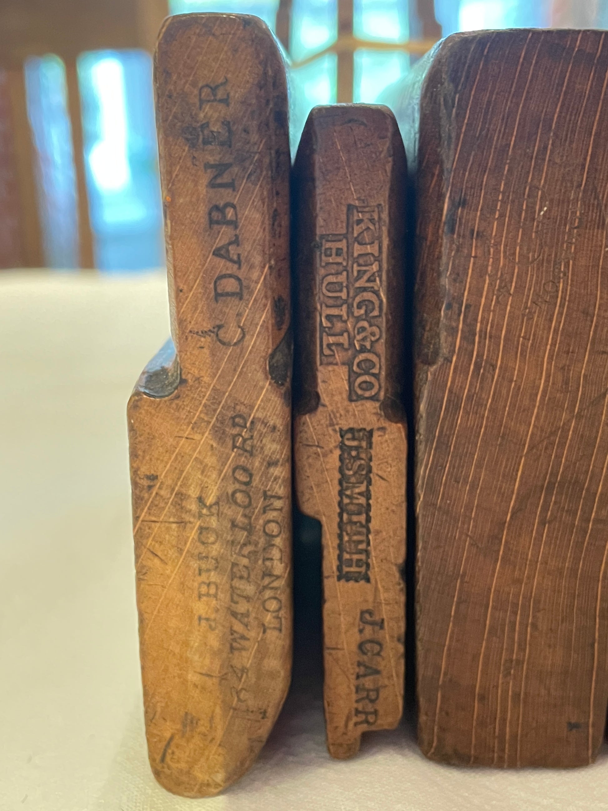 A characterful mixed set of five late Victorian–early 20th-century British beech moulding planes, each bearing a clear maker’s stamp and retaining its original wedge and cutting iron. Makers represented include C. Dabner, J. Buck of London, King & Co of Hull, J. Smith, J. Carr, G. Cooper and Sims London.