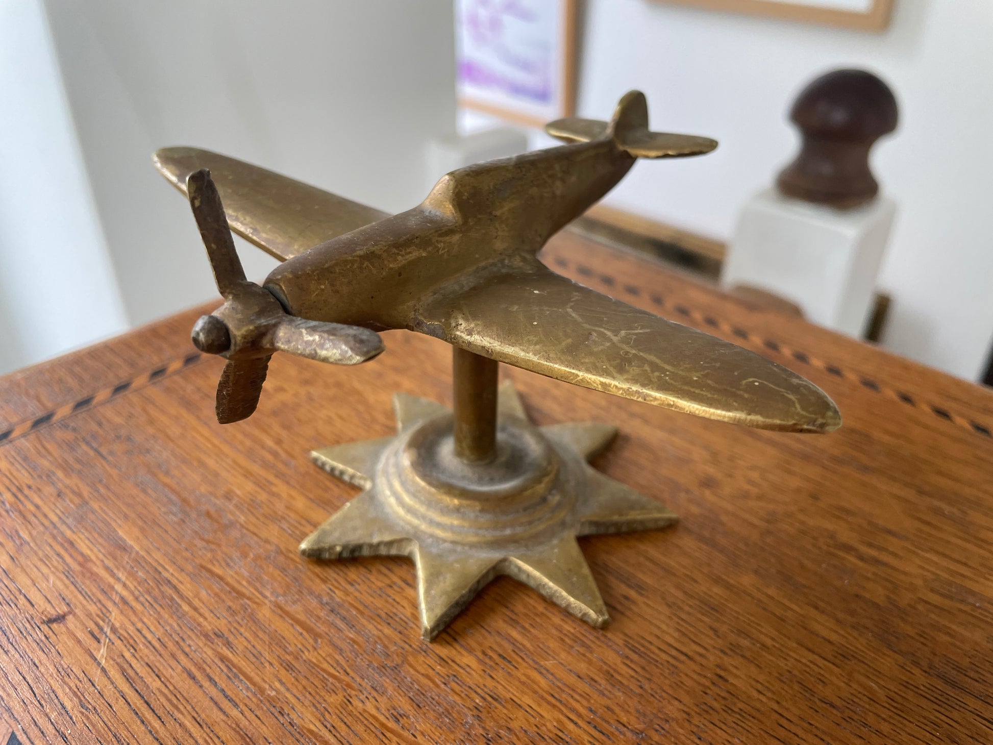 The aircraft is solid cast brass with a lovely mellow, aged patina and a freely turning propeller. A charming, authentic object with the unmistakable silhouette of one of Britain’s most iconic fighter aircraft.