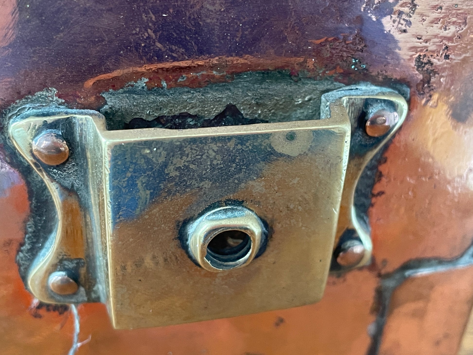 A characterful early 20th-century British copper ship’s lantern, fitted with its original deep-blue curved Fresnel lens and retaining its front brass cartouche stamped “TARBOAR” — a rare mis-struck or phonetic variant of Starboard, found only on a handful of hand-finished maritime lanterns from this era.
