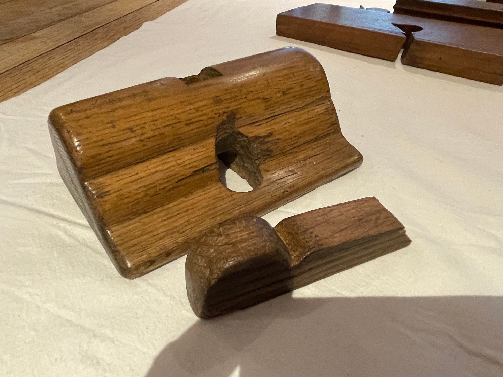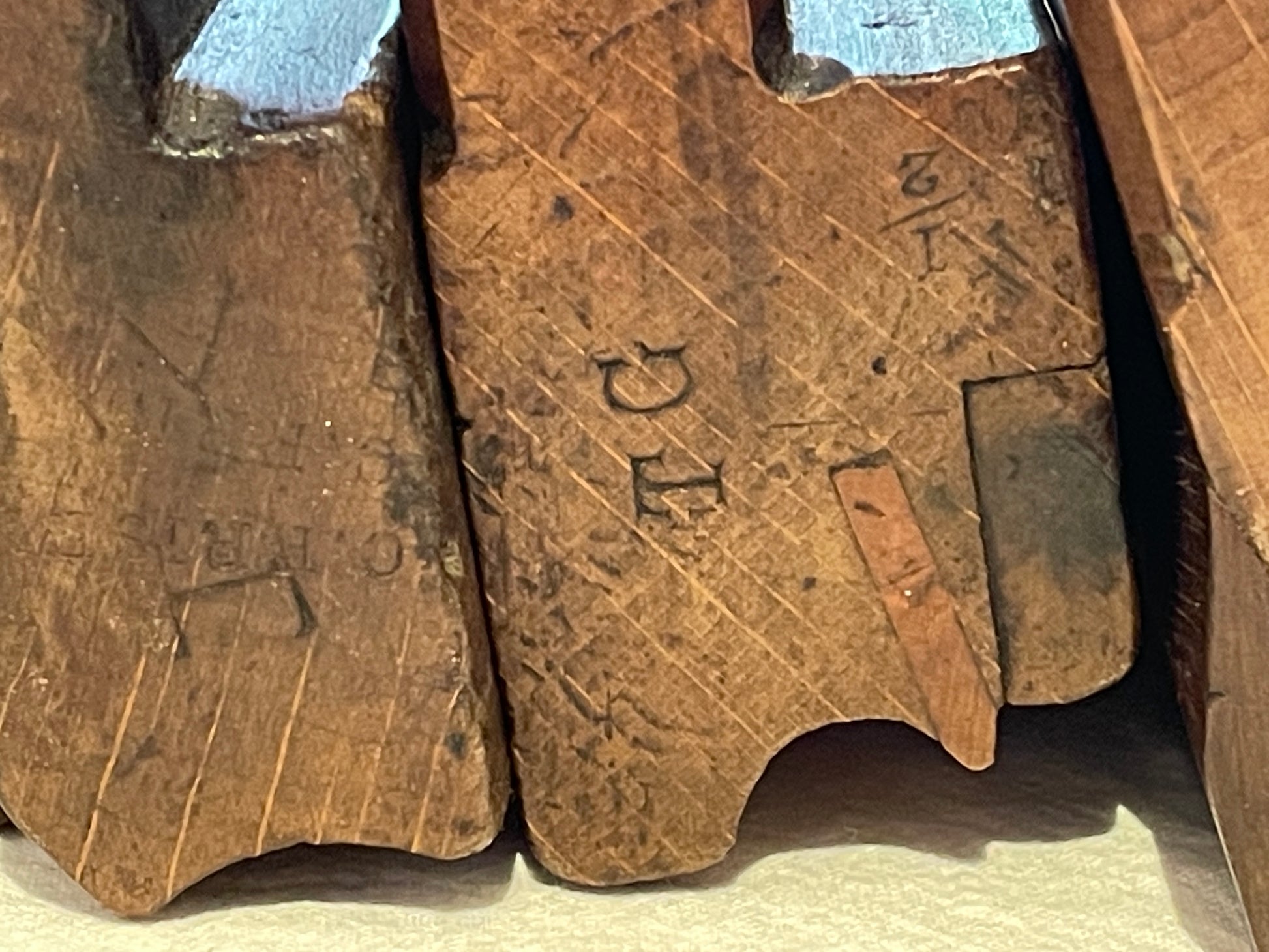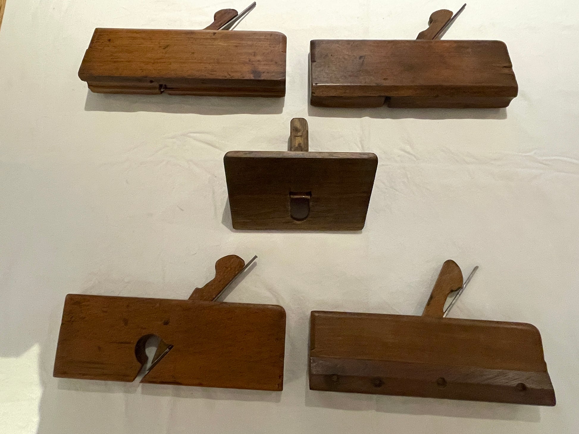 These are genuine working 19th-century tools and display wear appropriate to their age. Surface marks, scratches, minor losses and old repairs are present. One plane has its original wedge broken but retained. Irons show age-related oxidation but remain seated. Sold as a decorative and collectible group.