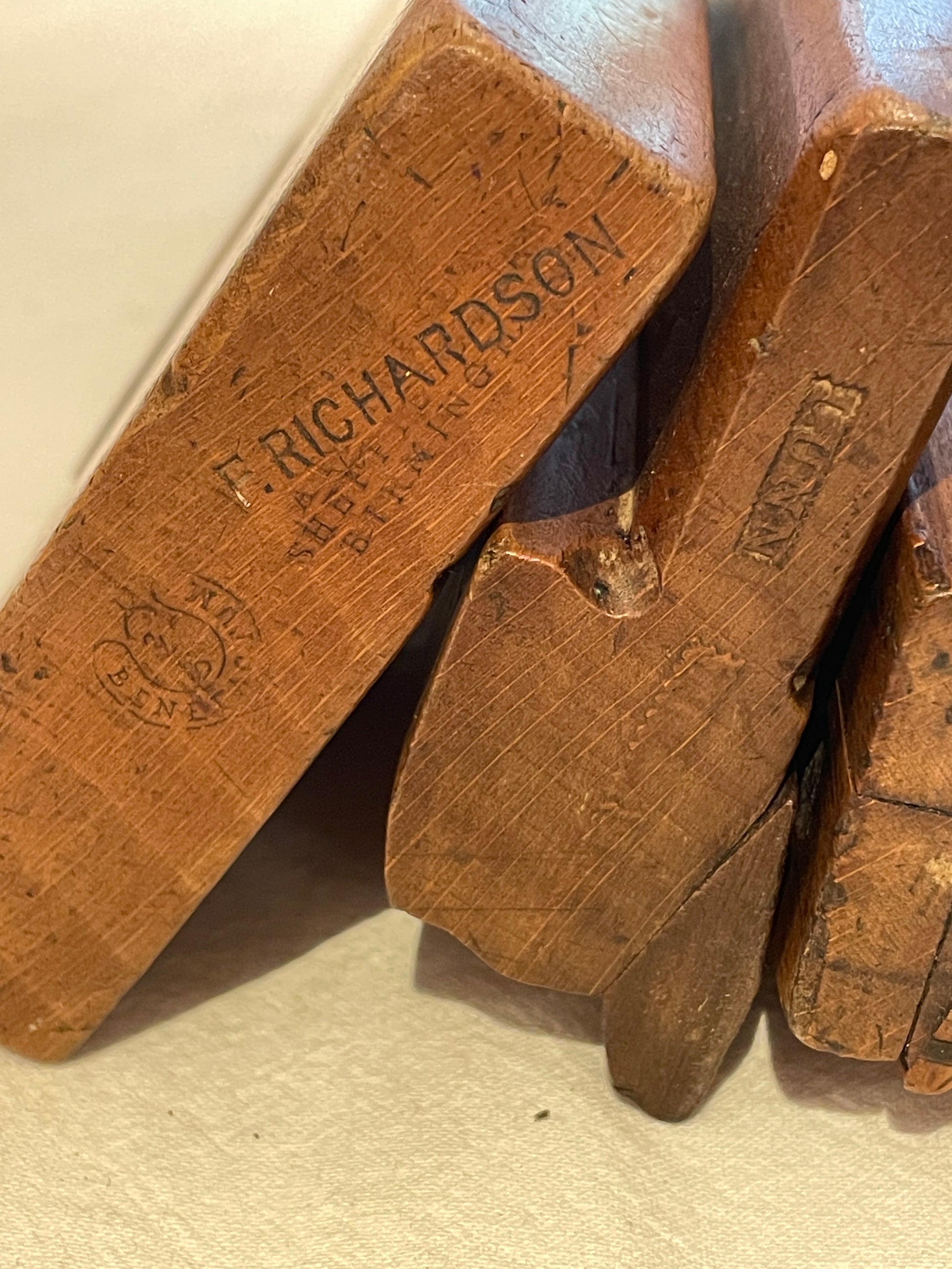 A characterful mixed set of five 19th-century British wooden moulding planes, each with its own profile and maker’s stamp. These came from the same workshop and include a desirable variety of cutting forms, from wide ogees to quirks and bevel combinations. Makers represented include J. Buck (London), W. Richardson (Warrington), and others with clear initials and workshop marks. One example has its original wedge broken but retained, allowing for restoration if desired.