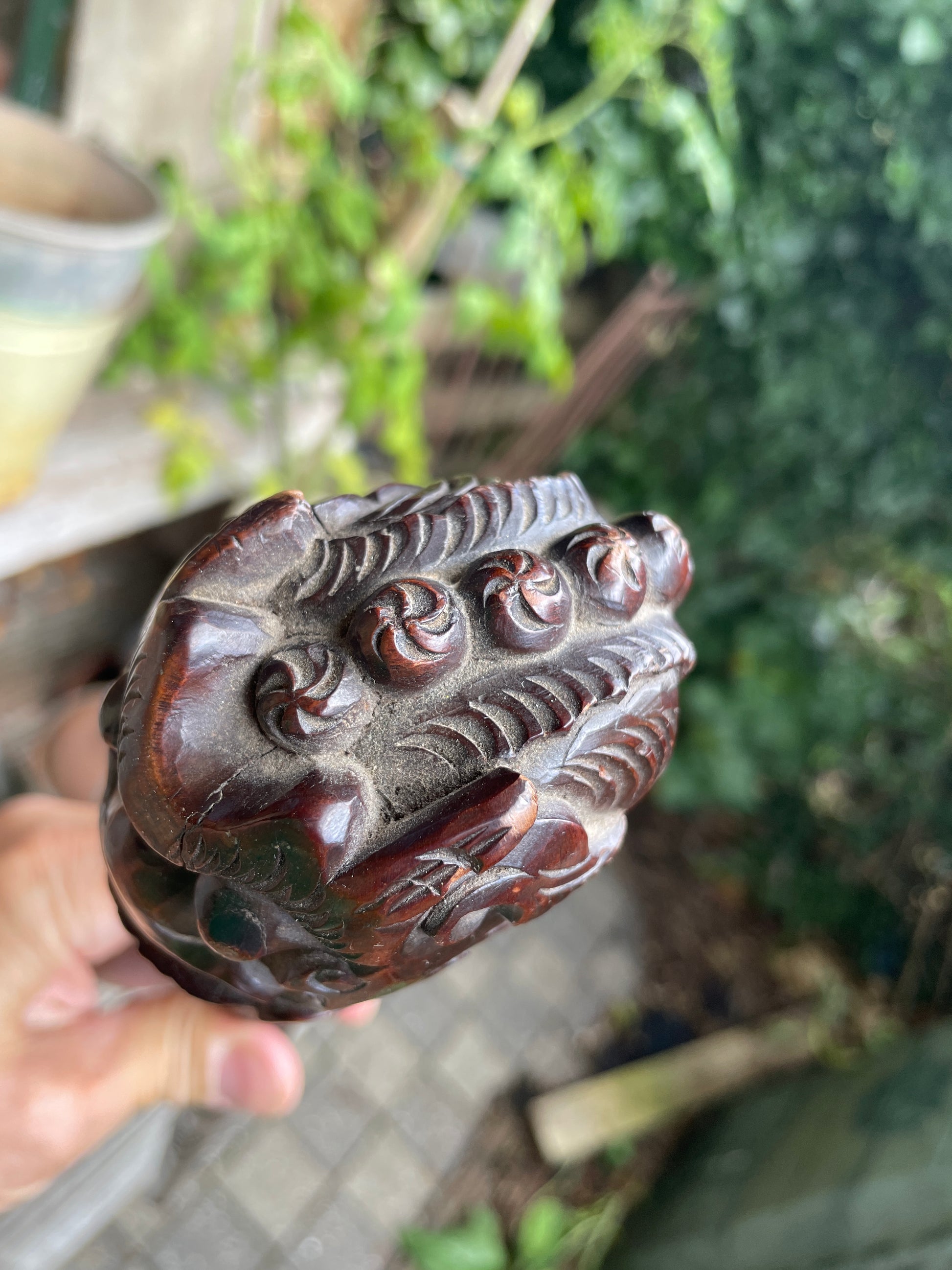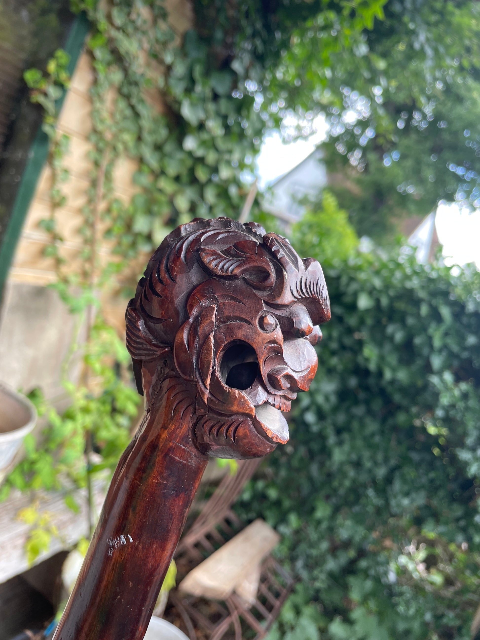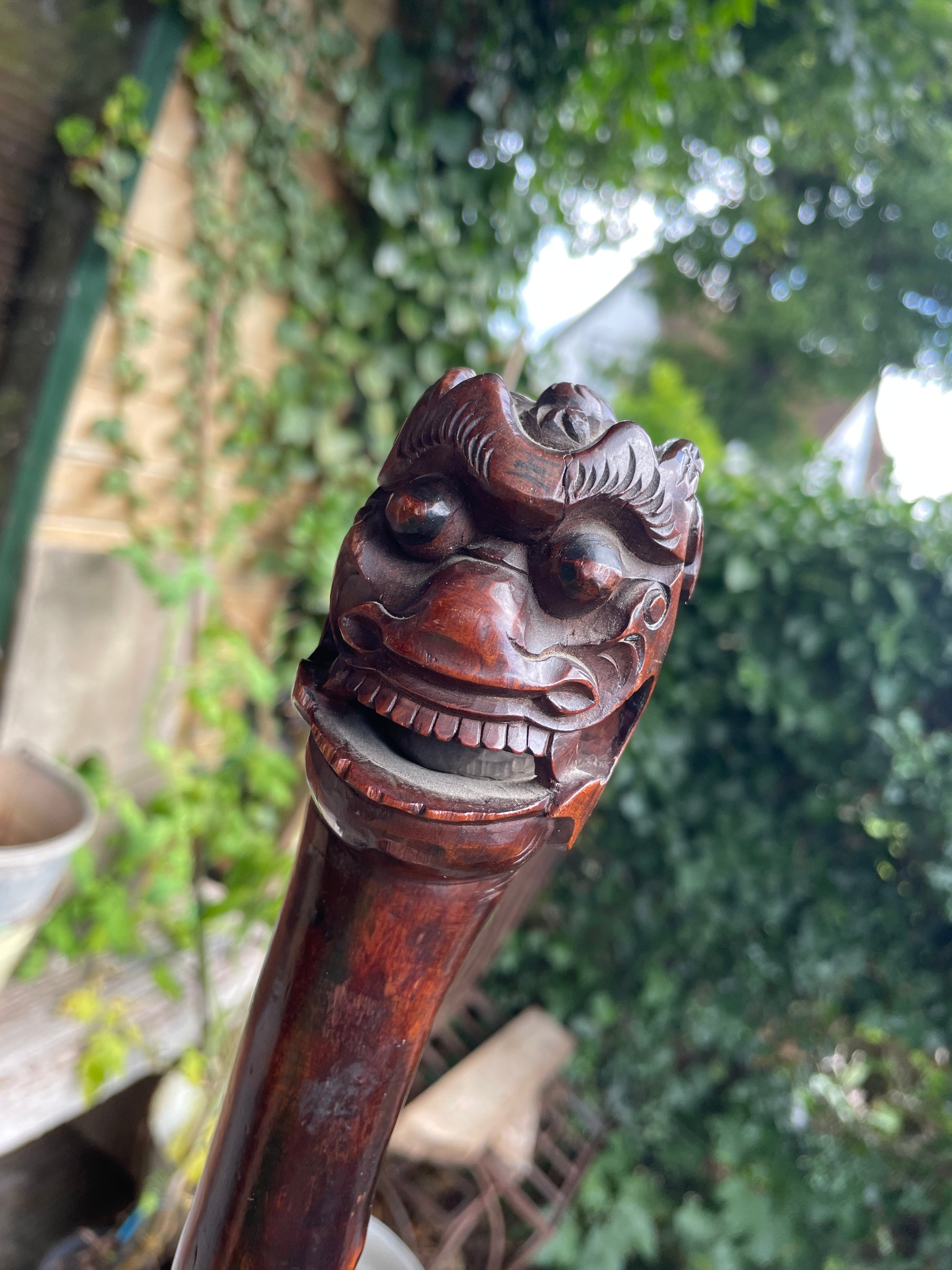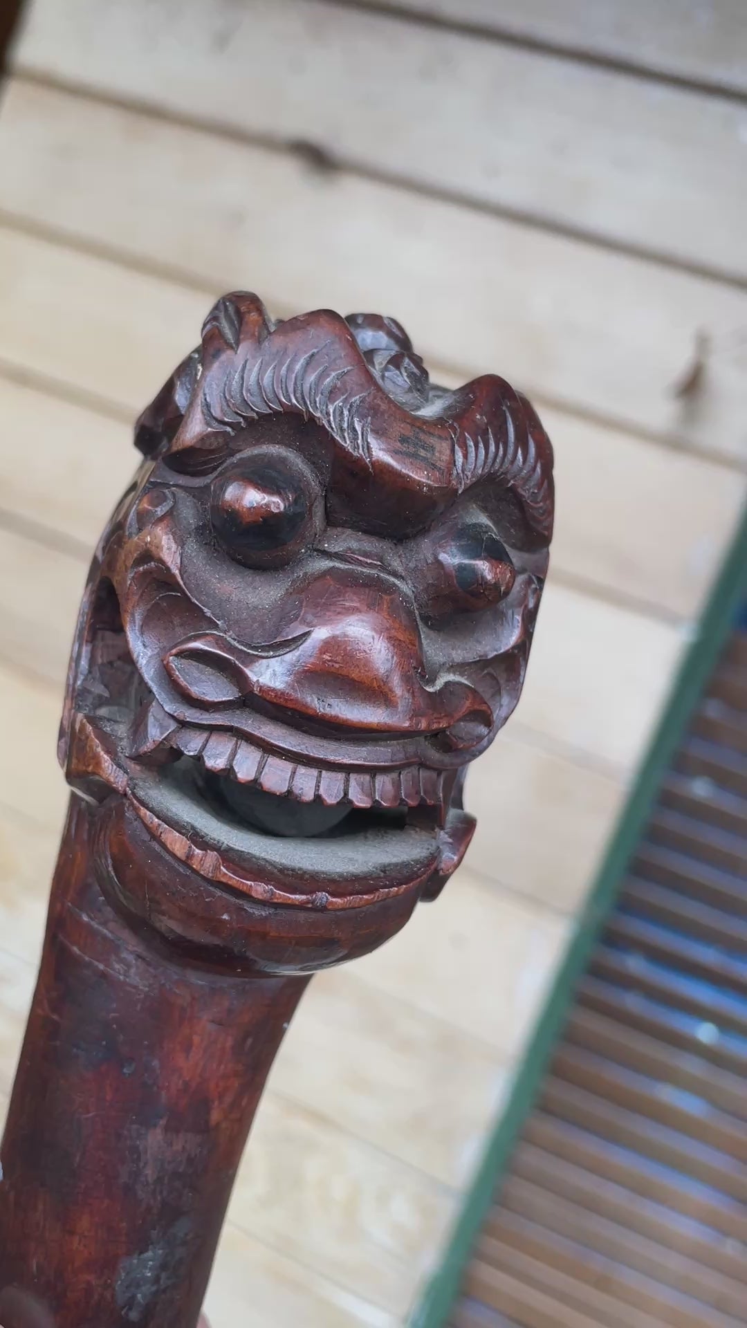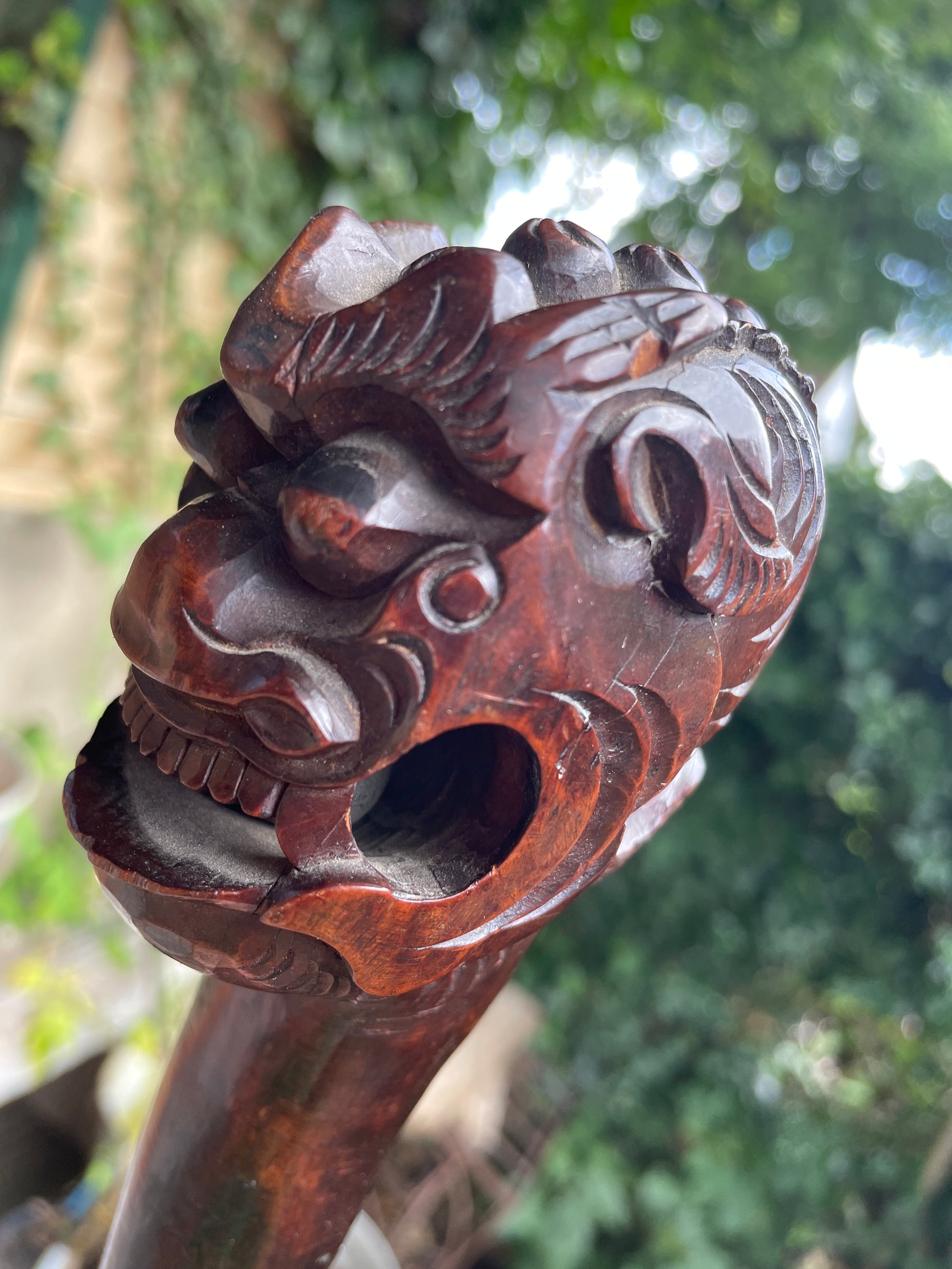 An exceptional 19th-century Chinese hand-carved hardwood walking cane featuring a fierce Foo Dog or dragon head handle — with an extraordinary detail: a free-moving wooden ball carved within its open mouth. Too large to have been inserted post-carving, this intricate “trick ball” demonstrates the immense skill and precision of traditional Chinese artisans, often associated with “devil’s work” or puzzle carvings.