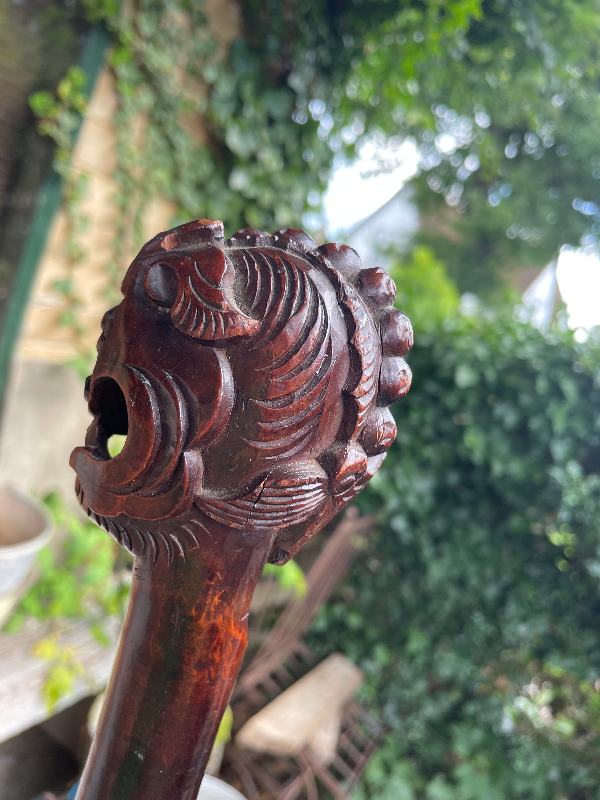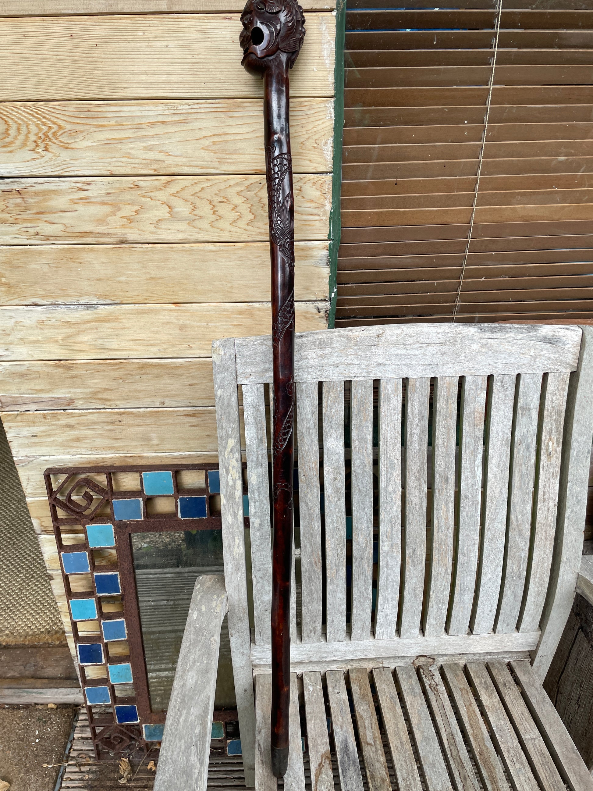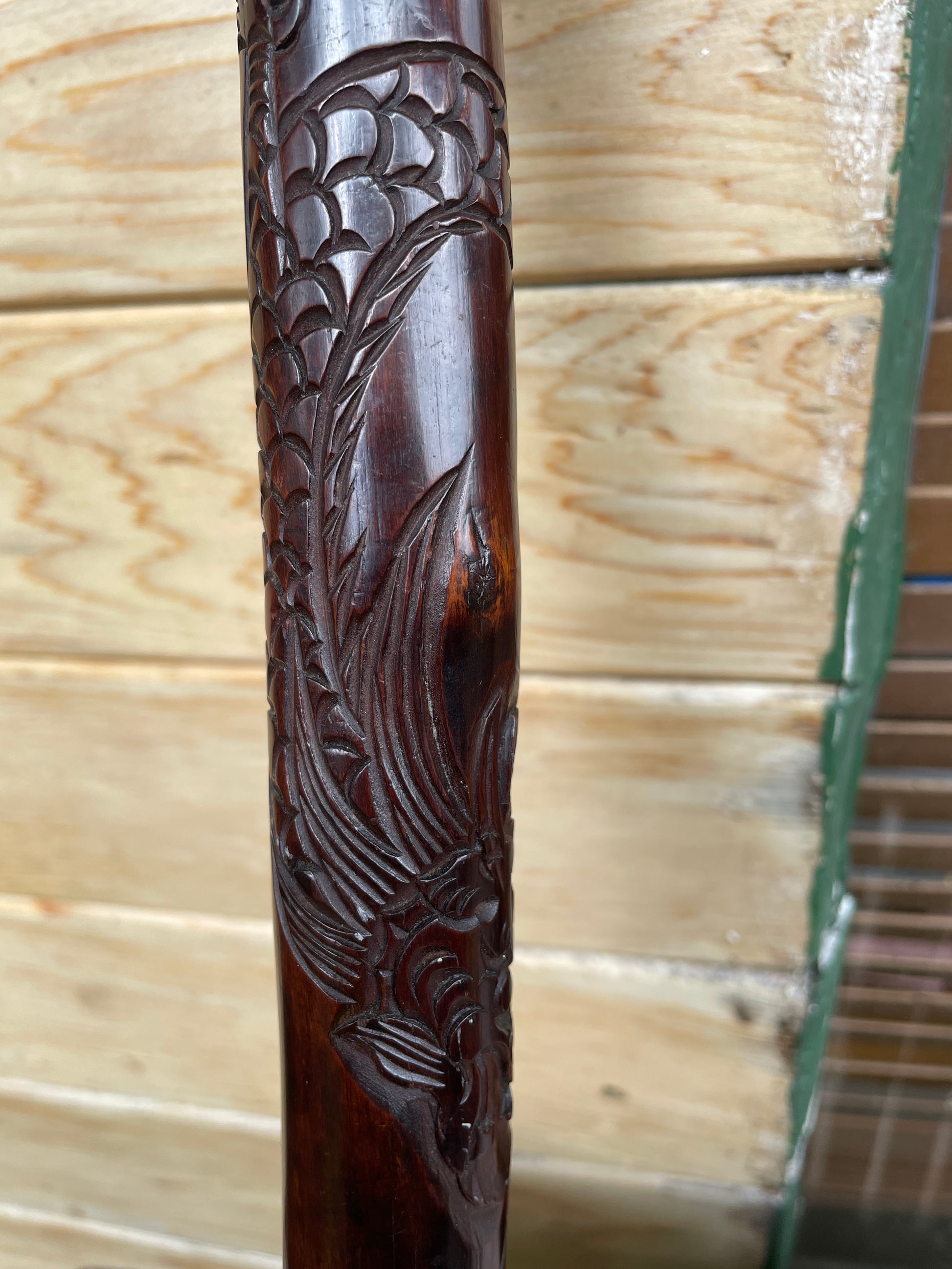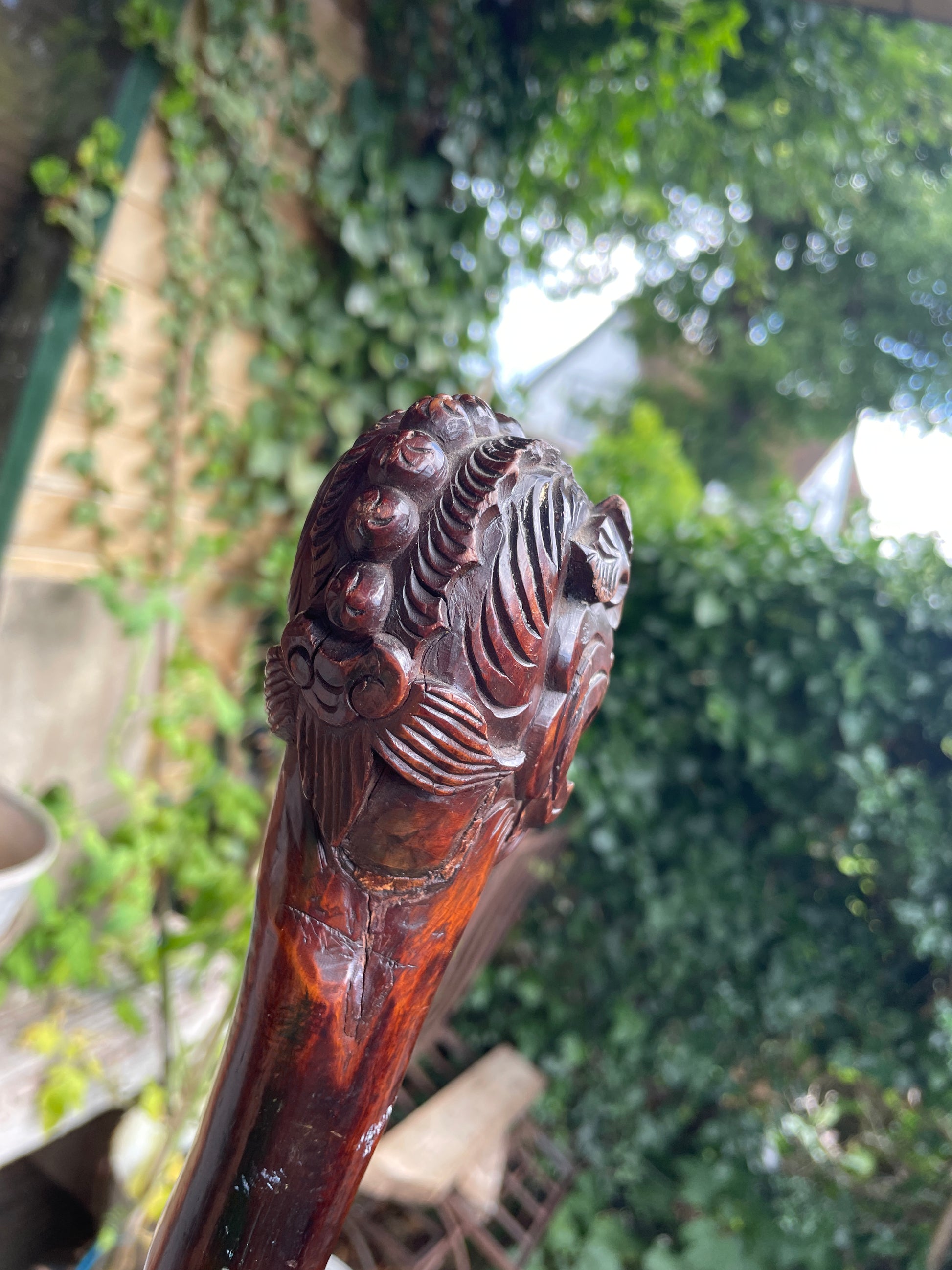 The full-length cane measures approximately 92cm and is carved from richly grained hardwood with a deep reddish-brown patina. Flowing dragon-scale and feather-like designs continue down the shaft, culminating in a traditional metal ferrule.