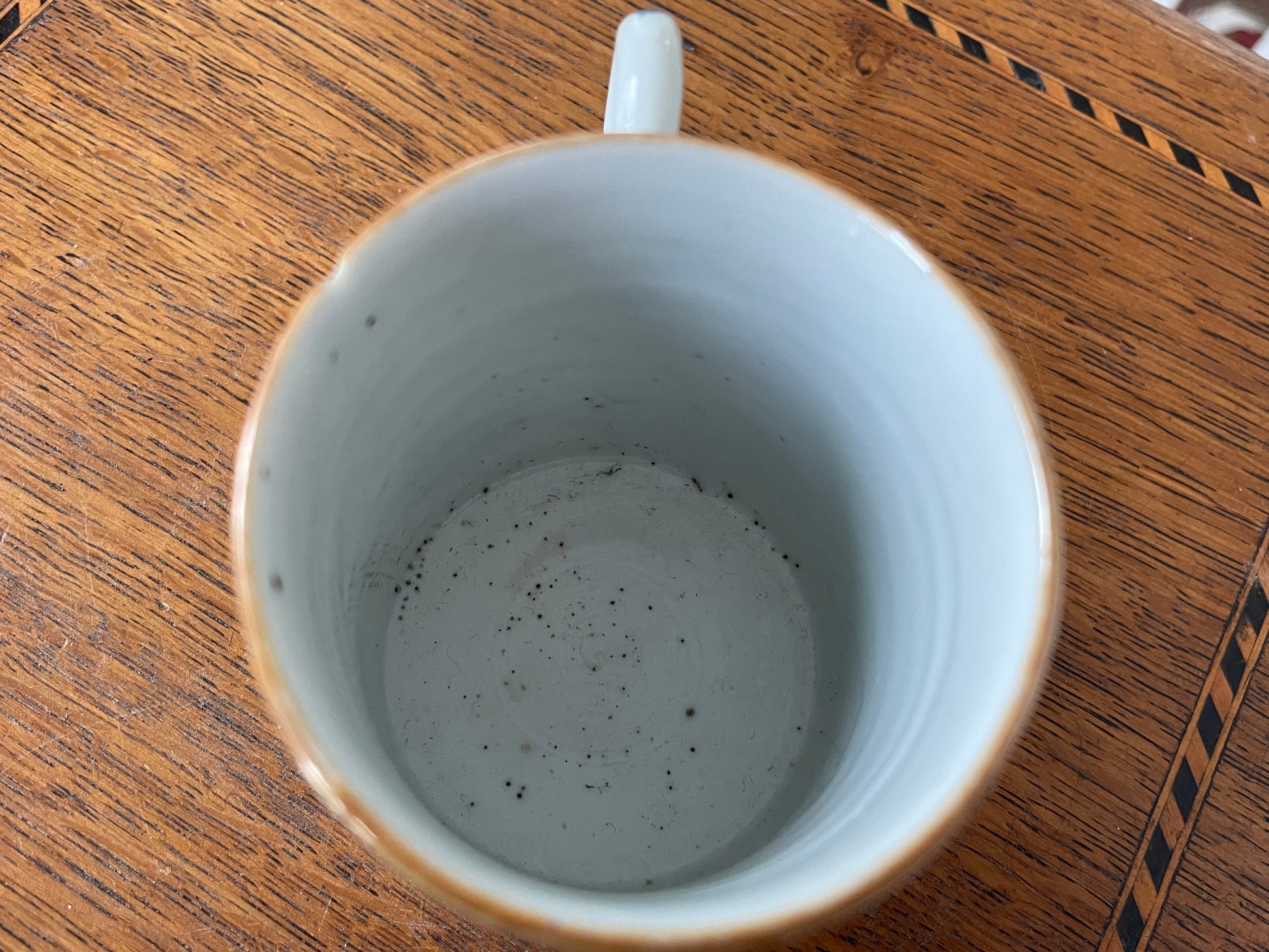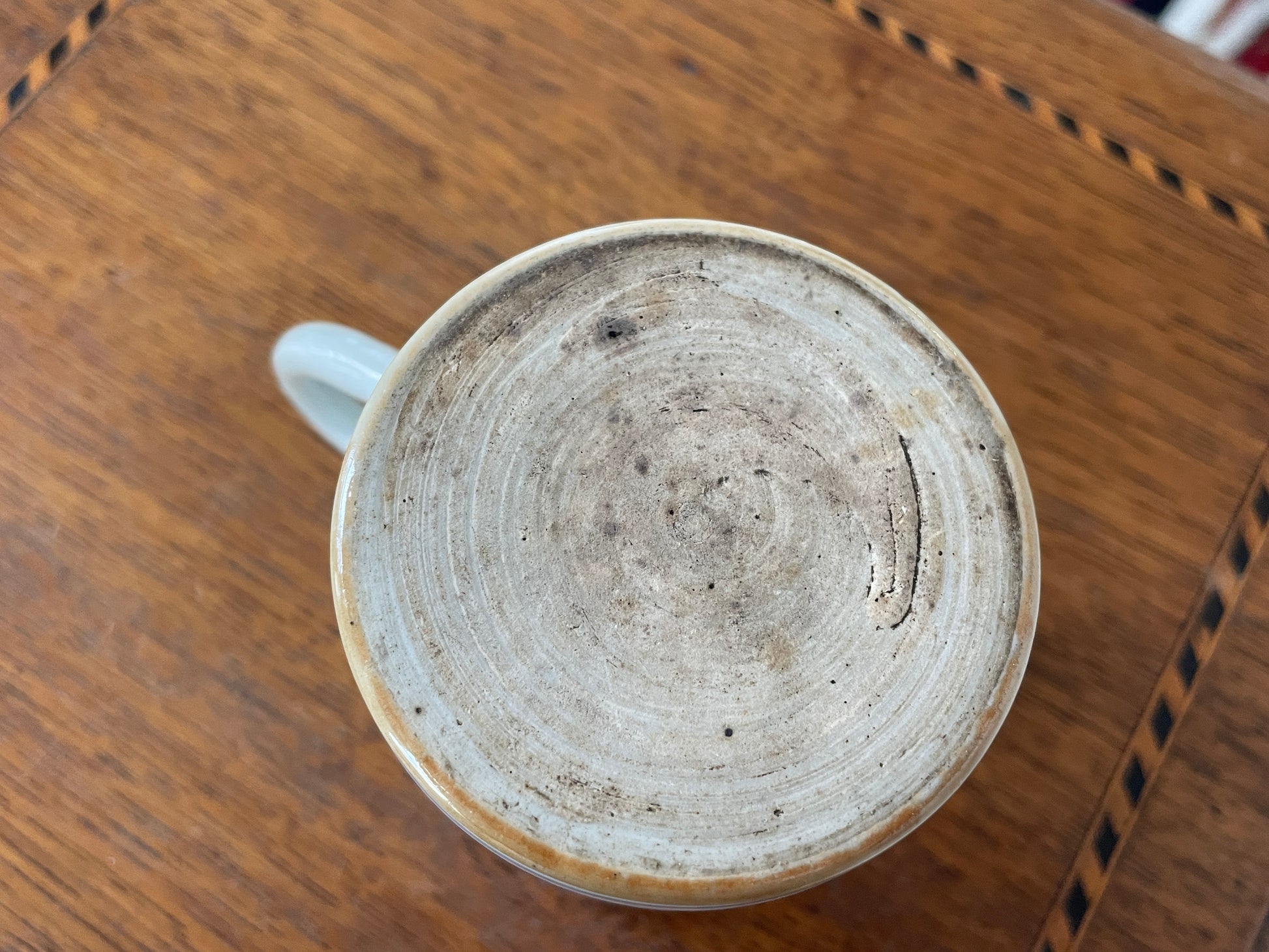 The mug is wheel-thrown with a neatly formed handle and has a smooth pale celadon-toned glaze internally. The base shows expected concentric turning marks and kiln grit from firing. These small mugs were commonly produced for export markets and often used as children’s mugs or for measuring small quantities.