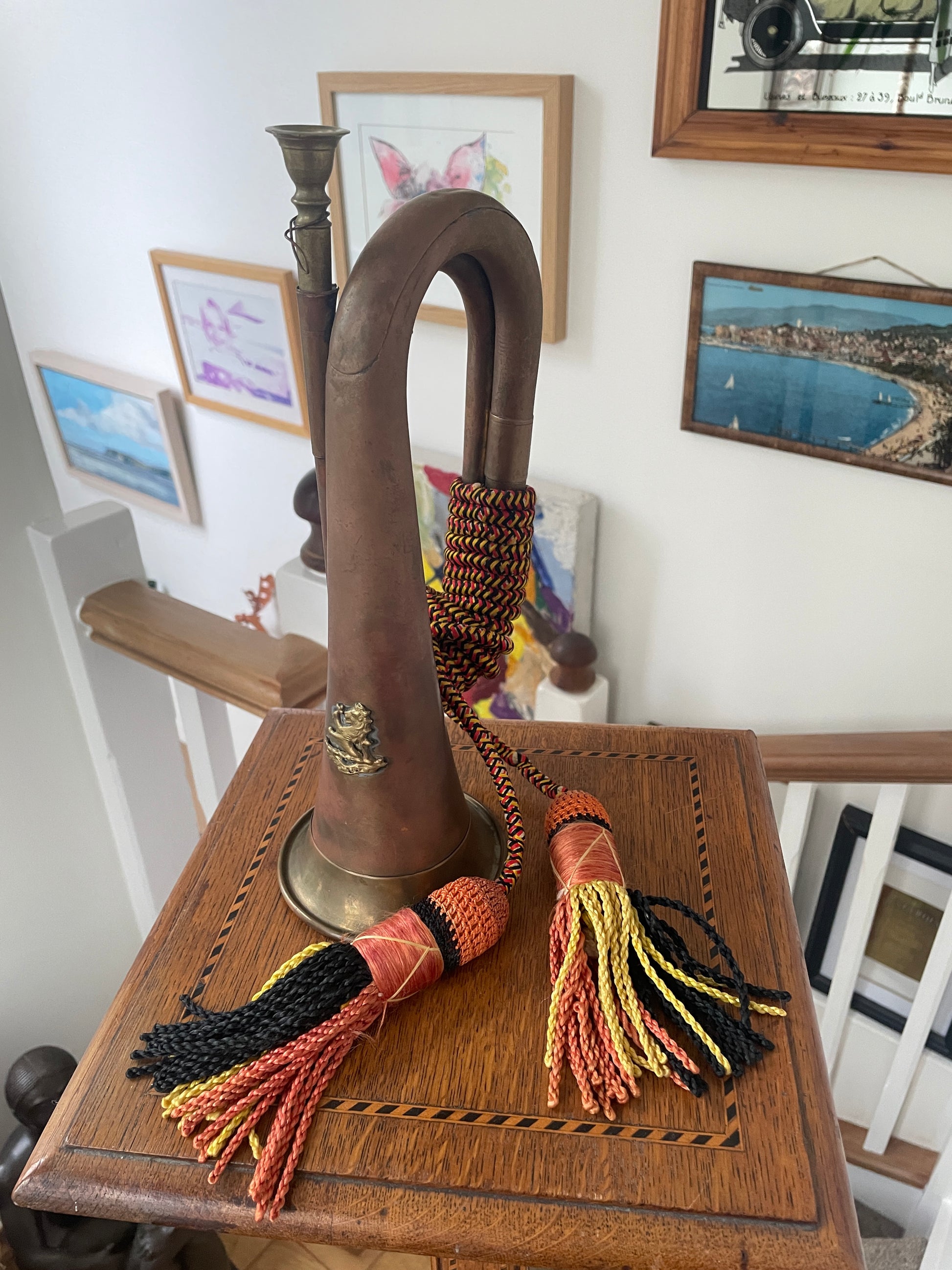 Antique Brass Hunting Horn – Ceremonial Huntsman’s Horn with Braided Cord and Tassels (c.1900–1930)